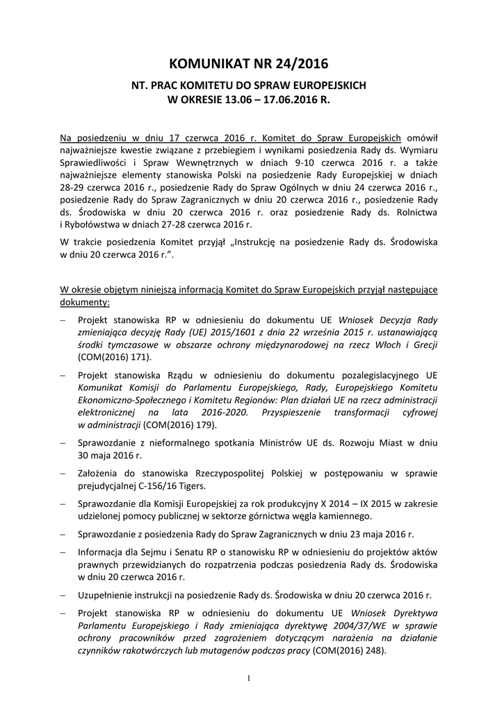 KOMUNIKAT NR 24/2016 NT. PRAC KOMITETU DO SPRAW EUROPEJSKICH W OKRESIE 13.06 – 17.06.2016 R. Na posiedzeniu w dniu 17 czerwca 2016 r. Komitet do Spraw Europejskich omówił najważniejsze kwestie związane z przebiegiem i wynikami posiedzenia Rady ds. Wymiaru Sprawiedliwości i Spraw Wewnętrznych w dniach 9-10 czerwca 2016 r. a także najważniejsze elementy stanowiska Polski na posiedzenie Rady Europejskiej w dniach 28-29 czerwca 2016 r., posiedzenie Rady do Spraw Ogólnych w dniu 24 czerwca 2016 r., posiedzenie Rady do Spraw Zagranicznych w dniu 20 czerwca 2016 r., posiedzenie Rady ds. Środowiska w dniu 20 czerwca 2016 r. oraz posiedzenie Rady ds. Rolnictwa i Rybołówstwa w dniach 27-28 czerwca 2016 r. W trakcie posiedzenia Komitet przyjął „Instrukcję na posiedzenie Rady ds. Środowiska w dniu 20 czerwca 2016 r.”. W okresie objętym niniejszą informacją Komitet do Spraw Europejskich przyjął następujące dokumenty: Projekt stanowiska RP w odniesieniu do dokumentu UE Wniosek Decyzja Rady zmieniająca decyzję Rady (UE) 2015/1601 z dnia 22 września 2015 r. ustanawiającą środki tymczasowe w obszarze ochrony międzynarodowej na rzecz Włoch i Grecji (COM(2016) 171). Projekt stanowiska Rządu w odniesieniu do dokumentu pozalegislacyjnego UE Komunikat Komisji do Parlamentu Europejskiego, Rady, Europejskiego Komitetu Ekonomiczno-Społecznego i Komitetu Regionów: Plan działań UE na rzecz administracji elektronicznej na lata 2016-2020. Przyspieszenie transformacji cyfrowej w administracji (COM(2016) 179). Sprawozdanie z nieformalnego spotkania Ministrów UE ds. Rozwoju Miast w dniu 30 maja 2016 r. Założenia do stanowiska Rzeczypospolitej Polskiej w postępowaniu w sprawie prejudycjalnej C-156/16 Tigers. Sprawozdanie dla Komisji Europejskiej za rok produkcyjny X 2014 – IX 2015 w zakresie udzielonej pomocy publicznej w sektorze górnictwa węgla kamiennego. Sprawozdanie z posiedzenia Rady do Spraw Zagranicznych w dniu 23 maja 2016 r. Informacja dla Sejmu i Senatu RP o stanowisku RP w odniesieniu do projektów aktów prawnych przewidzianych do rozpatrzenia podczas posiedzenia Rady ds. Środowiska w dniu 20 czerwca 2016 r. Uzupełnienie instrukcji na posiedzenie Rady ds. Środowiska w dniu 20 czerwca 2016 r. Projekt stanowiska RP w odniesieniu do dokumentu UE Wniosek Dyrektywa Parlamentu Europejskiego i Rady zmieniająca dyrektywę 2004/37/WE w sprawie ochrony pracowników przed zagrożeniem dotyczącym narażenia na działanie czynników rakotwórczych lub mutagenów podczas pracy (COM(2016) 248). 1 Raport umożliwiający obliczenie wielkości przyznanej emisji na drugi okres zobowiązań. Gospodarka o obiegu zamkniętym szansą na zrównoważony rozwój terenów niezurbanizowanych. Nota delegacji polskiej na Radę ENVI 20 czerwca 2016 r. Non-paper Polski ws. krajowych uwarunkowań w świetle przeglądu systemu EU ETS. Informacja dla Sejmu i Senatu RP o stanowisku RP w odniesieniu do projektów aktów prawnych przewidzianych do rozpatrzenia podczas posiedzenia Rady ds. Zatrudnienia, Polityki Społecznej, Zdrowia i Spraw Konsumenckich w dniu 17 czerwca 2016 r. (sesja dot. zdrowia). Sprawozdanie z posiedzenia Rady ds. Konkurencyjności w dniach 26 - 27 maja 2016 r. Sprawozdanie z posiedzenia Rady do Spraw Zagranicznych w formacie Ministrów UE ds. Rozwoju w dniu 12 maja 2016 r. Sprawozdanie z posiedzenia Komitetu Stałych Przedstawicieli COREPER II w dniu 8 czerwca 2016 r. Sprawozdanie z posiedzenia Komitetu Stałych Przedstawicieli COREPER I w dniu 8 czerwca 2016 r. Projekt stanowiska RP w odniesieniu do dokumentu UE Wniosek Rozporządzenie Parlamentu Europejskiego i Rady zastępujące wykazy postępowań upadłościowych oraz zarządców zamieszczone w załącznikach A i B do rozporządzenia (UE) 2015/848 w sprawie postępowania upadłościowego (COM(2016) 317). Projekt stanowiska RP w odniesieniu do dokumentu UE Wniosek Rozporządzenie Parlamentu Europejskiego i Rady w sprawie transgranicznych usług doręczania paczek (COM(2016) 285). Informacja w sprawie przedłużenia okresu oddelegowania przedstawicielom Ministerstwa Spraw Zagranicznych na stanowiskach ekspertów narodowych w misji EUMM w Gruzji. Wyniki monitorowania pomocy publicznej udzielonej spółkom motoryzacyjnym prowadzącym działalność gospodarczą na terenie specjalnych stref ekonomicznych. Lista osób uprawnionych do konta dostępowego w systemie Extranet-L Rady. Raport z przebiegu realizacji polityki morskiej Rzeczypospolitej Polskiej w 2015 r. Instrukcja na posiedzenie Rady ds. Zatrudnienia, Polityki Społecznej, Zdrowia i Spraw Konsumenckich w dniu 16 czerwca 2016 r. (sesja dot. zatrudnienia i polityki społecznej). Informacja w sprawie zmian instytucji i przedstawicieli Polski w komitetach i grupach eksperckich Komisji Europejskiej zgłoszonych w aktualizacji miesięcznej – maj 2016 r. Informacja w sprawie zmian przedstawicieli Polski w Zarządzie Europejskich Służb Zatrudnienia w Komisji Europejskiej. Informacja w sprawie zmian przedstawicieli Polski w komitetach i grupach eksperckich agencji UE zgłoszonych w aktualizacji miesięcznej – maj 2016 r. Informacja w sprawie zmiany przedstawiciela Polski w grupie roboczej Komisji Europejskiej ds. wydobycia ropy naftowej gazu ziemnego ze złóż podmorskich. 2 Instrukcja na posiedzenie Rady ds. Gospodarczych i Finansowych w dniu 17 czerwca 2016 r. Instrukcja na posiedzenie Komitetu Stałych Przedstawicieli COREPER I w dniu 15 czerwca 2016 r. wraz z uzupełnieniem. Instrukcja na posiedzenie Komitetu Stałych Przedstawicieli COREPER II w dniu 15 czerwca 2016 r. wraz z uzupełnieniem. Instrukcja na posiedzenie Rady ds. Zatrudnienia, Polityki Społecznej, Zdrowia i Spraw Konsumenckich w dniu 17 czerwca 2016 r. (sesja dot. zdrowia). Informacja nt. stanu wdrażania projektów realizowanych w ramach bezzwrotnej pomocy zagranicznej państw EFTA. Sprawozdanie z posiedzenia Rady ds. Transportu, Telekomunikacji i Energii w dniu 26 maja 2016 r. (sesja dot. te