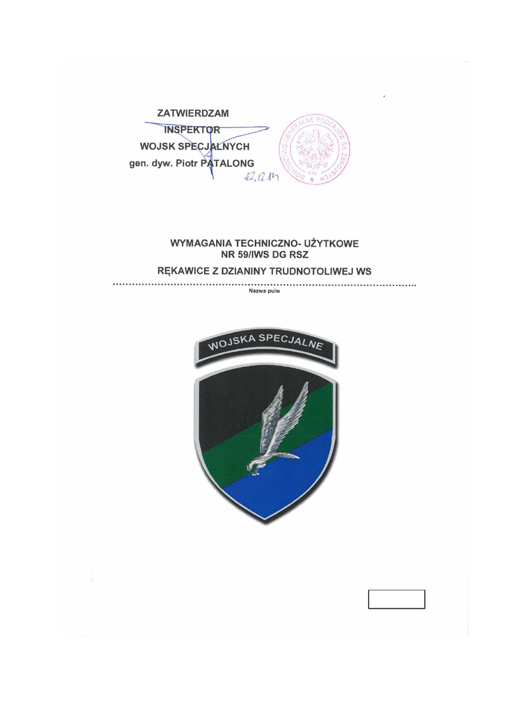 Strona 1 z 8 1. RYSUNEK MODELOWY/ZDJĘCIE. 2. OPIS OGÓLNY WYROBU Rękawice z dzianiny trudnotopliwej przeznaczone są do użytkowania przez żołnierzy w okresie letnim, zarówno w klimacie umiarkowanym, jak również w warunkach tropikalnych i zwrotnikowych. Rękawice dopasowane są do dłoni Strona 2 z 8 użytkownika, nie ograniczając jego zdolności manualnych chronią dłonie przed oparzeniami od metalowych elementów broni palnej. 3. WYMAGANIA TECHNICZNE. 3.1 Wykaz materiałów zasadniczych i dodatków Lp. Nazwa materiału 1 Dzianina, trudnotopliwa o parametrach zawartych w pkt 3.2 kolor Czarny 2 Skóra rękawiczkowa kozia, hydrofobowa, trudnotopliwa, kolor czarny o parametrach zawartych w pkt 3.3 3 Dzianina powlekana trudnotopliwa o parametrach zawartych w pkt 3.4 4 Nici trudnopalne w kolorze czarnym 120 dtx x 2 5 Pianka amortyzująca grubości 3-5 mm 6 Taśma elastyczna, gumowa, pleciona, kolor czarny szer 10-11 mm 7 Taśma elastyczna, gumowa, pleciona, kolor czarny szer 5-7 mm 8 Wszywka rozmiarowa, etykieta informacyjna 9 Worek foliowy 3.2 Wymagania dla dzianiny trudnotopliwej: Tablica Lp . Nazwa parametru Jednostka miary Wartość parametru Metoda badania wg g/m2 405 ± 15 PN-P-04613:1997 1 Masa powierzchniowa 2 Liczba kolumienek liczba/dm 123 ± 5 3 Liczba rządków liczba/dm 134 ± 5 4 Wytrzymałość na przebicie kulką, nie mniej niż: daN 100 Rozprzestrzenia nie płomienia palenie s 0 5 żarzenie s 0 % 3 ISO-17493 stopień 4-5 PN-EN ISO 105-E04:1999 stopień 4 PN-EN ISO 105-E04:1999 6 Odporność na ciepło zmiana wymiarów, nie więcej niż 7 Odporności wybarwień na: pot alkaliczny – zmiana 7.1 barwy, nie mniej niż pot alkaliczny – zabrudzenie 7.2 bieli bawełny, nie mniej niż PN-EN 14971:2007 PN-P-04738:1979 PN-EN ISO 15025:2005 Strona 3 z 8 pot kwaśny – zmiana barwy, nie mniej niż pot kwaśny – zabrudzenie 7.4 bieli bawełny, nie mniej niż stopień 4-5 stopień 4 7.5 tarcie suche, nie mniej niż stopień 4 7.6 tarcie mokre, nie mniej niż stopień 4 7.3 PN-EN ISO 105-E04:1999 PN-EN ISO 105-E04:1999 PN-EN ISO 105-X12:2005 PN-EN ISO 105-X12:2005 3.3 Wymagania dla skóry koziej rękawiczkowej miękkiej: Lp. Nazwa parametru 1 Grubość Wytrzymałość na rozciąganie , nie mniej niż Wydłużenie przy zerwaniu , nie mniej niż Siłą rozdzierająca , nie mniej niż Odporność powłoki na tarcie suche i mokre po 5 cyklach, nie mniej niż Zawartość chromu (VI) 2 3 4 5 6 7 Lp. Jednostka miary mm N/mm2 Wartość parametru 0,7-0,9 PN-EN ISO 2589:2005 10 PN-EN ISO 3376:2005 % 50 PN-EN ISO 3376:2005 N 30 PN-EN ISO 33772:2005 stopień szarej skali 3 PN-EN ISO 11640:2000 mg/kg nieobecny Kolor skóry 3.4 Wymagania dla tkaniny powlekanej: Nazwa parametru 1 Skład surowcowy 2 3 4 Masa Grubość Kolor Metoda badania wg PN-P-22108:2000 czarny Jednostka Wartość Metoda badania wg miary parametru (Elastan)EL 8%, (Poliuretan)PU 18% Aramid (kevlar) AR 37%, (Poliamid)PA 37 tolerancja ±3% g/m2 500 PN-P-04613:1997 mm 1,2 PN-EN ISO 2589:2005 czarny 3.5 Rodzaje szwów i ściegów. Ściegi – zgodne z PN – 83/P – 84502 Wyroby konfekcyjne. Ściegi. Klasyfikacja i oznaczenia. Szwy – zgodne z PN – 83/P – 84501 Wyroby konfekcyjne. Szwy. Klasyfikacja i oznaczenia. 4 OPIS WYKONANIA. Rękawice z dzianiny trudnotopliwej to rękawice pięciopalcowe, posiadające wydłużony mankiet chroniący część przedramienia m.in. przed oparzeniem, wykonane są z następujących materiałów: Strona 4 z 8 część grzbietowa: dzianina trudnotopliwa, charakteryzująca się parametrami zamieszczonymi w pkt. 3.2 wymagania dla dzianiny trudnotopliwej; część dłoniowa: skóra kozia, rękawiczkowa, miękka w kolorze czarnym, grubość 0,7 – 0,9 mm charakteryzująca się parametrami zamieszczonymi w pkt. 3.3 Wymagania dla skóry koziej rękawiczkowej miękkiej; Rękawice w części dłoniowej i grzbietowej na wysokości nadgarstka posiadają dwa rzędy z wszytą taśmą elastyczną. Śródręcze części dłoniowej i kostki śródręcza części grzbietowej wzmocnione skórą kozią. Podszyte pianką amortyzującą wzmocnienia śródręcza części dłoniowej (częściowo) i kostek palców części grzbietowej. Część kciuka i palca pierwszego pokryta tkaniną powlekaną charakteryzująca się parametrami zamieszczonymi w pkt. 3.4 Wymagania dla tkaniny powlekanej. Strzałki wykonane ze skóry koziej. Mankiet doszywany, wydłużony, zakończony tunelem z taśmą elastyczną. Rękawice szyte są nićmi trudnopalnymi. Rękawice z dzianiny trudnotopliwej w półparach muszą mieć jednakowy wygląd, kształt i wymiary. Łączenie części składowych musi być jednakowe pod względem sposobu szycia, rodzaju szwu i ściegu. Końce szwów muszą być wzmocnione, zabezpieczone. Obie półpary rękawiczek powinny być połączone ze sobą w sposób trwały za pomocą tasiemki lub nitki, umożliwiający ich rozłączenie bez uszkodzenia rękawiczek. Wymagane jest złożenie wraz z ofertą oświadczenia wystawionego przez oferenta o zgodności parametrów oferowanego produktu z zapisami zawartymi w WTU oraz dokumentu wystawionego przez producenta/importera lub oferenta o parametrach Wymagane jest złożenie przez oferenta wyników badań dzianiny zasadniczej, potwierdzonych przez akredytowane laboratorium stwierdzające wymagania zawarte w pkt 3 tab. nr 3.2, 3.3 i 3.4, oraz oświadczenia o zgodności parametrów oferowanego wyrobu z zapisami zawartymi w WTU oraz dokumentach wystawionych przez producenta/importera lub oferenta o parametrach dzianiny zasadniczej i skóry. Strona 5 z 8 Okres i warunki gwarancji udzielone przez Wykonawcę na wyrób określa umowa. W celu oceny zgodności przedmiotu oferty z wymaganiami Zamawiającego, wraz z ofertą należy przedstawić jako wzór jedną parę rękawic z tkaniny trudnotopliwej w kamuflażu w rozmiarze …. 5 RYSUNKI KONSTRUKCYJNE B C A D E Rysunek miejsc pomiaru rękawic. 6 Lp. WYMIARY STAŁE WYROBU GOTOWEGO. Oznaczenie Określenie Wymiary zewnętr