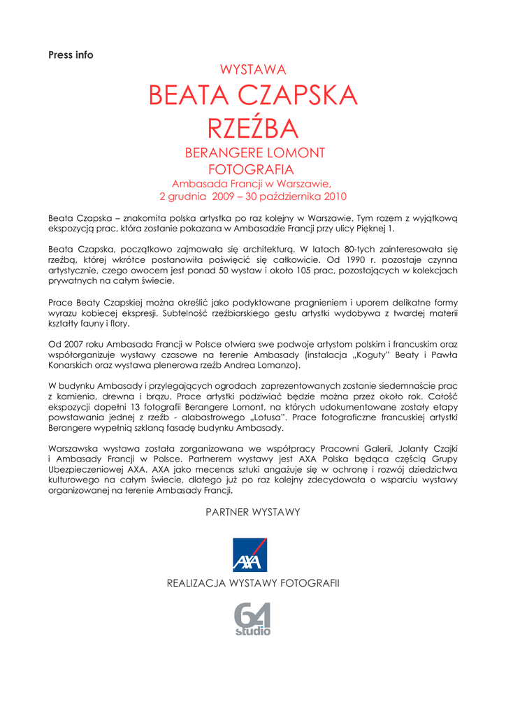 Press info WYSTAWA BEATA CZAPSKA RZEŹBA BERANGERE LOMONT FOTOGRAFIA Ambasada Francji w Warszawie, 2 grudnia 2009 – 30 października 2010 Beata Czapska – znakomita polska artystka po raz kolejny w Warszawie. Tym razem z wyjątkową ekspozycją prac, która zostanie pokazana w Ambasadzie Francji przy ulicy Pięknej 1. Beata Czapska, początkowo zajmowała się architekturą. W latach 80-tych zainteresowała się rzeźbą, której wkrótce postanowiła poświęcić się całkowicie. Od 1990 r. pozostaje czynna artystycznie, czego owocem jest ponad 50 wystaw i około 105 prac, pozostających w kolekcjach prywatnych na całym świecie. Prace Beaty Czapskiej można określić jako podyktowane pragnieniem i uporem delikatne formy wyrazu kobiecej ekspresji. Subtelność rzeźbiarskiego gestu artystki wydobywa z twardej materii kształty fauny i flory. Od 2007 roku Ambasada Francji w Polsce otwiera swe podwoje artystom polskim i francuskim oraz współorganizuje wystawy czasowe na terenie Ambasady (instalacja „Koguty” Beaty i Pawła Konarskich oraz wystawa plenerowa rzeźb Andrea Lomanzo). W budynku Ambasady i przylegających ogrodach zaprezentowanych zostanie siedemnaście prac z kamienia, drewna i brązu. Prace artystki podziwiać będzie można przez około rok. Całość ekspozycji dopełni 13 fotografii Berangere Lomont, na których udokumentowane zostały etapy powstawania jednej z rzeźb - alabastrowego „Lotusa”. Prace fotograficzne francuskiej artystki Berangere wypełnią szklaną fasadę budynku Ambasady. Warszawska wystawa została zorganizowana we współpracy Pracowni Galerii, Jolanty Czajki i Ambasady Francji w Polsce. Partnerem wystawy jest AXA Polska będąca częścią Grupy Ubezpieczeniowej AXA. AXA jako mecenas sztuki angażuje się w ochronę i rozwój dziedzictwa kulturowego na całym świecie, dlatego już po raz kolejny zdecydowała o wsparciu wystawy organizowanej na terenie Ambasady Francji. PARTNER WYSTAWY REALIZACJA WYSTAWY FOTOGRAFII WSPÓŁPRACA PATRONAT MEDIALNY TVP Warszawa, Polskie Radio – Program II, Sztuka.pl, Golf&Life, Business&Life, Świat Elit, Polki w Świecie, Fashion Magazin WYSTAWA: BEATA CZAPSKA RZEŹBA BERANGERE LOMONT FOTOGRAFIA 2 grudnia 2009 – 30 października 2010 ORGANIZATORZY: Ambasada Republiki Francuskiej 00-477 Warszawa ul. Piękna 1 T + (48 22) 529 30 73 www.ambafrance-pl.org PracowniaGaleria 00–669 Warszawa, ul. Emilii Plater 14 [email protected] www.pracowniagaleria.pl Kontakt prasowy/ PracowniaGaleria Ewa Zwolińska T + (48 22) 696 74 51 mobile 0 516 146 242 EKSPOZYCJA: Ambasada Republiki Francuskiej 00- 477 Warszawa ul. Piękna 1 tel. + (48 22) 529 30 73 www.ambafrance-pl.org WERNISAŻ: 1 Grudnia 2009 Ambasada Republiki Francuskiej 00-477 Warszawa, ul. Piękna 1 godzina 12.00 – wejście za okazaniem zaproszeń PARTNERZY WYSTAWY: AXA Polska S.A. 00-867 Warszawa, ul. Chłodna 51 T + (48 22) 555 00 50 www.axa-polska.pl Studio64 00-675 Warszawa, ul. Koszykowa 54 T + (48 22) 630 81 03 www.s64.pl copyright © 2009 PracowniaGaleria