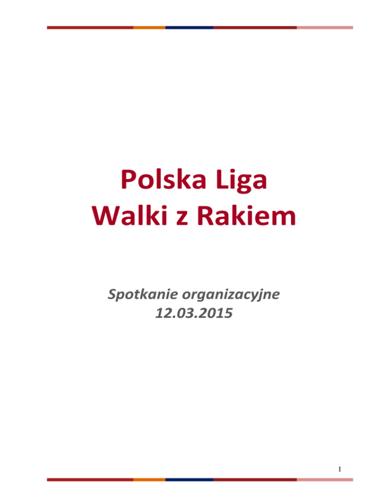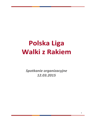 Polska Liga Walki z Rakiem Spotkanie organizacyjne 12.03.2015 1 FUNDATORZY LIGI Bogdan Borusewicz Krystyna Janda Prof. Jerzy Stuhr Krzysztof Hołowczyc Prof. Ewa Łętowska Danuta Wałęsa 2 ZAPROSZENI DO RADY FUNDACJI Łukasz Andrzejewski Filozof, publicysta. Doktorant w Instytucie Filozofii UW. Autor książki „Polityka nowotworowa. Pamiętnik praktyczno-teoretyczny.” Dr Marek Balicki Specjalista w dziedzinie anestezjologii oraz psychiatrii. Kierownik Poradni Zdrowia Psychicznego Wolskiego Centrum Zdrowia Psychicznego w Warszawie. Polityk. Minister zdrowia w gabinetach Leszka Millera i Marka Belki. Poseł na Sejm I, II i VI kadencji. Senator V kadencji. Prof. Andrzej Blikle Informatyk. Pracownik Instytutu Podstaw Informatyki PAN, członek Europejskiej Akademii Nauk. Prezes stowarzyszenia Inicjatywa Firm Rodzinnych. Członek Rady Fundacji Centrum im. Adama Smitha oraz Fundacji Kronenberga przy Citi Handlowy. 3 Prof. Mariusz Bidziński Specjalista w dziedzinie położnictwa i ginekologii oraz ginekologii onkologicznej. Ordynator oddziału Ginekologii i Patologii Ciąży Szpitala Specjalistycznego „Inflancka” Imienia Krysi Niżyńskiej - "Zakurzonej" w Warszawie. Wojewódzki Konsultant w dziedzinie ginekologii onkologicznej (woj. świętokrzyskie). Członek Zarządu Głównego Polskiego Towarzystwa Ginekologii Onkologicznej. Prof. Barbara Bobek-Billewicz Specjalista w dziedzinie radiologii i medycyny nuklearnej. Kierownik Zakładu Radiologii i Diagnostyki Obrazowej Centrum Onkologii Instytutu im. M. Skłodowskiej-Curie w Gliwicach. Członek Zarządu Polskiego Lekarskiego Towarzystwa Radiologicznego oraz przewodnicząca sekcji neuroradiologii. Prof. Alicja Chybicka Specjalista w dziedzinie pediatrii, onkologii, hematologii dziecięcej, immunologii klinicznej, transplantologii klinicznej oraz medycyny paliatywnej. Kierownik Katedry i Kliniki Transplantacji Szpiku, Onkologii i Hematologii Dziecięcej Uniwersytetu Medycznego we Wrocławiu. Prezes Polskiego Towarzystwa Pediatrycznego. Senator VIII kadencji. 4 Dr n. med. Joanna A. Didkowska Doktor nauk medycznych w dziedzinie biologii medycznej. Pracownik Zakładu Epidemiologii i Prewencji Nowotworów Centrum Onkologii – Instytutu im. Marii Skłodowskiej-Curie w Warszawie. Członek Zespołu Krajowego Rejestru Nowotworów. Członek Zarządu Głównego Polskiego Towarzystwa Onkologicznego. Prof. Rafał Dziadziuszko Specjalista w dziedzinie radioterapii onkologicznej i onkologii klinicznej. Zastępca kierownika Katedry i Kliniki Onkologii i Radioterapii Gdańskiego Uniwersytetu Medycznego. Konsultant krajowy w dziedzinie radioterapii onkologicznej. Prof. Iwona Gisterek Specjalista w dziedzinie radioterapii onkologicznej. Ordynator Międzynarodowego Centrum Onkoterapii w Koszalinie oraz Kierownik Zakładu Podstaw Radiologii i Radioterapii na Wydziale Technologii i Edukacji Politechniki Koszalińskiej. 5 Prof. Jacek Jassem Specjalista w dziedzinie radioterapii onkologicznej i onkologii klinicznej. Kierownik Katedry i Kliniki Onkologii i Radioterapii Gdańskiego Uniwersytetu Medycznego. Były przewodniczący Zarządu Głównego Polskiego Towarzystwa Onkologicznego. Członek-korespondent Polskiej Akademii Umiejętności, członek European Academy of Cancer Sciences. Prof. Janusz Jaśkiewicz Specjalista w dziedzinie chirurgii ogólnej i onkologicznej. Kierownik Katedry i Kliniki Chirurgii Onkologicznej Gdańskiego Uniwersytetu Medycznego. Były prezes Polskiego Towarzystwa Chirurgii Onkologicznej. Prof. Wiesław Wiktor Jędrzejczak Specjalista w dziedzinie hematologii, onkologii klinicznej i transplantologii. Kierownik Katedry i Kliniki Hematologii, Onkologii i Chorób Wewnętrznych Warszawskiego Uniwersytetu Medycznego. W roku 1984 po raz pierwszy, wraz z zespołem, wykonał udany zabieg przeszczepienia szpiku w Polsce. 6 Prof. Andrzej Kawecki Specjalista w dziedzinie onkologii klinicznej oraz radioterapii onkologicznej. Kierownik Kliniki Nowotworów Głowy i Szyi Centrum Onkologii w Warszawie. Konsultant województwa mazowieckiego w dziedzinie radioterapii onkologicznej. Członek Zarządu Głównego Polskiego Towarzystwa Onkologii Klinicznej. Prof. Lucyna Kępka Specjalista w dziedzinie radioterapii onkologicznej. Kierownik Zakładu i Oddziału Klinicznego Radioterapii Warmińsko-Mazurskiego Centrum Onkologii. Konsultant wojewódzki ds. radioterapii onkologicznej województwa warmińsko-mazurskiego. Członek Zarządu Głównego Polskiego Towarzystwa Radioterapii Onkologicznej. Prof. Radzisław Kordek Specjalista w dziedzinie patomorfologii i patologii onkologicznej. Kierownik Katedry Onkologii Uniwersytetu Medycznego w Łodzi. Prorektor ds. Nauki i Współpracy z Zagranicą. Konsultant krajowy w dziedzinie patomorfologii. 7 Prof. Romuald Krajewski Specjalista w dziedzinie neurochirurgii. Kierownik Oddziału Zabiegowego Kliniki Nowotworów Głowy i Szyi Centrum Onkologii w Warszawie. Wiceprezes Naczelnej Rady Lekarskiej. Prezes Europejskiej Unii Lekarzy Specjalistów. Ks. dr hab. Piotr Krakowiak Pallotyn, teolog i psycholog. Kierownik Pracowni Badań nad Jakością Opieki i Potrzebami Duchowymi UMK w Toruniu, Duszpasterz Krajowy Hospicjów, członek Zespołu ds. Duszpasterstwa Służby Zdrowia przy Konferencji Episkopatu Polski, członek komitetu sterującego Europejskiej Akademii Opieki Paliatywnej, członek zespołu The Global Network for Spirituality & Health. Dr Jacek R. Łuczak Lekarz rodzinny. Członek Zarządu Kolegium Lekarzy Rodzinnych w Polsce. 8 Dr n. przyr. Andrzej Mądrala Wiceprezydent Konfederacji Pracodawców RP, odpowiedzialny za sprawy sektora ochrony zdrowia. Wiceprezes Ogólnopolskiego Stowarzyszenia Szpitali Prywatnych. Wiceprezes Stowarzyszenia AMD. Przewodniczący Korporacji „Zdrowe Zdrowie” Pracodawców Rzeczypospolitej Polskiej. Dr n. med. Janusz Meder Specjalista w dziedzinie radioterapii onkologicznej. Kierownik Oddziału Zachowawczego Kliniki Nowotworów Układu Chłonnego w Centrum Onkologii – Instytucie w 