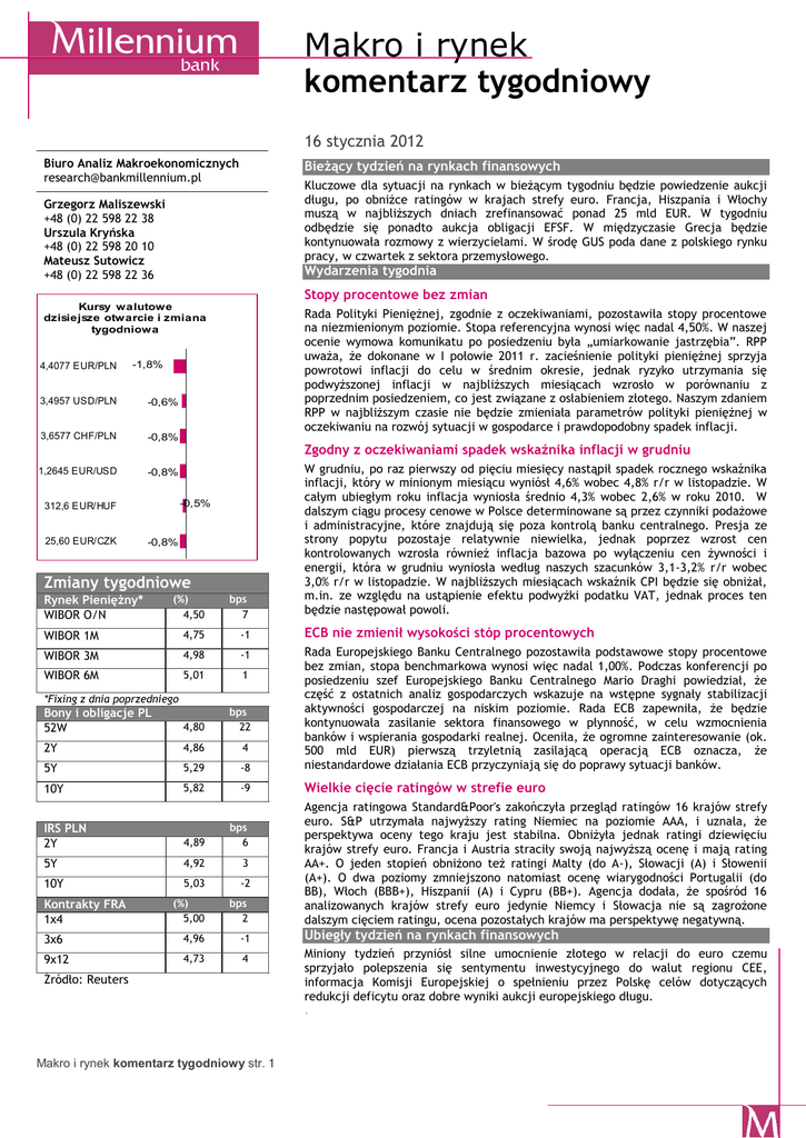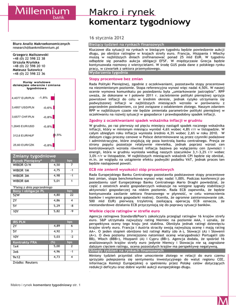 Makro i rynek komentarz tygodniowy 16 stycznia 2012 Biuro Analiz Makroekonomicznych [email protected] Bieżący tydzień na rynkach finansowych Kluczowe dla sytuacji na rynkach w bieżącym tygodniu będzie powiedzenie aukcji długu, po obniżce ratingów w krajach strefy euro. Francja, Hiszpania i Włochy muszą w najbliższych dniach zrefinansować ponad 25 mld EUR. W tygodniu odbędzie się ponadto aukcja obligacji EFSF. W międzyczasie Grecja będzie kontynuowała rozmowy z wierzycielami. W środę GUS poda dane z polskiego rynku pracy, w czwartek z sektora przemysłowego. Grzegorz Maliszewski +48 (0) 22 598 22 38 Urszula Kryńska +48 (0) 22 598 20 10 Mateusz Sutowicz +48 (0) 22 598 22 36 Wydarzenia tygodnia Stopy procentowe bez zmian Kursy walutowe dzisiejsze otwarcie i zmiana tygodniowa -0,1 4,4077 EUR/PLN 0,0 0,0 0,1 -1,8% 3,4957 USD/PLN -0,6% 3,6577 CHF/PLN -0,8% 1,2645 EUR/USD -0,8% 25,60 EUR/CZK Zgodny z oczekiwaniami spadek wskaźnika inflacji w grudniu -0,5% 312,6 EUR/HUF -0,8% Zmiany tygodniowe Rynek Pieniężny* WIBOR O/N Rada Polityki Pieniężnej, zgodnie z oczekiwaniami, pozostawiła stopy procentowe na niezmienionym poziomie. Stopa referencyjna wynosi więc nadal 4,50%. W naszej ocenie wymowa komunikatu po posiedzeniu była „umiarkowanie jastrzębia”. RPP uważa, że dokonane w I połowie 2011 r. zacieśnienie polityki pieniężnej sprzyja powrotowi inflacji do celu w średnim okresie, jednak ryzyko utrzymania się podwyższonej inflacji w najbliższych miesiącach wzrosło w porównaniu z poprzednim posiedzeniem, co jest związane z osłabieniem złotego. Naszym zdaniem RPP w najbliższym czasie nie będzie zmieniała parametrów polityki pieniężnej w oczekiwaniu na rozwój sytuacji w gospodarce i prawdopodobny spadek inflacji. W grudniu, po raz pierwszy od pięciu miesięcy nastąpił spadek rocznego wskaźnika inflacji, który w minionym miesiącu wyniósł 4,6% wobec 4,8% r/r w listopadzie. W całym ubiegłym roku inflacja wyniosła średnio 4,3% wobec 2,6% w roku 2010. W dalszym ciągu procesy cenowe w Polsce determinowane są przez czynniki podażowe i administracyjne, które znajdują się poza kontrolą banku centralnego. Presja ze strony popytu pozostaje relatywnie niewielka, jednak poprzez wzrost cen kontrolowanych wzrosła również inflacja bazowa po wyłączeniu cen żywności i energii, która w grudniu wyniosła według naszych szacunków 3,1-3,2% r/r wobec 3,0% r/r w listopadzie. W najbliższych miesiącach wskaźnik CPI będzie się obniżał, m.in. ze względu na ustąpienie efektu podwyżki podatku VAT, jednak proces ten będzie następował powoli. (%) 4,50 bps 7 WIBOR 1M 4,75 -1 ECB nie zmienił wysokości stóp procentowych WIBOR 3M 4,98 -1 WIBOR 6M 5,01 1 Bony i obligacje PL 52W 4,80 bps 22 2Y 4,86 4 5Y 5,29 -8 Rada Europejskiego Banku Centralnego pozostawiła podstawowe stopy procentowe bez zmian, stopa benchmarkowa wynosi więc nadal 1,00%. Podczas konferencji po posiedzeniu szef Europejskiego Banku Centralnego Mario Draghi powiedział, że część z ostatnich analiz gospodarczych wskazuje na wstępne sygnały stabilizacji aktywności gospodarczej na niskim poziomie. Rada ECB zapewniła, że będzie kontynuowała zasilanie sektora finansowego w płynność, w celu wzmocnienia banków i wspierania gospodarki realnej. Oceniła, że ogromne zainteresowanie (ok. 500 mld EUR) pierwszą trzyletnią zasilającą operacją ECB oznacza, że niestandardowe działania ECB przyczyniają się do poprawy sytuacji banków. 10Y 5,82 -9 Wielkie cięcie ratingów w strefie euro IRS PLN 2Y 4,89 bps 6 5Y 4,92 3 *Fixing z dnia poprzedniego 10Y 5,03 -2 (%) 5,00 bps 2 3x6 4,96 -1 9x12 4,73 4 Kontrakty FRA 1x4 Źródło: Reuters Makro i rynek komentarz tygodniowy str. 1 Agencja ratingowa Standard&Poor's zakończyła przegląd ratingów 16 krajów strefy euro. S&P utrzymała najwyższy rating Niemiec na poziomie AAA, i uznała, że perspektywa oceny tego kraju jest stabilna. Obniżyła jednak ratingi dziewięciu krajów strefy euro. Francja i Austria straciły swoją najwyższą ocenę i mają rating AA+. O jeden stopień obniżono też ratingi Malty (do A-), Słowacji (A) i Słowenii (A+). O dwa poziomy zmniejszono natomiast ocenę wiarygodności Portugalii (do BB), Włoch (BBB+), Hiszpanii (A) i Cypru (BB+). Agencja dodała, że spośród 16 analizowanych krajów strefy euro jedynie Niemcy i Słowacja nie są zagrożone dalszym cięciem ratingu, ocena pozostałych krajów ma perspektywę negatywną. Ubiegły tydzień na rynkach finansowych Miniony tydzień przyniósł silne umocnienie złotego w relacji do euro czemu sprzyjało polepszenia się sentymentu inwestycyjnego do walut regionu CEE, informacja Komisji Europejskiej o spełnieniu przez Polskę celów dotyczących redukcji deficytu oraz dobre wyniki aukcji europejskiego długu. . Makro i rynek komentarz tygodniowy Komentarz makroekonomiczny – Polska Stopy procentowe bez zmian Rada Polityki Pieniężnej, zgodnie z oczekiwaniami, pozostawiła stopy procentowe na niezmienionym poziomie. Stopa referencyjna wynosi więc nadal 4,50%. W naszej ocenie wymowa komunikatu po posiedzeniu była „umiarkowanie jastrzębia”. RPP uważa, że dokonane w I połowie 2011 r. zacieśnienie polityki pieniężnej sprzyja powrotowi inflacji do celu w średnim okresie, jednak ryzyko utrzymania się podwyższonej inflacji w najbliższych miesiącach wzrosło w porównaniu z poprzednim posiedzeniem, co jest związane z osłabieniem złotego. Rada zauważa, że w najbliższym czasie w kierunku spadku inflacji, z obecnego podwyższonego poziomu, będzie oddziaływać wygasanie wpływu podwyżki stawek VAT oraz efektów znacznych wzrostów cen żywności i energii z I połowy 2011 r. Z drugiej strony wysokie ceny surowców na rynkach światowych oraz wcześniejsze osłabienie kursu złotego będą czynnikami podtrzymującymi podwyższoną dynamikę cen. Rada nadal sądzi, że w średnim okresie inflacja będzie ograniczana przez 