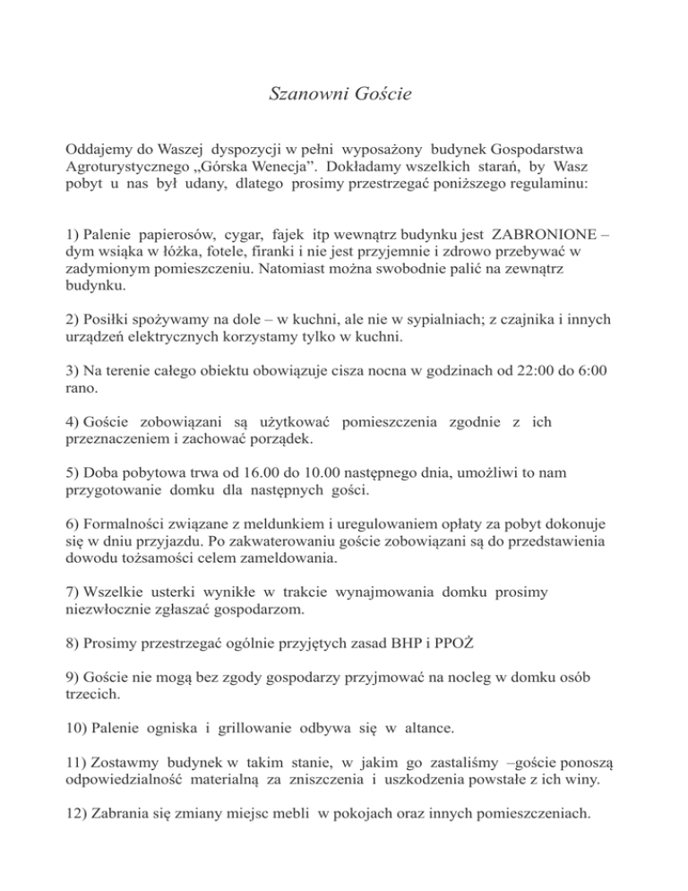 Szanowni Goście Oddajemy do Waszej dyspozycji w pełni wyposażony budynek Gospodarstwa Agroturystycznego „Górska Wenecja”. Dokładamy wszelkich starań, by Wasz pobyt u nas był udany, dlatego prosimy przestrzegać poniższego regulaminu: 1) Palenie papierosów, cygar, fajek itp wewnątrz budynku jest ZABRONIONE – dym wsiąka w łóżka, fotele, firanki i nie jest przyjemnie i zdrowo przebywać w zadymionym pomieszczeniu. Natomiast można swobodnie palić na zewnątrz budynku. 2) Posiłki spożywamy na dole – w kuchni, ale nie w sypialniach; z czajnika i innych urządzeń elektrycznych korzystamy tylko w kuchni. 3) Na terenie całego obiektu obowiązuje cisza nocna w godzinach od 22:00 do 6:00 rano. 4) Goście zobowiązani są użytkować pomieszczenia zgodnie z ich przeznaczeniem i zachować porządek. 5) Doba pobytowa trwa od 16.00 do 10.00 następnego dnia, umożliwi to nam przygotowanie domku dla następnych gości. 6) Formalności związane z meldunkiem i uregulowaniem opłaty za pobyt dokonuje się w dniu przyjazdu. Po zakwaterowaniu goście zobowiązani są do przedstawienia dowodu tożsamości celem zameldowania. 7) Wszelkie usterki wynikłe w trakcie wynajmowania domku prosimy niezwłocznie zgłaszać gospodarzom. 8) Prosimy przestrzegać ogólnie przyjętych zasad BHP i PPOŻ 9) Goście nie mogą bez zgody gospodarzy przyjmować na nocleg w domku osób trzecich. 10) Palenie ogniska i grillowanie odbywa się w altance. 11) Zostawmy budynek w takim stanie, w jakim go zastaliśmy –goście ponoszą odpowiedzialność materialną za zniszczenia i uszkodzenia powstałe z ich winy. 12) Zabrania się zmiany miejsc mebli w pokojach oraz innych pomieszczeniach. 13) Właściciel domku może wymówić pobyt osobom, które rażąco naruszyły regulamin pobytu, wyrządziły szkodę w mieniu gospodarzy, gości lub innych osób przebywających w naszym obiekcie. 14) Za zgubienie klucza pobierana jest opłata 30 zł 15) Świadczymy usługi zgodnie ze swoją kategorią, w przypadku zastrzeżeń, reklamacji dotyczących co do jakości usług, gość proszony jest o zgłoszenie ich nie później niż dobę od momentu meldunku. Informujemy, że nie odpowiadamy za niegodności spowodowane z przyczyn od nas niezależnych np. przerwy w dostawie wody lub prądu, osłabienia sygnału Internetu lub TV. 16) Gospodarze ze swej strony zapewniają: - zachowanie tajemnicy informacji o gościu - miłą i uprzejmą obsługę - wykonanie niezbędnych napraw urządzeń podczas nieobecności gościa, a w przypadku jego obecności tylko za jego zgodą 17) W razie potrzeby lub pytań, pod nieobecność gospodarzy prosimy dzwonić pod numer telefonu 512 44 25 26 Regulamin Gospodarstwa Agroturystycznego „Górska Wenecja” podaje się do wiadomości poprzez zamieszczenie na stronie internetowej www.agrorubicz.pl oraz w pokojach gościnnych. Dokonanie rezerwacji oznacza akceptację powyższego Regulaminu. Życzymy Państwu miłego pobytu i niezapomnianych wrażeń – a w razie potrzeby służymy radą i pomocą!