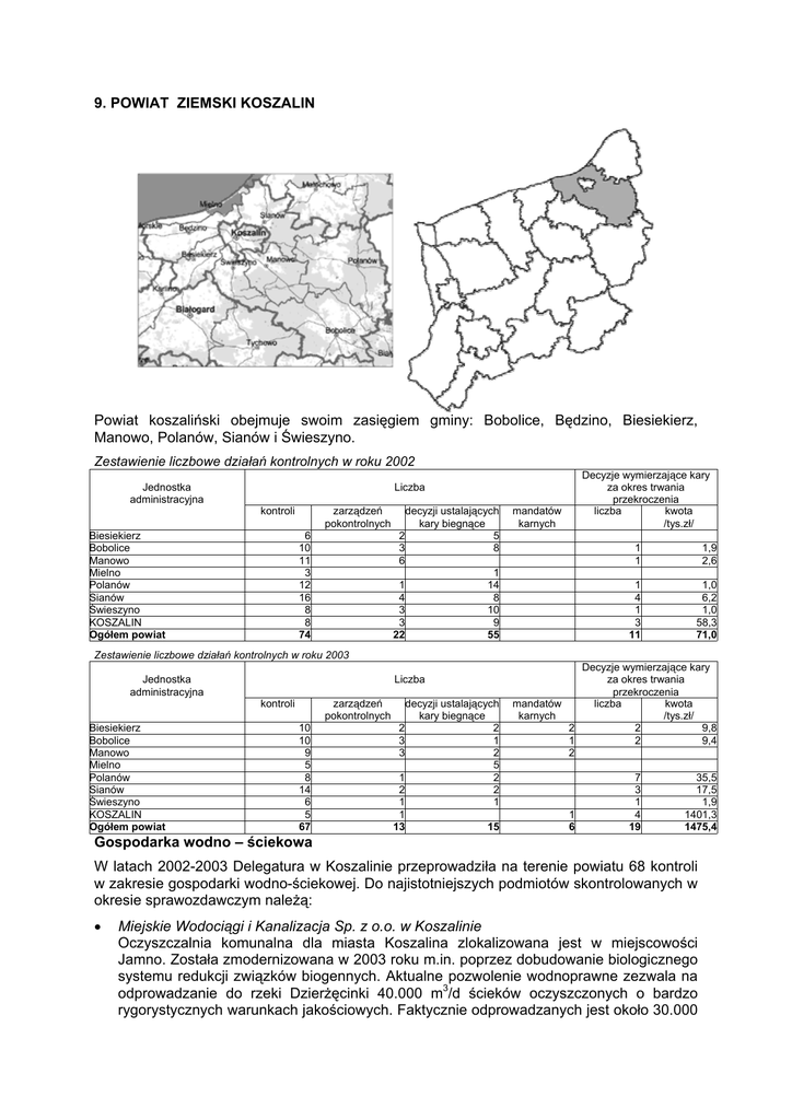 9. POWIAT ZIEMSKI KOSZALIN Powiat koszaliński obejmuje swoim zasięgiem gminy: Bobolice, Będzino, Biesiekierz, Manowo, Polanów, Sianów i Świeszyno. Zestawienie liczbowe działań kontrolnych w roku 2002 Jednostka administracyjna Decyzje wymierzające kary za okres trwania przekroczenia liczba kwota /tys.zł/ Liczba kontroli Biesiekierz Bobolice Manowo Mielno Polanów Sianów Świeszyno KOSZALIN Ogółem powiat zarządzeń pokontrolnych 6 10 11 3 12 16 8 8 74 decyzji ustalających kary biegnące 2 5 3 8 6 1 1 14 4 8 3 10 3 9 22 55 mandatów karnych 1 1 1,9 2,6 1 4 1 3 11 1,0 6,2 1,0 58,3 71,0 Zestawienie liczbowe działań kontrolnych w roku 2003 Jednostka administracyjna Biesiekierz Bobolice Manowo Mielno Polanów Sianów Świeszyno KOSZALIN Ogółem powiat Liczba kontroli zarządzeń pokontrolnych 10 10 9 5 8 14 6 5 67 decyzji ustalających kary biegnące 2 2 3 1 3 2 5 1 2 2 2 1 1 1 13 15 Decyzje wymierzające kary za okres trwania przekroczenia mandatów liczba kwota karnych /tys.zł/ 2 2 9,8 1 2 9,4 2 1 6 7 3 1 4 19 35,5 17,5 1,9 1401,3 1475,4 Gospodarka wodno – ściekowa W latach 2002-2003 Delegatura w Koszalinie przeprowadziła na terenie powiatu 68 kontroli w zakresie gospodarki wodno-ściekowej. Do najistotniejszych podmiotów skontrolowanych w okresie sprawozdawczym należą: • Miejskie Wodociągi i Kanalizacja Sp. z o.o. w Koszalinie Oczyszczalnia komunalna dla miasta Koszalina zlokalizowana jest w miejscowości Jamno. Została zmodernizowana w 2003 roku m.in. poprzez dobudowanie biologicznego systemu redukcji związków biogennych. Aktualne pozwolenie wodnoprawne zezwala na odprowadzanie do rzeki Dzierżęcinki 40.000 m3/d ścieków oczyszczonych o bardzo rygorystycznych warunkach jakościowych. Faktycznie odprowadzanych jest około 30.000 m3/d ścieków. Kontrole przeprowadzane w 2003 roku potwierdziły wysoką sprawność tej oczyszczalni. • Zakład Wodociągowo-Kanalizacyjny w Unieście Oczyszczalnia gminna w Unieściu przyjmuje ścieki z miejscowości turystycznowczasowych (Mielenko, Mielno, Unieście), a w najbliższej perspektywie do gminnego systemu kanalizacyjnego włączone zostaną ścieki z pobliskich Łazów z bazą wczasowowypoczynkową. Sezonowa zmienność obciążenia urządzeń oczyszczalni powoduje okresowe naruszanie warunków pozwolenia wodnoprawnego określającego dopuszczalny przepływ w okresie letnim - 6.500 m3/d. Faktyczna ilość ścieków w sezonie wynosi około 4.500 m3/d, a poza sezonem około 1.300 m3/d. Odbiornikiem ścieków jest jezioro Jamno. W związku ze stwierdzonym przekroczeniem dopuszczalnych norm we wskaźniku fosforu ogólnego wymierzono użytkownikowi oczyszczalni karę pieniężną za czas trwania przekroczenia. • Zakład Usług Komunalnych w Polanowie Mechaniczno-biologiczna oczyszczalnia w Polanowie przyjmuje ścieki komunalne z Polanowa. W perspektywie przewiduje się skanalizowanie części gminy (Wietrzno, Chocimino) z włączeniem ścieków do oczyszczalni gminnej. Obiekt oddano do użytku w miesiącu październiku 2003 roku. Zestaw technologiczny pozwala na uzyskanie podwyższonej redukcji biogenów. Zgodnie z warunkami aktualnego pozwolenia wodnoprawnego odbiornikiem oczyszczonych ścieków jest rzeka Grabowa. Dopuszczalna ilość odprowadzanych ścieków wynosi 1.200 m3/d. Faktycznie oczyszczalnia przyjmuje około 500 m3/d ścieków. Kontrola w 2003 roku potwierdziła wysoką sprawność eksploatacyjną oczyszczalni. • Zakład Usług Komunalnych i Oświatowych w Bobolicach Oczyszczalnia w Bobolicach oczyszcza ścieki komunalne z Bobolic oraz dowożone ścieki z okolicznych zbiorników bezodpływowych. Instalacja mechaniczno-biologicznochemiczna podczas dotychczasowej eksploatacji potwierdziła wysoką skuteczność oczyszczania, pozwalającą na uzyskanie parametrów jakościowych w oczyszczonych ściekach, zgodnych z warunkami pozwolenia wodnoprawnego. Dopuszczalna i faktyczna ilość ścieków odprowadzanych do odbiornika - rzeki Chocieli - wynosi 800 m3/d. Ochrona powietrza W latach 2002-2003 przeprowadzono 22 kontrole. Do znaczących zakładów w powiecie, emitujących zanieczyszczenia do powietrza, należą: • Koszalińskie Przedsiębiorstwo Gospodarki Ogrodniczej Sp. z o.o. w Karnieszewicach Eksploatuje dużą kotłownię o mocy cieplnej 20,3 MW. W zakładzie tym, kolejny raz, odnotowano przekroczenie stężenia dwutlenku azotu, w związku z czym wymierzona została kara pieniężna biegnąca. Kotłownia wyposażona jest w urządzenia starego typu (kotły zasilane olejem opałowym ciężkim). W wyniku realizowanej inwestycji (wymiana palników na niskoemisyjne), a także za sprawą prowadzonych badań przez Politechnikę Śląską, występujące od kilku lat przekroczenie dopuszczalnej normy tlenków azotu sukcesywnie maleje. • „Polmach” Zakłady Przemysłu Zapałczanego w Sianowie Zakład produkuje zapałki oraz sezonowo wałki ogrodowe i łubianki. Głównym źródłem emisji jest linia technologiczna oraz kotłownia zakładowa (o mocy 8 MW). Pomiary emisji zanieczyszczeń do powietrza nie wykazały przekroczeń dopuszczalnej emisji. Stwierdzono natomiast uchybienia niestosowania się do wymogów decyzji – brak wymaganych pomiarów. 2 Ochrona przed hałasem Na terenie powiatu przeprowadzono 5 kontroli podmiotów prowadzących działalność gospodarczą, z czego ponadnormatywną emisję hałasu powodowały: • Zakład Przemysłu Drzewnego w Manowie Zakład produkuje tarcicę oraz ozdobne elementy ogrodowe. Podczas kontroli w 2002 roku stwierdzono nadmierną emisję hałasu, której głównym źródłem był taśmociąg trocin i zrębków. Działania pokontrolne, podjęte przez WIOŚ, doprowadziły do uzyskania przez zakład pozwolenia Starosty Koszalińskiego na emitowanie hałasu do środowiska. Podczas kontroli sprawdzającej stwierdzono przekroczenie poziomu hałasu określonego w pozwoleniu o 2,2 dB(A) w porze dziennej. W związku z tym, ustalono zakładowi wymiar kary pieniężnej biegn