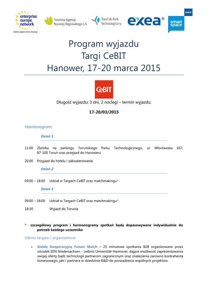 Program wyjazdu Targi CeBIT Hanower, 17-20 marca 2015 Długość wyjazdu: 3 dni, 2 noclegi – termin wyjazdu: 17-20/03/2015 Harmonogram: Dzień 1 11:00 Zbiórka na parkingu Toruńskiego Parku 87-100 Toruń oraz przejazd do Hanoweru 20.00 Przyjazd do hotelu i zakwaterowanie Technologicznego, ul. Włocławska 167, Dzień 2 09:00 – 18:00 Udział w Targach CeBIT oraz matchmakingu* Dzień 3 09:00 – 18:00 Udział w Targach CeBIT oraz matchmakingu* 18:30 Wyjazd do Torunia * szczegółowy program i harmonogramy spotkań będą dopasowywane indywidualnie do potrzeb każdego uczestnika Oferta targów i organizatora: Giełdę Kooperacyjną Future Match – 25 minutowe spotkania B2B organizowane przez ośrodek EEN Niedersachsen - Leibniz Universität Hannover, dające możliwość zaprezentowania swojej oferty bądź technologii partnerom zagranicznym oraz znalezienia zarówno kontrahenta biznesowego, jaki i partnera w dziedzinie R&D do prowadzenia wspólnych projektów. Udział w giełdzie (w co najmniej 2 spotkaniach branżowych) jest obowiązkowy dla uczestników korzystających z dofinansowania wyjazdu. SCALE 11 - spotkania z inwestorami i firmami o już ugruntowanej pozycji na rynku, a także poznanie potencjalnych klientów oraz pracowników; wkroczenie w startupowy ekosystem dzięki zwiedzaniu stoisk startupowców. Zwiedzanie targów CeBIT – spotkania na stoiskach wcześniej wyselekcjonowanych firm, które mogą być partnerami/inwestorami/mentorami dla poszczególnych startupów.
