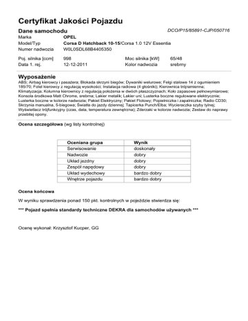 Certyfikat Jakości Pojazdu DCO/P15/85891-CJP/050716 Dane samochodu Marka Model/Typ Numer nadwozia OPEL Corsa D Hatchback 10-15/Corsa 1.0 12V Essentia W0L0SDL68B4405350 Poj. silnika [ccm] Data 1. rej. 998 12-12-2011 Moc silnika [kW] Kolor nadwozia 65/48 srebrny Wyposażenie ABS; Airbag kierowcy i pasażera; Blokada skrzyni biegów; Dywaniki welurowe; Felgi stalowe 14 z ogumieniem 185/70; Fotel kierowcy z regulacją wysokości; Instalacja radiowa (4 głośniki); Kierownica trójramienna; Klimatyzacja; Kolumna kierownicy z regulacją położenia w dwóch płaszczyznach; Koło zapasowe pełnowymiarowe; Konsola środkowa Matt Chrome, srebrna; Lakier metalik; Lakier uni; Lusterka boczne regulowane elektrycznie; Lusterka boczne w kolorze nadwozia; Pakiet Elektryczny; Pakiet Flotowy; Popielniczka i zapalniczka; Radio CD30; Skrzynia manualna, 5-biegowa; Światła do jazdy dziennej; Tapicerka Punch/Elba; Wycieraczka szyby tylnej; Wyświetlacz trójfunkcyjny (czas, data, temperatura zewnętrzna); Zderzaki w kolorze nadwozia; Zestaw do naprawy przebitej opony. Ocena szczegółowa (wg listy kontrolnej) Oceniana grupa Serwisowanie Nadwozie Układ jezdny Zespół napędowy Układ wydechowy Wnętrze pojazdu Wynik doskonały dobry dobry dobry bardzo dobry bardzo dobry Ocena końcowa W wyniku sprawdzenia ponad 150 pkt. kontrolnych w pojeździe stwierdza się: *** Pojazd spełnia standardy techniczne DEKRA dla samochodów używanych *** Ocenę wykonał: Krzysztof Kucper, GG