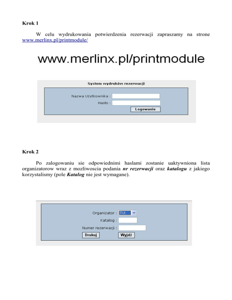 Krok 1 W celu wydrukowania potwierdzenia rezerwacji zapraszamy na strone www.merlinx.pl/printmodule/ Krok 2 Po zalogowaniu sie odpowiednimi haslami zostanie uaktywniona lista organizatorow wraz z mozliwoscia podania nr rezerwacji oraz katalogu z jakiego korzystalismy (pole Katalog nie jest wymagane). Krok 3 Po wybraniu z listy kodu touroperatora oraz po wspisaniu nr rezerwacji zostanie wyswietlone potwierdzenie podrozy. Krok 4 Prosze o zwrocenie uwagi na komunikat od touroperatora-w przypadku braku wydruku.