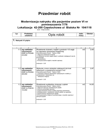 Przedmiar robót Modernizacja natrysku dla pacjentów poziom VI nr pomieszczenia 7/76 Lokalizacja 42-200 Częstochowa ul Bialska Nr 104/118 (kod - miejscowość) Lp. Podstawa ustalenia Opis robót Jedn. miary Obmiar 3 4 5 1. Natryski Vi piętro 1 2 1.1 wg nakładów rzeczowych KNR 4-01034803-050 Rozebranie ścianek z cegieł o grubości 1/2 cegły na zaprawie cementowo-wapiennej m2 2,00 m2 2,87 m2 14,00 Charakterystyka Robót: Tablica: 0348 1.Ręczne rozebranie ścianek 2.Odłożenie na bok cegieł całych i połówek nadających się do ponownego wbudowania 3.Oczyszczenie cegieł z resztek zaprawy krotność= 1,00 1.2 wg nakładów rzeczowych KNR 4-01035408-050 Wykucie z muru ościeżnic stalowych lub krat okiennych o powierzchni ponad 2 m2 Charakterystyka Robót: Tablica: 0354 1.Ostrożne wykucie elementów wykazanych w tablicy z odniesieniem i złożeniem na wskazane miejsce krotność= 1,00 1.3 wg nakładów rzeczowych KNR 4-01081915-050 Rozebranie wykładziny ściennej z płytek Charakterystyka Robót: Tablica: 0819 1.Ręczne wykucie uszkodzonych płytek 2.Skucie pozostałej zaprawy 3.Zagruntowanie ściany rzadką zaprawą cementową 4.Dopasowanie i osadzenie nowych płytek na zaprawie 5.Spoinowanie wstawionych płytek 6.Oczyszczenie miejsca na prawionego z resztek zaprawy i obmycie płytek krotność= 1,00 System kosztorysowania WINBUD Kosztorys Prof (wer. 2013.10) str 1 1 3 2 1.4 wg nakładów rzeczowych KNR 4-01081107-050 Rozebranie posadzki z płytek na zaprawie cementowej 4 5 m2 3,00 m3 0,40 m2 14,00 m2 1,60 szt 1,00 m2 1,60 m2 16,00 Charakterystyka Robót: Tablica: 0811 1.Rozebranie istniejących posadzek 2.Oczyszczenie i zagruntowanie podłoża 3.Przycięcie, dopasowanie i ułożenie płytek na zaprawie 4.Wypełnienie spoin zaprawą 5.Oczyszczenie powierzchni płytek z resztek zaprawy 6.Obmycie posadzki 7.Ostrożne rozebranie posadzki z oczyszczeniem i posegregowaniem odzyskanych płytek (kol.07) krotność= 1,00 1.5 wg nakładów rzeczowych KNR 4-01034902-060 Rozebranie ścian,filarów,kolumn wykonanych z cegieł na zaprawie cementowo-wapiennej Przyrwanie sciany na osadzenie drzwi 1,00 x200 Charakterystyka Robót: Tablica: 0349 1.Ręczne rozebranie ścian, filarów, nadproży i licowania z cegieł i kamieni 2.Odłożenie na bok cegieł całych i połówek oraz kamieni nadających się do ponownego wbudowania 3.Oczyszczenie cegieł i kamieni z resztek zaprawy krotność= 1,00 1.6 wg nakładów rzeczowych KNR 4-01070105-050 Odbicie tynków wewnętrznych z zaprawy cementowo-wapiennej o powierzchni ponad 5 m2 na ścianach,filarach,pilastrach Charakterystyka Robót: Tablica: 0701 1.Ręczne odbicie tynków bez względu na rodzaj podłoża 2 .Usunięcie otrzcinowania, osiatkowania lub dranic 3.Oczyszczenie spoin muru w miejscu odbitego tynku krotność= 1,00 1.7 wg nakładów rzeczowych KNR 4-01032003-050 Obsadzenie ościeżnic w ścianach z cegieł o powierzchni otworu ponad 2,0 m2 1.8 wg nakładów rzeczowych KNR 2-0210160101-020 Ościeżnice drzwiowe st.wbud.w trakcie wznoszenia ścian,dla drzwi wewnątrzlokalowych FD1,2-razy malowane na budowie farbą olejną D/grunt.I emalią ftal./BI.8/96/ krotność= 1,00 krotność= 1,00 1.9 wg nakładów rzeczowych KNR 2-02101702-050 Skrzydła drzwiowe płytowe wewnętrzne, wewnątrzlokalowe,jednodzielne pełne o powierzchni ponad 1,60 m2,fabrycznie wykończone szt 2 1,00x2,00 /B.I.nr 8/96/ 3 krotność= 1,00 1.10 wg nakładów Gruntowanie powierzchni poziomych preparatami rzeczowych gruntującymi "CERESIT CT 17" (Orgbud W-wa) KNR 2-02U1134- krotność= 1,00 01-050 System kosztorysowania WINBUD Kosztorys Prof (wer. 2013.10) str 2 1 3 2 1.11 wg nakładów rzeczowych KNR 00-39011601-050 Uszczelnienie powierzchni poziomych pomieszczeń mokrych i wilgotnych (łazienki,kuchnie itp.), balkonów i tarasów pod okładziną ceramiczną z masy SUPERFLEX 8 4 5 m2 16,50 m2 12,00 m 12,60 m2 3,00 1.15 wg nakładów Warstwa niwelacyjno-wyrównawcza cementowa rzeczowych (jastrych cementowy cienko-warstwowy,sucha KNR 2mieszanka) o grubości 2 mm,zatartana gładko 02W1105-01-050 krotność= 1,00 m2 16,00 1.16 wg nakładów rzeczowych KNR 4-01120209-050 m2 10,50 m2 10,50 krotność= 1,00 1.12 wg nakładów Licowanie ścian o powierzchni do 5 m2 płytkami rzeczowych glazurowanymi o wymiarach 20x25 cm na KNR 2-02U0837- zaprawie klejowej "ATLAS" (Orgbud W-wa) krotność= 1,00 04-050 1.13 wg nakładów Listwy narożnikowe przy ścianach licowanych rzeczowych płytkami z kamieni sztucznych na zaprawie KNR 2klejowej 02W0840-08-040 krotność= 1,00 1.14 wg nakładów rzeczowych KNR 2-02U111809-050 Posadzki jedno- i dwubarwne z płytek terakotowych 20x25 cm luzem,na zaprawie klejowej "ATLAS" w pomieszczeniach o powierzchni do 8 m2 (Orgbud W-wa) krotność= 1,00 Zeskrobanie i zmycie starej farby w pomieszczeniach o powierzchni podłogi ponad 5 m2 Charakterystyka Robót: Tablica: 1202 1.Zeskrobanie i zmycie starej farby (kol.01-06,08,09) 2.Wykonanie reperacji pęknięć, rys i uszkodzeń oraz wygładzenie powierzchni tynku (kol.01-06,08,09) 3.Zagruntowanie powierzchni (kol.01-06) 4.Malowanie zwykłe dwukrotne pędzlem (kol.01-06) 5.Zeskrobanie wykwitów (zacieków), pobiałkowanie gęstym mlekiem wapiennym, przetarcie packą i zagruntowanie mieszanką wapna i ałunu (kol.07) krotność= 1,00 1.17 wg nakładów Dwukrotne malowanie farbami emulsyjnymi rzeczowych starych tynków wewnętrznych ścian Charakterystyka Robót: Tablica: 1204 KNR 401W1204-02-050 1.Malowanie farbami emulsyjnymi tynków kol.01-07 2.Wygładzanie tynku (likwidacja nierówności i sfałdowań) przez szpachlowanie kol.08 Uwaga: Zmycie farby klejowej z tynku przyjmuje się z tablicy 1202 kol.08,09. krotność= 1,00 System kosztorysowania WINBUD Kosztorys Prof (wer. 2013.10) str 3 1 3 2 1.18 wg nakładów rzeczowych KNR 4-0112122801-040 Dwukrotne malowanie rur wodociągowych i gazowych o średnicy do 50 mm farbą ftalową nawierzchniową 1.19 wg nakładów rzeczowych KNR 4-03113307-020 Demontaż opraw