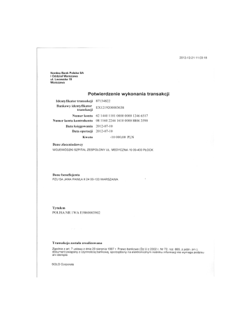 2012-12-21 11:03:18 Nordea Bank Polska SA I Oddział Warszawa ul. L w o w s k a 19 Warszawa Potwierdzenie wykonania transakcji Identyfikator transakcji Bankowy identyfikator transkacji 87134822 E X 1219200003638 Numer konta 62 1440 1101 0000 0000 1246 6517 Numer konta kontrahenta 08 1160 2244 1610 0000 8806 3590 Data księgowania 2012-07-10 Data operacji 2012-07-10 Kwota -10 000,00 PLN Dane zleceniodawcy WOJEWÓDZKI SZPITAL ZESPOLONY UL. MEDYCZNA 19 09-400 PŁOCK Dane beneficjenta PZU SA JANA PAWŁA II 24 00-133 W A R S Z A W A Tytułem POLISA NR IWA E5860003902 Transakcja została zrealizowana Zgodnie z art. 7 ustawy z dnia 29 sierpnia 1997 r. Prawo bankowe (Dz.U z 2002 r, Nr 72, roz. 665, z późn. zm.), dokument związany z czynnością bankową sporządzony na elektronicznym nośniku informacji nie wymaga podpisu ani stempla SOLO Corporate Strona 1 z 1 Bank Pekao SA ul. Grzybowska 53/57 00-950 Warszawa Potwierdzenie wykonanej operacji Dane właściciela rachunku Nazwa właściciela W O J E W O D Z K I SZPITAL ZESPOLONY Adres właściciela UL. M E D Y C Z N A 19, 09-400 PŁOCK Rachunek właściciela 33 1240 3174 1111 0000 2890 0083 Dane kontrahenta/zleceniodawcy Nazwa PZU SA Adres JANA PAWŁA II 24 00-133 W A R S Z A W A Rachunek PL08 1160 2244 1610 0000 8806 3590 Szczegóły operacji Data waluty 10.05.2012 Data księgowania 10.05.2012 06:49:17 Kwota -10 000,00 PLN Tytuł operacji POLISA NR I W A E586 0003 902 Typ operacji Obciążenie Kod operacji 6410 Opis kodu operacji PRZELEW MIĘDZYBANKOWY BETA/INTEGRA Sygnatura Referencje Klienta NONREF Referencje banku 4310510987330775 Informacje dodatkowe Referencje zleceniodawcy Data wystawienia dokumentu: 21.12.2012, 10:59:31 W rozliczeniach transgranicznych należy używać numeru rachunku IBAN oraz kodu BIC. Numer IBAN tego rachunku: P L 3 3 1 2 4 0 3 1 7 4 1 1 1 1 0 0 0 0 2 8 9 0 0 0 8 3 ; kod BIC Banku Pekao SA: PKOPPLPW. Bank Polska Kasa Opieki Spółka Akcyjna z siedzibą w Warszawie, ul. Grzybowska 53/57 wpisany pod n u m e r e m KRS: 0000014843 do Rejestru Przedsiębiorców, prowadzonego przez Sąd Rejonowy dla m. st. Warszawy, XII Wydział Gospodarczy Krajowego Rejestru Sądowego; NIP: 526-00-06-841; wysokość kapitału zakładowego i kapitału wpłaconego: 262.462.214 złotych, według stanu na dzień 14 grudnia 2012 r. Dokument sporządzony elektronicznie na podstawie Art. 7 ust. 1 i 2 Ustawy Prawo bankowe, Art. 60 kc, Art. 20 ust. 2 i 5 Ustawy o rachunkowości. Nie w y m a g a stempla i podpisu. https://www.pekaobiznes24.pl/webcorpo/do/operationHistory 2012-12-21 Strona 1 z 1 Bank Pekao SA Bank Pekao SA ul. Grzybowska 53/57 00-950 Warszawa Potwierdzenie wykonanej operacji Dane właściciela rachunku Nazwa właściciela W O J E W O D Z K I SZPITAL ZESPOLONY Adres właściciela UL. M E D Y C Z N A 19, 09-400 PŁOCK Rachunek właściciela 33 1240 3174 1111 0000 2890 0083 Dane kontrahenta/zleceniodawcy Nazwa PZU SA Adres JANA PAWŁA II 24 00-133 W A R S Z A W A Rachunek PL08 1160 2244 1610 0000 8806 3590 Szczegóły operacji Data waluty 09.03.2012 Data księgowania 09.03.2012 08:17:48 Kwota -10 000,00 PLN Tytuł operacji POLISA NR I W A E586 0003 902 Typ operacji Obciążenie Kod operacji 6410 Opis kodu operacji PRZELEW M I Ę D Z Y B A N K O W Y BETA/INTEGRA Sygnatura Referencje Klienta NONREF Referencje banku 4310309987580915 Informacje dodatkowe Referencje zleceniodawcy Data wystawienia dokumentu: 21.12.2012, 10:59:54 W rozliczeniach transgranicznych należy używać numeru rachunku IBAN oraz kodu BIC. Numer IBAN tego rachunku: P L 3 3 1 2 4 0 3 1 7 4 1 1 1 1 0 0 0 0 2 8 9 0 0 0 8 3 ; kod BIC Banku Pekao SA: PKOPPLPW. Bank Polska Kasa Opieki Spółka Akcyjna z siedzibą w Warszawie, ul. Grzybowska 53/57 wpisany pod n u m e r e m KRS: 0000014843 do Rejestru Przedsiębiorców, prowadzonego przez Sąd Rejonowy dla m. st. Warszawy, XII Wydział Gospodarczy Krajowego Rejestru Sądowego; NIP: 526-00-06-841; wysokość kapitału zakładowego i kapitału wpłaconego: 262.462.214 złotych, według stanu na dzień 14 grudnia 2012 r. Dokument sporządzony elektronicznie na podstawie Art. 7 ust. 1 i 2 Ustawy Prawo bankowe, Art. 60 kc, Art. 20 ust. 2 i 5 Ustawy o rachunkowości. Nie w y m a g a stempla i podpisu. https://www.pekaobiznes24.pl/webcorpo/do/operationHistory 2012-12-21 Strona 1 z 1 Bank Pekao SA Bank Pekao SA ul. G r z y b o w s k a 53/57 00-950 Warszawa Potwierdzenie wykonanej operacji Dane właściciela rachunku N a z w a Właściciela W O J E W Ó D Z K I SZPITAL ZESPOLONY A d r e s właściciela UL. M E D Y C Z N A 19, 0 9 - 4 0 0 P Ł O C K R a c h u n e k właściciela 33 1240 3174 1111 0000 2890 0083 Dane kontrahenta/zleceniodawcy Nazwa PZU SA Adres J A N A P A W Ł A II 24 0 0 - 1 3 3 W A R S Z A W A Rachunek PL08 1160 2244 1610 0000 8806 3590 Szczegóły operacji Data waluty 10.07.2012 Data księgowania 10.07.2012 08:31:30 Kwota -10 000,00 PLN Tytuł operacji POLISA NR I W A E586 0003 902 T y p operacji Obciążenie Kod operacji 7750 Opis kodu operaq'i PRZELEW INTERNET M/B Sygnatura Referencje Klienta NONREF Referencje banku 4310710608700608 Informacje d o d a t k o w e Referencje z l e c e n i o d a w c y Data w y s t a w i e n i a d o k u m e n t u : 2 1 . 1 2 . 2 0 1 2 , 1 0 : 5 8 : 1 8 W rozliczeniach t r a n s g r a n i c z n y c h należy u ż y w a ć n u m e r u r a c h u n k u I B A N o r a z kodu BIC. N u m e r I B A N t e g o r a c h u n k u : P L 3 3 1 2 4 0 3 1 7 4 1 1 1 1 0 0 0 0 2 8 9 0 0 0 8 3 ; k o d BIC B a n k u P e k a o S A : P K O P P L P W . B a n k Polska K a s a O p i e k i S p ó ł k a A k c y j n a z s i e d z i b ą w W a r s z a w i e , ul. G r z y b o w s k a 5 3 / 5 7 w p i s a n y p o d n u m e r e m K R S : 0 0 0 0 0 1 4 8 4 3 d o Rejestru P r z e d s i ę b i o r c ó w , p r o w a d z o n e g o p r z e z S ą d R e j o n o w y dla m. st. W a r s z a w y , XII W y d z i a ł G o s p o d a r c z y K r a j o w e g o R e j e s t r u S ą d o w e g o ; NIP: 5 2 6 - 0 0 - 0 6 - 8 4 1 ; w y s 