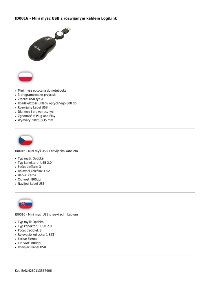ID0016 - Mini mysz USB z rozwijanym kablem LogiLink ● ● ● ● ● ● ● ● Mini mysz optyczna do notebooka 3 programowalne przyciski Złącze: USB typ A Rozdzielczość ukladu optycznego 800 dpi Rozwijany kabel USB Dla lewo i prawo ręcznych Zgodność z: Plug and Play Wymiary: 90x50x35 mm ID0016 - Mini myš USB s navíjecím kabelem ● ● ● ● ● ● ● Typ myši: Optická Typ konektoru: USB 2.0 Počet tlačítek: 3 Rolovací kolečko: 1 SZT Barva: černá Citlivost: 800dpi Navíjecí kabel USB ID0016 - Mini myš USB s rozvíjacím káblom ● ● ● ● ● ● ● Typ myši: Optická Typ konektoru: USB 2.0 Počet tlačidiel: 3 Rolovacie koliesko: 1 SZT Farba: čierna Citlivosť: 800dpi Rozvíjací kábel USB Kod EAN:4260113567906