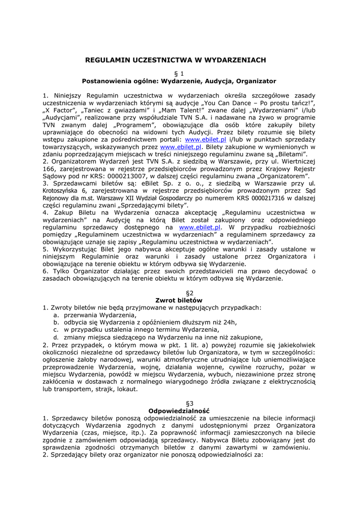 REGULAMIN UCZESTNICTWA W WYDARZENIACH §1 Postanowienia ogólne: Wydarzenie, Audycja, Organizator 1. Niniejszy Regulamin uczestnictwa w wydarzeniach określa szczegółowe zasady uczestniczenia w wydarzeniach którymi są audycje „You Can Dance – Po prostu tańcz!”, „X Factor”, „Taniec z gwiazdami” i „Mam Talent!” zwane dalej „Wydarzeniami” i/lub „Audycjami”, realizowane przy współudziale TVN S.A. i nadawane na żywo w programie TVN zwanym dalej „Programem”, obowiązujące dla osób które zakupiły bilety uprawniające do obecności na widowni tych Audycji. Przez bilety rozumie się bilety wstępu zakupione za pośrednictwem portali: www.ebilet.pl i/lub w punktach sprzedaży towarzyszących, wskazywanych przez www.ebilet.pl. Bilety zakupione w wymienionych w zdaniu poprzedzającym miejscach w treści niniejszego regulaminu zwane są „Biletami”. 2. Organizatorem Wydarzeń jest TVN S.A. z siedzibą w Warszawie, przy ul. Wiertniczej 166, zarejestrowana w rejestrze przedsiębiorców prowadzonym przez Krajowy Rejestr Sądowy pod nr KRS: 0000213007, w dalszej części regulaminu zwana „Organizatorem”. 3. Sprzedawcami biletów są: eBilet Sp. z o. o., z siedzibą w Warszawie przy ul. Krotoszyńska 6, zarejestrowana w rejestrze przedsiębiorców prowadzonym przez Sąd Rejonowy dla m.st. Warszawy XII Wydział Gospodarczy po numerem KRS 0000217316 w dalszej części regulaminu zwani „Sprzedającymi bilety”. 4. Zakup Biletu na Wydarzenia oznacza akceptację „Regulaminu uczestnictwa w wydarzeniach” na Audycję na którą Bilet został zakupiony oraz odpowiedniego regulaminu sprzedawcy dostępnego na www.ebilet.pl. W przypadku rozbieżności pomiędzy „Regulaminem uczestnictwa w wydarzeniach” a regulaminem sprzedawcy za obowiązujące uznaje się zapisy „Regulaminu uczestnictwa w wydarzeniach”. 5. Wykorzystując Bilet jego nabywca akceptuje ogólne warunki i zasady ustalone w niniejszym Regulaminie oraz warunki i zasady ustalone przez Organizatora i obowiązujące na terenie obiektu w którym odbywa się Wydarzenie. 6. Tylko Organizator działając przez swoich przedstawicieli ma prawo decydować o zasadach obowiązujących na terenie obiektu w którym odbywa się Wydarzenie. §2 Zwrot biletów 1. Zwroty biletów nie będą przyjmowane w następujących przypadkach: a. przerwania Wydarzenia, b. odbycia się Wydarzenia z opóźnieniem dłuższym niż 24h, c. w przypadku ustalenia innego terminu Wydarzenia, d. zmiany miejsca siedzącego na Wydarzeniu na inne niż zakupione, 2. Przez przypadek, o którym mowa w pkt. 1 lit. a) powyżej rozumie się jakiekolwiek okoliczności niezależne od sprzedawcy biletów lub Organizatora, w tym w szczególności: ogłoszenie żałoby narodowej, warunki atmosferyczne utrudniające lub uniemożliwiające przeprowadzenie Wydarzenia, wojnę, działania wojenne, cywilne rozruchy, pożar w miejscu Wydarzenia, powódź w miejscu Wydarzenia, wybuch, niezawinione przez stronę zakłócenia w dostawach z normalnego wiarygodnego źródła związane z elektrycznością lub transportem, strajk, lokaut. §3 Odpowiedzialność 1. Sprzedawcy biletów ponoszą odpowiedzialność za umieszczenie na bilecie informacji dotyczących Wydarzenia zgodnych z danymi udostępnionymi przez Organizatora Wydarzenia (czas, miejsce, itp.). Za poprawność informacji zamieszczonych na bilecie zgodnie z zamówieniem odpowiadają sprzedawcy. Nabywca Biletu zobowiązany jest do sprawdzenia zgodności otrzymanych biletów z danymi zawartymi w zamówieniu. 2. Sprzedający bilety oraz organizator nie ponoszą odpowiedzialności za: a) przerwania Wydarzenia, b) odbycia się Wydarzenia z opóźnieniem dłuższym niż 24h, c) ustalenia innego terminu Wydarzenia, d) zmiany miejsca siedzącego na Wydarzeniu na inne niż zakupione, 3. Sprzedający bilety oświadczają, iż Wydarzenia są programami rejestrowanymi przez stację telewizyjną i sprzedający bilety nie ponoszą odpowiedzialności za jakiekolwiek utrudnienia spowodowane koniecznością zapewnienia prawidłowego zarejestrowania Wydarzenia. a) b) c) d) e) f) g) §4 Zasady uczestnictwa w Wydarzeniach 1. Sprzedający bilety i Organizator informują, iż Wydarzenia są programami transmitowanymi na żywo w telewizji i ze względu na wymogi takiej transmisji żąda się od Nabywców jako uczestników Wydarzeń absolutnego przestrzegania szczegółowych zasad i respektowania reguł wyznaczonych przez Organizatora. 2. Organizatorowi przysługują następujące uprawnienia: osoby nietrzeźwe lub pod wpływem środków odurzających nie zostaną wpuszczone na miejsce Wydarzenia lub zostaną z niego usunięte, osoby agresywne, wulgarne, awanturujące się lub zachowujące się niestosownie w inny sposób nie zostaną wpuszczone na miejsce Wydarzenia lub zostaną z niego usunięte, osoby nie stosujące się do poleceń i wytycznych Organizatora nie zostaną wpuszczone na miejsce Wydarzenia lub zostaną z niego usunięte, osoby których strój koliduje z ustalonymi zasadami rejestracji programu na potrzeby telewizji lub jest niewłaściwy z punktu widzenia charakteru Wydarzenia mogą ze względu na wymogi realizacji Wydarzenia dla telewizji zostać przesadzone na inne miejsce niż to, na które posiadają ważny bilet. W takim przypadku Organizator nie zwraca kosztów i/lub nie proponuje innych świadczeń ekwiwalentnych za zaistniałą zmianę, nie zostaną dopuszczone do uczestnictwa w Wydarzeniu osoby, które nie wyrażą zgody na wykorzystanie ich wizerunku w audycji telewizyjnej, osoby od których uzyskanie wymienionej wcześniej zgody nie będzie możliwe ze względu na brak zdolności do czynności prawnych i/lub brak przedstawiciela ustawowego uprawnionego do złożenia stosownego oświadczenia woli w jej imieniu. W określonych w zdaniu poprzedzającym zgodach Organizator jest uprawniony do żądania dokumentu potwierdzające wiek nabywcy, w przypadku zaistnienia konieczności zmiany miejsca wyni