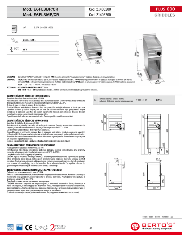 Mod. E6FL3BP/CR Mod. E6FL3MP/CR cm2 PLUS 600 GRIDDLES Cod. 21406200 Cod. 21406700 1.273 (mm 296 x 430) 290 / 23 3 600 5” 900 kW 4 35 3/8” TOT. 11 2/5” V 380-415 3N~ 300 11 4/5” conexión eléctrica - conexão eléctrica połączenie elektryczne - электрическое соединение CARACTERÍSTICAS TÉCNICAS e FUNCIONAIS Superfície de trabalho de aço inox AISI 304. Resistências de aço incoloy colocadas sob a chapa de cozedura. Controlo termostático e termostato de segurança com rearmamento manual. Regulação da temperatura de 50°C. a 270°C. Luz de linha e luz de indicação de temperatura alcançada. Chapa LISA com revestimento cromado duro e resguardo anti-salpicos nivelado, para uma superfície brilhante e fácil de limpar, com baixo nível de radiação térmica, para garantir maior conforto ao utilizador. Superfície de cozedura levemente inclinada com furo de descarga de grandes dimensões e transporte para um recipiente específico estanque. Indicada especialmente para cozeduras delicadas. Pés reguláveis (versão com móvel). kW 4 V 380-415 3N~ 55 410 290 120 E 300 11 4/5” 120 Superficie de trabajo de acero inoxidable AISI 304. Resistencias de acero Incoloy situadas debajo de la plancha de cocción. Control termostático y termostato de seguridad de rearme manual. Regulación de la temperatura de 50°C a 270°C. Testigo de paso y testigo de alcance de temperatura. Plancha LISA con revestimiento de cromo duro con protección antisalpicaduras en el borde para una superficie brillante y fácil de limpiar, con un nivel de radiación del calor bajo que garantiza mayor comodidad al operador. Superficie de cocción ligeramente inclinada con orificio de desagüe de gran tamaño y transporte a un recipiente estanco específico. Especialmente indicado para cocciones delicadas. Patas regulables (modelo con mueble). / CARACTERÍSTICAS TÉCNICAS y FUNCIONALES 23 3 ESTÁNDAR / PADRÃO / STANDARD / СТАНДАРТ PAR (modelos con mueble / modelos com móvel / modele z obudową / модели со столом). 1P30 puerta con manilla moldeada grosor 20/10 para los modelos con mueble / 1P30 porta com puxador moldado de espessura 20/10 para os modelos com móvel / drzwiczki 1P30 z odlewanym uchwytem o grubości 20/10 dla modeli z obudową / 1P30 дверь со штампованной ручкой толщиной 20/10 для моделей со шкафом. V3/A 230 - 240 3 ~ VOLTIOS / VOLTS / VOLT / ВОЛЬТ ACCESORIOS - ACESSÓRIOS - AKCESORIA - АКСЕССУАРЫ SPL - TPTO - CG6F - KRF6 (modelos con mueble / modelos com móvel / modele z obudową / модели со столом). 600 5” STANDARD OPTIONAL 880 900 1020 E Płaszczyzna robocza ze stali nierdzewnej AISI 304. Rezystancje ze stali incoloy umieszczone pod płytą gotującą. Kontrola termostatyczna oraz awaryjny termostat uzbrajany ręcznie. Regulacja temperatury od 50°C. do 270°C. Lampka kontrolna linii i osiąganej temperatury. GŁADKA płyta z obiciem z twardego chromu, z osłonami przeciwbryzgowymi, zapewniająca gładką i łatwo czyszczoną powierzchnię, niski poziom promieniowania cieplnego zapewnia większy komfort operatora. Powierzchnia gotowania lekko pochylona, z otworem odprowadzającym o dużych rozmiarach oraz przewód odprowadzający ciecze bezpośrednio do szczelnego zbiornika. Szczególnie zalecana do gotowania potraw delikatnych. Nóżki nastawne (wersja z obudową). E 85 140 165 CHARAKTERYSTYKI TECHNICZNE I FUNKCJONALNE 15 50 E E 272 600 Рабочий стол из нержавеющей стали AISI 304. ТЭНы из стали сплава инколой, расположенные под варочной поверхностью. Контроль с помощью термостата и предохранительный термостат с ручным запуском. Регулировка температуры в диапазоне между 50°C. до 270°C. Линейный датчик и датчик достижения температуры. ГЛАДКАЯ пластина с отделкой из твердого хрома, с ленточной защитой от брызг, блестящая и легко чистящаяся, с низким уровнем излучения тепла, что гарантирует большую комфортность работы оператора. Слегка наклоненная варочная поверхность с крупным сливным отверстием и транспортером в герметично удерживающем жидкости контейнере. Особенно рекомендуется для деликатной готовки. Регулируемые ножки (версия со столом). 600 ТЕХНИЧЕСКИЕ и ФУНКЦИОНАЛЬНЫЕ ХАРАКТЕРИСТИКИ 300 300 escala - scale - échelle - Maßstab 1:20 41