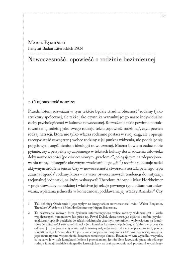 201 Marek Pąkciński Instytut Badań Literackich PAN Nowoczesność: opowieść o rodzinie bezimiennej 1. (Nie)obecność rodziny Przedmiotem rozważań w tym tekście będzie „trudna obecność” rodziny (jako struktury społecznej, ale także jako czynnika warunkującego nasze indywidualne cechy psychologiczne) w kulturze nowoczesnej. Rozważanie takie powinno potraktować samą rodzinę jako swego rodzaju tekst: „opowieść rodzinną”, czyli pewien rodzaj narracji, która nie tylko włącza rodzinne postaci w swój krąg, ale i opisuje rzeczywistość zewnętrzną wobec rodziny z jej punktu widzenia, nie poddając się pojęciowym uogólnieniom ideologii nowoczesnej. Można bowiem zadać sobie pytanie, czy z perspektywy zapisanego w tekstach kultury doświadczenia człowieka doby nowoczesności (po oświeceniowym „przełomie”, polegającym na zdeprecjonowaniu mitu, a następnie aktywnym zwalczaniu jego „sił”1) rodzina pozostaje nadal aktywnym źródłem sensu? Czy w nowoczesności stworzona została pewnego typu „czarna legenda” rodziny, która – na wzór oświeceniowych tendencji do mityzacji racjonalnej jednostki, na które wskazywali Theodore Adorno i Max Horkheimer – projektowałaby na rodzinę i właściwe jej relacje pewnego typu odium warunkowania, wplatania jednostki w konieczność, poddawania jej władzy Ananke?2 Czy 1 2 Tak definiują Oświecenie i jego wpływ na imaginarium nowoczesności m.in.: Walter Benjamin, Theodore W. Adorno i Max Horkheimer czy Jürgen Habermas. To nastawienie różnych form dyskursu interpretacyjnego wobec rodziny widoczne jest u wielu współczesnych humanistów. Jak pisze np. Paweł Dybel, charakteryzując ogólnie i trafnie psychoanalityczny sposób podejścia do relacji rodzinnych: „istotnym czynnikiem wpływającym na kształtowanie tożsamości seksualnej dziecka jest kontekst kulturowo-społeczny, w jakim ów proces się odbywa. […] w procesie tym niezwykle istotną rolę odgrywają od samego początku inni, przede wszystkim ci, z którymi dziecko jest silnie emocjonalnie związane i z którymi najczęściej wiążą się jego traumatyczne wspomnienia dotyczące wczesnego okresu. Również w tym wypadku wszystko, co napawa je w tych kontaktach lękiem i przerażeniem, jest źródłem kreowania przez nie różnego rodzaju fantazji: rodzicielskie groźby kastracji, kary za brak panowania nad procesami wydalniczy- I • Rozprawy i materiały 202 ta „czarna legenda” – jeśli istnieje – może być projekcją tendencji mityzujących samej nowoczesności (emancypacji w wersji „mitycznej”, przedstawiającej upodmiotowienie zgodnie z religijnym paradygmatem „zbawienia ludzkiej duszy”)? Czy – wreszcie – indywidualizująca tendencja nowoczesności, wytwarzająca w efekcie „pusty” podmiot („konstytutywny brak w łańcuchu znaczących”, by posłużyć się określeniem Lacana), sama w pewnej mierze pasożytuje na fantazmatycznej treści relacji rodzinnych, podstawiając w ich miejsce struktury instytucjonalne?3 Ujęcie tak szerokiego tematu musi być z konieczności skrótowe i bardzo wybiórcze. Musi ono również korzystać w pewnej mierze z ustaleń i diagnoz antropologii, filozofii czy psychologii. Potraktowanie rodziny jako rozpadającego się „splotu znaczeń”, wokół którego krąży nowoczesność w dwuznacznym wysiłku zarazem podtrzymania, jak i destrukcji rodziny wymaga postrzegania „władzy poszukiwania i rozpoznawania pokrewieństw” jako elementu spektrum możliwości człowieka, którymi dysponował od zarania dziejów kultury, choć w zmiennym historycznie kształcie. Taką możliwość stwarza między innymi rozwój antropologii kognitywistycznej, zwłaszcza w tym zakresie, w którym zajmuje się ona tak zwanymi metareprezentacjami, czyli reprezentacjami innych reprezentacji, stanowiących nadrzędny element (nie tylko ludzkiej, ale i zwierzęcej) kompetencji porządkowania świata. Według kognitywistów zdolność tworzenia „metareprezentacji” jest właściwością (przede wszystkim, jeśli nie jedynie) człowieka. Jest ona ponadto „przed-językowa”, a zatem nie dotyczą jej założenia i dogmaty wyraźnie lingwistycznie (lub strukturalistycznie) nastawionego dyskursu psychoanalitycznego. Zdaniem Dana Sperbera (i innych kognitywistów, na przykład Alvina I. Goldmana) ludzka zdolność tworzenia metareprezentacji dotyczy w znaczniej mierze właśnie wyobrażeń na temat przekonań i pragnień innych ludzi, na czym wspiera się struktura ludzkich związków. Można zatem, ich zdaniem, mówić o pewnego typu „popularnej psychologii”, rozwijającej się spontanicznie w procesie socjalizacji (pojęcie to odpowiadałoby w pewnej mierze filozoficznej kategorii „zdrowego rozsądku”): »» Ludzie uprawiają swego rodzaju spontaniczną psychologię. Przypisują oni innym wiele rodzajów intencjonalnych nastawień: wierzeń, 3 mi, podpatrzone sceny z rodzicielskiej alkowy, narodziny młodszego rodzeństwa czy wreszcie sceny seksualnego molestowania i gwałtu” (zob. P. Dybel, Freud i seksualność, w: Freud i nowoczesność, red. Z. Rosińska, J. Michalik, P. Bursztyka, Kraków 2008). Widać wyraźnie, że brak tu miejsca na taki obraz rodziny, który nie byłby obarczony traumą, a zatem – na „opowieść rodzinną”, którą od stuleci snuła np. literatura polska. Taką interpretację świata wyobraźni Franza Kafki przedstawił Walter Benjamin: „Stosunki panujące w urzędzie i w rodzinie mają u Kafki wiele punktów stycznych.” (zob. W. Benjamin, Konstelacje. Wybór tekstów, tłum. A. Lipszyc i A. Wołkowicz, wstęp A. Lipszyc, Kraków 2012, s. 229). Marek Pąkciński Nowoczesność: opowieść o rodzinie bezimiennej 203 przeczuć, opinii, pragnień, lęków, zamiarów i tak dalej. Filozofowie opisali podstawowe założenia tej „popularnej psychologii”, a także rozważali jej wartość. […] Uważam za coraz bardziej inspirujące rozważanie tyc