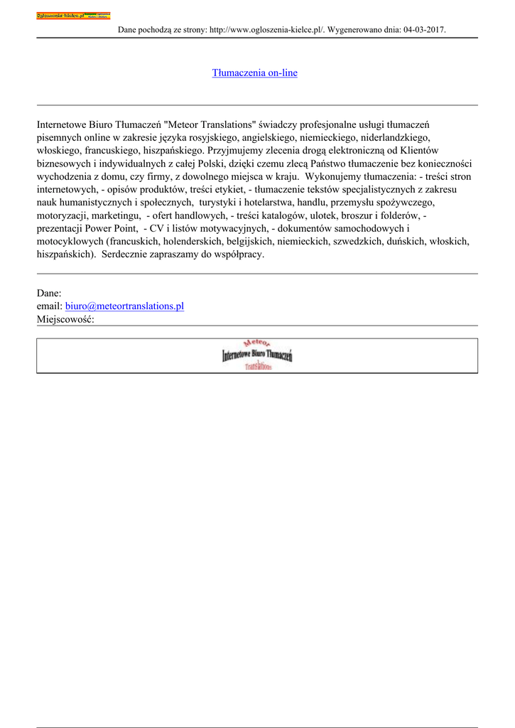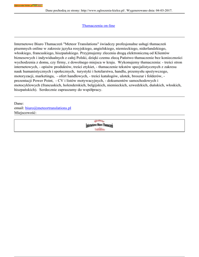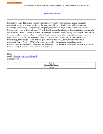 Dane pochodzą ze strony: http://www.ogloszenia-kielce.pl/. Wygenerowano dnia: 04-03-2017. Tłumaczenia on-line Internetowe Biuro Tłumaczeń "Meteor Translations" świadczy profesjonalne usługi tłumaczeń pisemnych online w zakresie języka rosyjskiego, angielskiego, niemieckiego, niderlandzkiego, włoskiego, francuskiego, hiszpańskiego. Przyjmujemy zlecenia drogą elektroniczną od Klientów biznesowych i indywidualnych z całej Polski, dzięki czemu zlecą Państwo tłumaczenie bez konieczności wychodzenia z domu, czy firmy, z dowolnego miejsca w kraju. Wykonujemy tłumaczenia: - treści stron internetowych, - opisów produktów, treści etykiet, - tłumaczenie tekstów specjalistycznych z zakresu nauk humanistycznych i społecznych, turystyki i hotelarstwa, handlu, przemysłu spożywczego, motoryzacji, marketingu, - ofert handlowych, - treści katalogów, ulotek, broszur i folderów, prezentacji Power Point, - CV i listów motywacyjnych, - dokumentów samochodowych i motocyklowych (francuskich, holenderskich, belgijskich, niemieckich, szwedzkich, duńskich, włoskich, hiszpańskich). Serdecznie zapraszamy do współpracy. Dane: email: [email protected] Miejscowość: