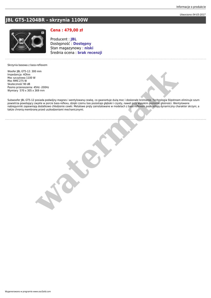 Informacje o produkcie Utworzono 04-03-2017 JBL GT5-1204BR - skrzynia 1100W Cena : 479,00 zł Producent : JBL Dostępność : Dostępny Stan magazynowy : niski Średnia ocena : brak recenzji Woofer JBL GT5-12: 300 mm Impedancja: 4Ohm Moc szczytowa 1100 W Moc RMS 275 W Skuteczność 90 dB Pasmo przenoszenia: 45Hz -200Hz Wymiary 570 x 305 x 369 mm er m ar k Skrzynia basowa z bass-reflexem w at Subwoofer JBL GT5-12 posiada podwójny magnes i wentylowaną cewkę, co gwarantuje dużą moc i doskonałe brzmienie. Technologia Slipstream eliminuje szum powietrza powstający zwykle w porcie bass-reflexu, dzięki czemu bas pozostaje głęboki i czysty, nawet przy wysokim poziomie głośności. Wentylowane nabiegunniki zapewniają dodatkowe chłodzenie cewki. Metalowe pręty zainstalowane w modelach z bass-reflexem podkreślają dynamiczny charakter skrzyni, a także chronią membranę przed uszkodzeniami mechanicznymi. Wygenerowano w programie www.oscGold.com