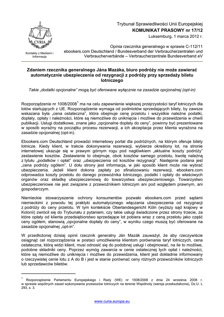 Trybunał Sprawiedliwości Unii Europejskiej KOMUNIKAT PRASOWY nr 17/12 Luksemburg, 1 marca 2012 r. Kontakty z Mediami i Informacja Opinia rzecznika generalnego w sprawie C-112/11 ebookers.com Deutschland / Bundesverband der Verbraucherzentralen und Verbraucherverbände – Verbraucherzentrale Bundesverband eV Zdaniem rzecznika generalnego Jána Mazáka, biuro podróży nie może zawierać automatycznie ubezpieczenia od rezygnacji z podróży przy sprzedaży biletu lotniczego Takie „dodatki opcjonalne” mogą być oferowane wyłącznie na zasadzie opcjonalnej (opt-in) 1 Rozporządzenie nr 1008/2008 ma na celu zapewnienie większej przejrzystości taryf lotniczych dla lotów startujących z UE. Rozporządzenie wymaga od podmiotów sprzedających bilety, by zawsze wskazana była „cena ostateczna”, która obejmuje cenę przelotu i wszystkie należne podatki, dopłaty, opłaty i należności, które są niemożliwe do uniknięcia i możliwe do przewidzenia w chwili publikacji. Usługi dodatkowe, znane jako „opcjonalne dopłaty do ceny”, powinny być prezentowane w sposób wyraźny na początku procesu rezerwacji, a ich akceptacja przez klienta wyrażona na zasadzie opcjonalnej (opt-in). Ebookers.com Deutschland prowadzi internetowy portal dla podróżnych, na którym oferuje bilety lotnicze. Kiedy klient, w trakcie dokonywania rezerwacji, wybierze określony lot, na stronie internetowej ukazuje się w prawym górnym rogu pod nagłówkiem „aktualne koszty podróży” zestawienie kosztów. Zestawienie to obejmuje, obok kosztów samego przelotu, kwotę należną z tytułu „podatków i opłat” oraz „ubezpieczenia od kosztów rezygnacji”. Następnie podana jest „cena podróży ogółem”. U dołu strony jest informacja, w jaki sposób klient może nie wybrać ubezpieczenia. Jeżeli klient dokona zapłaty po sfinalizowaniu rezerwacji, ebookers.com odprowadza koszty przelotu do danego przewoźnika lotniczego, podatki i opłaty do właściwych organów oraz składkę ubezpieczeniową do towarzystwa ubezpieczeniowego. Towarzystwo ubezpieczeniowe nie jest związane z przewoźnikiem lotniczym ani pod względem prawnym, ani gospodarczym. Niemieckie stowarzyszenie ochrony konsumentów pozwało ebookers.com przed sądami niemieckimi z powodu tej praktyki automatycznego włączania ubezpieczenia od rezygnacji z podróży do ceny przelotu. W tym kontekście Oberlandesgericht Köln (wyższy sąd krajowy w Kolonii) zwrócił się do Trybunału z pytaniem, czy takie usługi świadczone przez strony trzecie, za które opłaty od klienta przedsiębiorstwo sprzedające lot pobiera wraz z ceną przelotu jako część ceny ogółem, stanowią „opcjonalne dopłaty do ceny”, w wyniku czego muszą być oferowane na zasadzie opcjonalnej „opt-in”. W przedłożonej dzisiaj opinii rzecznik generalny Ján Mazák zauważył, że aby rzeczywiście osiągnąć cel rozporządzenia w postaci umożliwienia klientom porównania taryf lotniczych, cena ostateczna, którą widzi klient, musi odnosić się do podobnej usługi i obejmować, na ile to możliwe, podobne składniki ceny. Poprzez wymóg zawarcia w cenie ostatecznej tych opłat i należności, które są niemożliwe do uniknięcia i możliwe do przewidzenia, klient jest dokładnie informowany o rzeczywistej cenie lotu z A do B i jest w stanie porównać ceny różnych przewoźników lotniczych lub sprzedawców biletów. 1 Rozporządzenie Parlamentu Europejskiego i Rady (WE) nr 1008/2008 z dnia 24 września 2008 r. w sprawie wspólnych zasad wykonywania przewozów lotniczych na terenie Wspólnoty (wersja przekształcona), Dz.U. L 293, s. 3. www.curia.europa.eu Dla celów porównawczych, nie można natomiast postrzegać „dopłat do ceny” jako stanowiących część ceny ostatecznej. Z definicji są one opcjonalne – to znaczy są „dodatkami”, które klient może wybrać lub nie. Gdyby takie opcjonalne dodatki należało uznać za część ceny ostatecznej, podważałoby to zasadę umożliwienia porównania takich cen, gdyż ceny mogłyby się odnosić do znacznie różniących się usług. Niemniej jednak, rzecznik generalny uważa, że wymóg, by te opcjonalne dopłaty do ceny były dostępne na zasadzie wyboru „opt-in”, a nie odrzucenia „opt-out”, służy innemu celowi niż zapewnienie porównania cen, a mianowicie celowi ochrony konsumenta. Chroni on klientów przed skłonieniem ich do zapłaty za niepotrzebne usługi w trakcie rezerwacji lotu, chyba że aktywnie i wyraźnie wybiorą oni takie dodatkowe oferty i ceny, które za nie należy zapłacić. Rzecznik generalny Mazák stwierdził, że aby osiągnąć ten cel, cena za usługę taką jak ubezpieczenie od rezygnacji z podróży, które jest oferowane i rezerwowane w związku z przelotem, powinna być objęta pojęciem „opcjonalne dopłaty do ceny” i jako taka prezentowana na zasadzie wyboru „opt-in”. Rzecznik generalny Mazák podkreślił w końcu, że fakt, iż usługi świadczone są przez strony trzecie, jest bez znaczenia. Byłoby sprzeczne z celem ochrony konsumenta, gdyby ochrona ta miała zależeć od tego, czy usługa opcjonalna pochodzi od przewoźnika lotniczego, czy też od odrębnego prawnie przedsiębiorstwa, albo od tego, czy usługa ta stanowi nieodłączną część umowy przewozu lotniczego. Jego zdaniem, kwestią rozstrzygającą nie jest fakt, że dana dopłata do ceny pochodzi od przewoźnika lotniczego lub związanej z nim agencji lub że płacona jest ona, mówiąc wprost, w zamian za usługi przewozu lotniczego, lecz raczej fakt, że usługa opcjonalna i jej cena są oferowane w związku z usługą przewozu lotniczego i może być zarezerwowana w tym samym procesie. Rzecznik generalny stwierdził w konsekwencji, że usługi takie jak ubezpieczenie od rezygnacji z podróży oferowane w trakcie rezerwowania lotu muszą być prezentowane klientowi na zasadzie wyboru „opt-in”, niezależnie od tego, czy usługa ta oferowana jest przez st