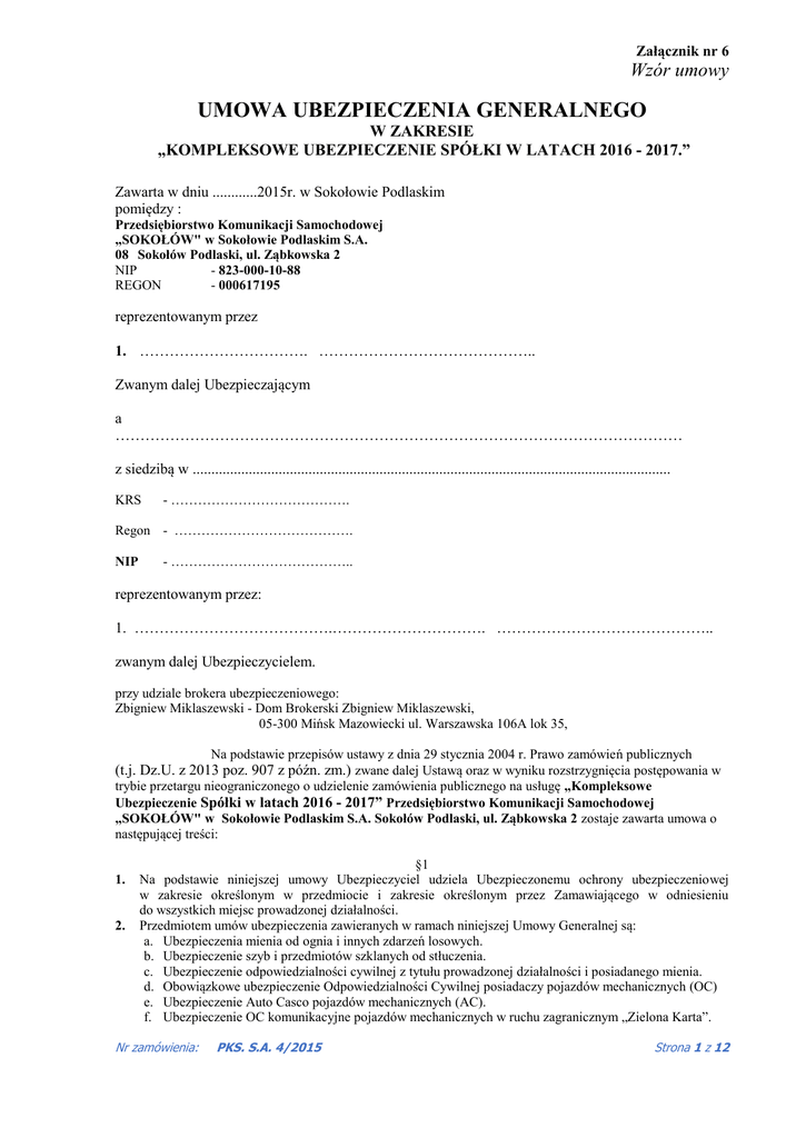Załącznik nr 6 Wzór umowy UMOWA UBEZPIECZENIA GENERALNEGO W ZAKRESIE „KOMPLEKSOWE UBEZPIECZENIE SPÓŁKI W LATACH 2016 - 2017.” Zawarta w dniu ............2015r. w Sokołowie Podlaskim pomiędzy : Przedsiębiorstwo Komunikacji Samochodowej „SOKOŁÓW" w Sokołowie Podlaskim S.A. 08 Sokołów Podlaski, ul. Ząbkowska 2 NIP - 823-000-10-88 REGON - 000617195 reprezentowanym przez 1. ……………………………. …………………………………….. Zwanym dalej Ubezpieczającym a …………………………………………………………………………………………………… z siedzibą w ................................................................................................................................ KRS - …………………………………. Regon - …………………………………. NIP - ………………………………….. reprezentowanym przez: 1. ………………………………….…………………………. …………………………………….. zwanym dalej Ubezpieczycielem. przy udziale brokera ubezpieczeniowego: Zbigniew Miklaszewski - Dom Brokerski Zbigniew Miklaszewski, 05-300 Mińsk Mazowiecki ul. Warszawska 106A lok 35, Na podstawie przepisów ustawy z dnia 29 stycznia 2004 r. Prawo zamówień publicznych (t.j. Dz.U. z 2013 poz. 907 z późn. zm.) zwane dalej Ustawą oraz w wyniku rozstrzygnięcia postępowania w trybie przetargu nieograniczonego o udzielenie zamówienia publicznego na usługę „Kompleksowe Ubezpieczenie Spółki w latach 2016 - 2017” Przedsiębiorstwo Komunikacji Samochodowej „SOKOŁÓW" w Sokołowie Podlaskim S.A. Sokołów Podlaski, ul. Ząbkowska 2 zostaje zawarta umowa o następującej treści: 1. 2. §1 Na podstawie niniejszej umowy Ubezpieczyciel udziela Ubezpieczonemu ochrony ubezpieczeniowej w zakresie określonym w przedmiocie i zakresie określonym przez Zamawiającego w odniesieniu do wszystkich miejsc prowadzonej działalności. Przedmiotem umów ubezpieczenia zawieranych w ramach niniejszej Umowy Generalnej są: a. Ubezpieczenia mienia od ognia i innych zdarzeń losowych. b. Ubezpieczenie szyb i przedmiotów szklanych od stłuczenia. c. Ubezpieczenie odpowiedzialności cywilnej z tytułu prowadzonej działalności i posiadanego mienia. d. Obowiązkowe ubezpieczenie Odpowiedzialności Cywilnej posiadaczy pojazdów mechanicznych (OC) e. Ubezpieczenie Auto Casco pojazdów mechanicznych (AC). f. Ubezpieczenie OC komunikacyjne pojazdów mechanicznych w ruchu zagranicznym „Zielona Karta”. Nr zamówienia: PKS. S.A. 4/2015 Strona 1 z 12 g. Ubezpieczenia Następstw Nieszczęśliwych Wypadków kierowcy i pasażerów (NNW) 3. W przypadku konieczności zawarcia umów uzupełniających dla konkretnych rodzajów ubezpieczeń sporządzone zostaną odpowiednie aneksy określające szczegółowo przedmiot, zakres i termin udzielanej ochrony ubezpieczeniowej. Wszelkie ubezpieczenia uzupełniające kalkulowane będą w/g stawek określonych w załączniku nr 1 do umowy. §2 1. Niniejsza Umowa Generalna zawarta zostaje na okres 12 miesięcy, od dnia 01.12.2016 do dnia 31.12.2017, 2. Ubezpieczyciel wystawi polisy ubezpieczeniowe potwierdzające zawarcie umów ubezpieczenia. 3. W przypadku ubezpieczenia wchodzącego w trakcie roku kalendarzowego Ubezpieczyciel wystawi polisę od dnia zgłoszenia do dnia kończącego roczny okres obowiązywania ubezpieczenia. 4. Na ubezpieczenie pojazdów Ubezpieczyciel wystawi polisę zbiorową na wszystkie pojazdy oraz potwierdzenia ubezpieczenia OC dla każdego pojazdu indywidualnie upoważniające do okazywania organom kontrolującym potwierdzające fakt ich zawarcia. 5. Wraz z zakończeniem okresu obowiązywania umowy wszelkie polisy zostaną rozwiązanie bez konieczności oddzielnego wypowiadania poszczególnych polis, jeżeli taki obowiązek istnieje. 1. 2. 3. 1. 2. 3. 1. 2. §3 Zakres ubezpieczeń zawartych w niniejszej Umowie Generalnej określony jest szczegółowo w załączniku nr 1 do niniejszej umowy, ponadto do poszczególnych rodzajach ubezpieczeń będą miały zastosowanie postanowienia ustaw i ogólnych warunków ubezpieczenia: a. OWU …………………………………………………………………………………………….. b. OWU …………………………………………………………………………………………….. c. OWU …………………………………………………………………………………………….. d. OWU …………………………………………………………………………………………….. e. OWU …………………………………………………………………………………………….. Wszelkie warunki określone w niniejszej Umowie Generalnej mają pierwszeństwo przed postanowieniami zawartymi w ogólnych warunkach ubezpieczenia. Strony ustalają, że w razie rozbieżności pomiędzy warunkami ubezpieczenia wynikającymi z w/w postanowień strony przyjmą do stosowania takie rozwiązanie, które będzie korzystniejsze dla Ubezpieczonego. Ubezpieczyciel przyjmuje do stosowania klauzule obligatoryjne, fakultatywne, franszyzy i udziały własne oraz stawki i składki określone w załącznikach nr 1 i 2 do niniejszej umowy. . §4 Składka za udzielaną ochronę ubezpieczeniową podzielona zostaje na 4 raty Składki płacone będą w terminach a) 1 rata do dnia 31.03.2016 (31.03.2017) b) 2 rata do dnia 30.06.2016 (30.06.2017) c) 3 rata do dnia 30.09.2016 (30.09.2017) d) 4 rata do dnia 24.12.2016 (24.12.2017) Doubezpieczenia zawierane w trakcie trwania umowy kalkulowane będą na bazie stawek określonych w załączniku nr 2. §5 Przy zawieraniu kolejnych umów ubezpieczenia przy naliczaniu składek i aktualizacji umów ubezpieczenia, obowiązywać będą Ogólne warunki Ubezpieczenia obowiązujące w dniu zawarcia Umowy Generalnej chyba, że wydane nowe Ogólne Warunki Ubezpieczenia przyjęte przez Ubezpieczyciela są b