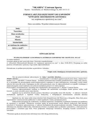 "SKARPA" Centrum Sportu Bytom – Szombierki, ul. Modrzewskiego 5a, 601-14-11-11 FORMULARZ ZGŁOSZENIOWY DO ZAWODÓW "OTWARTE MISTRZOSTWA BYTOMIA we wspinaczce sportowej na czas". Dane zawodnika. Wypełnić drukowanymi literami Imię: Nazwisko: Data urodzenia: Pesel: Miasto: Szkoła/klub: nr telefonu do rodziców: Adres e-mail*: OŚWIADCZENIE WYPEŁNIA RODZIC LUB OPIEKUN, KTÓREGO ZAWODNIK NIE UKOŃCZYŁ 18 LAT Ja (rodzic/opiekun)…………………………………………........................................................................................... wyrażam zgodę na start syna/córki Imię i Nazwisko niepełnoletniego ………………................................................... w „Otwartych Mistrzostwach Bytomia we wspinaczce sportowej na czas” w dniu 18.06.2013r. Przyjmuję na siebie poniższe oświadczenie i ponoszę z tego tytułu odpowiedzialność. Oświadczam, że podane powyżej dane są prawdziwe i aktualne. …………………………………………………………………… Podpis osoby składającej oświadczenie(rodzic, opiekun). Nie ma przeciwwskazań zdrowotnych, by (imię i nazwisko dziecka)................................................................ PESEL dziecka: …............................................. uczestniczył/a w zawodach organizowanych przez firmę „Natura-Flos” Spółka z o.o. - „SKARPA” Centrum Sportu. Zostałem poinformowany/zostałam poinformowana i zdaję sobie sprawę, że w przypadku nie przestrzegania zasad bezpieczeństwa wspinanie to sport niebezpieczny, stwarzający ryzyko utraty zdrowia lub życia dla osoby wspinającej się lub osób postronnych oraz, że odpowiedzialność za wypadki wynikające z nieprzestrzegania zasad wspinania oraz poleceń instruktora ponosi w/w rodzic/opiekun. Przeczytałem, zrozumiałem/am i akceptuję treść regulaminów obowiązujących w „Skarpa” Centrum Sportu. Ponoszę odpowiedzialność osobistą za działania lub zachowanie wywołujące skutki prawne wobec osób trzecich, w czasie zawodów przez moje dziecko. Zgadzam się na udzielenie dziecku pomocy lekarskiej w przypadku urazu lub choroby – w zakresie i formach niezbędnych, zgodnych z regułami wiedzy medycznej, z następującym zastrzeżeniem: (choroba dziecka) …........................................................................................................................................ Zgadzam się, aby moja osoba (moje dziecko) była fotografowana lub filmowana a fotografie, filmy były przez organizatorów wykorzystywane publicznie w celach zgodnych z etyką i przepisami prawa. Jednocześnie przyjmuję do wiadomości, że jedynie poprawnie i kompletnie wypełniony formularz jest podstawą do rejestracji w zawodach. Niniejszym wyrażam zgodę na przetwarzanie moich danych osobowych (lub dziecka) zawartych w formularzu zgłoszeniowym, w zakresie niezbędnym dla przeprowadzenia zawodów. Podanie powyższych informacji ma charakter dobrowolny. Oświadczam również, że podane dane są aktualne i prawdziwe, a tekst powyższy przeczytałem i rozumiem jego treść. Przez podpisanie niniejszego formularza, akceptuję warunki uczestnictwa w zawodach. *Wyrażam zgodę na otrzymywanie informacji oraz ofert drogą elektroniczną.