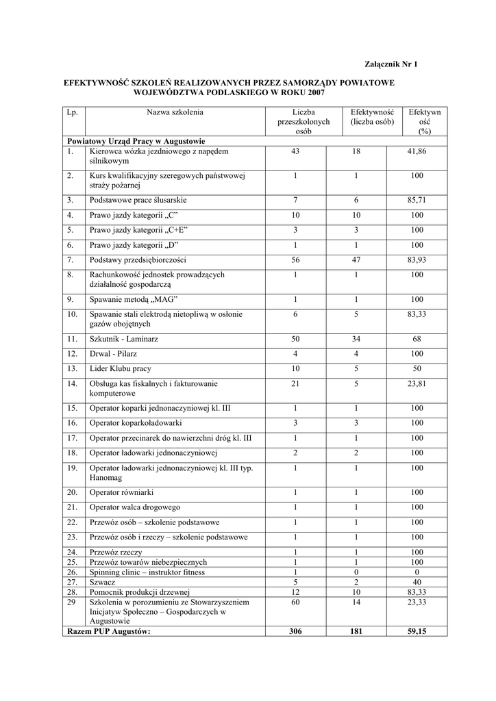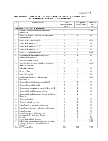 Załącznik Nr 1 EFEKTYWNOŚĆ SZKOLEŃ REALIZOWANYCH PRZEZ SAMORZĄDY POWIATOWE WOJEWÓDZTWA PODLASKIEGO W ROKU 2007 Lp. Nazwa szkolenia Liczba przeszkolonych osób Efektywność (liczba osób) Efektywn ość (%) Powiatowy Urząd Pracy w Augustowie 1. Kierowca wózka jezdniowego z napędem silnikowym 43 18 41,86 2. Kurs kwalifikacyjny szeregowych państwowej straŜy poŜarnej 1 1 100 3. Podstawowe prace ślusarskie 7 6 85,71 4. Prawo jazdy kategorii „C” 10 10 100 5. Prawo jazdy kategorii „C+E” 3 3 100 6. Prawo jazdy kategorii „D” 1 1 100 7. Podstawy przedsiębiorczości 56 47 83,93 8. Rachunkowość jednostek prowadzących działalność gospodarczą 1 1 100 9. Spawanie metodą „MAG” 1 1 100 10. Spawanie stali elektrodą nietopliwą w osłonie gazów obojętnych 6 5 83,33 11. Szkutnik - Laminarz 50 34 68 12. Drwal - Pilarz 4 4 100 13. Lider Klubu pracy 10 5 50 14. Obsługa kas fiskalnych i fakturowanie komputerowe 21 5 23,81 15. Operator koparki jednonaczyniowej kl. III 1 1 100 16. Operator koparkoładowarki 3 3 100 17. Operator przecinarek do nawierzchni dróg kl. III 1 1 100 18. Operator ładowarki jednonaczyniowej 2 2 100 19. Operator ładowarki jednonaczyniowej kl. III typ. Hanomag 1 1 100 20. Operator równiarki 1 1 100 21. Operator walca drogowego 1 1 100 22. Przewóz osób – szkolenie podstawowe 1 1 100 23. Przewóz osób i rzeczy – szkolenie podstawowe 1 1 100 Przewóz rzeczy Przewóz towarów niebezpiecznych Spinning clinic – instruktor fitness Szwacz Pomocnik produkcji drzewnej Szkolenia w porozumieniu ze Stowarzyszeniem Inicjatyw Społeczno – Gospodarczych w Augustowie Razem PUP Augustów: 1 1 1 5 12 60 1 1 0 2 10 14 100 100 0 40 83,33 23,33 306 181 59,15 24. 25. 26. 27. 28. 29 Powiatowy Urząd Pracy w Białymstoku 1 Kurs kwalifikacyjny szeregowych Państwowej StraŜy PoŜarnej 2 Nauka i zasady szycia bielizny damskiej gorseciarstwo 3 Kucharz 4 Kucharz z kasą fiskalną 5 Technolog robót budowlanych wykończeniowych 6 Stylizacja paznokci, WizaŜ i stylizacja, Stylizacja osoby, Stylizacja sylwetki z wizaŜem, Pielęgnacja i stylizacja dłoni i stóp 7 Kurs kosmetyczny 8 Zdobienie paznokci 9 Dekarz 10 Spawanie (metodą: 111, MAG-135, TIG-141) 11 Spawacz stali niestopowych elektrodą topliwą w osłonie gazów aktywnych 12 Eksploatacja urządzeń elektroenergetycznych 13 Magazynier 14 Glazurnik-posadzkarz-malarz 15 Obsługa kotłów parowych i wodnych na paliwa stałe i ciekłe 16 Obsługa kotłów parowych na paliwa stałe, ciekłe i gazowe 17 Kierowca wózków jezdniowych z napędem silnikowym 18 Kierowca wózków jezdniowych 19 Profesjonalne techniki sprzedaŜy 20 Obsługa kasy fiskalnej 21 Obsługa komputera z róŜnymi programami uŜytkowymi (grafika komputerowa, tworzenie stron WWW, projektowanie stron WWW obsługa programu Płatnik, kosztorysowanie, Internet, fakturowanie komputerowe, programy biurowe, AutoCAD) oraz administrowanie sieciami i bazami danych (Novell NetWar, Windows 2003, OPTIMA) 22 Tworzenie stron www z grafiką komputerową 23 Księgowość komputerowa 24 Opieka nad dziećmi i osobami niepełnosprawnymi 25 Języki obce (język angielski, język niemiecki) 26 Język angielski w gastronomii i handlu 27 Bukieciarz - florysta 28 Samodzielnych księgowych bilansistów 29 Finanse i rachunkowość podmiotów gospodarczych 30 Rachunkowość, kadry, płace 31 Podstawy rachunkowości 32 Podstawy księgowości z elementami księgowości budŜetowej; księgowość od A do Z 33 Asystent personalno - księgowy 34 Asystentka dyrektora z modułem językowym 35 Asystent administracyjno - finansowy 36 Obsługa kadr z umiejętnością naliczania płac i przekazem elektronicznym Płatnik; specjalista do spraw kadr i płac 37 Kompleksowa obsługa biura 9 11 9 8 100 72,73 16 7 18 4 4 4 25,00 57,14 22,22 27 6 8 7 85 1 4 4 0 3 52 1 14,81 66,67 0 42,86 61,18 100 19 29 10 3 11 16 2 2 57,89 55,17 20,00 66,67 1 1 100 134 98 73,13 11 40 4 8 36,36 20,00 6 1 16,67 105 21 20,00 7 2 4 69 10 25 2 9 4 0 0 22 2 8 2 6 57,14 0 0 31,88 20,00 32,00 100 66,67 9 1 1 1 11,11 100 23 7 30,43 10 9 28 24 3 1 5 16 30,00 11,11 17,86 66,67 31 7 22,58 38 39 40 41 42 Asystentka dyrektora Kelner – barman z językiem angielskim Mała gastronomia z obsługą bufetu, baru Pracownik produkcyjny w przemyśle mięsnym Specjalista do spraw pozyskiwania funduszy unijnych i zarządzania projektem 43 Kurs okresowy BHP dla pracowników słuŜb bhp 44 Prowadzenie działalności gospodarczej 45 Kasjer walutowo – złotowy 46 Kasjer-sprzedawca z modułem językowym 47 Pilot wycieczek 48 Prawo jazdy kat. C, C+E, D 49 Prawo jazdy kat. C+E 50 Prawo jazdy kategorii D (dla osób z kat.C) z nauką języka angielskiego) 51 Prawo jazdy kategorii C 52 Dokształcający kierowców wykonujących transport drogowy w zakresie przewozu osób i rzeczy (podstawowy i dodatkowy) 53 Kurs dokształcający kierowców wykonujących transport drogowy w zakresie części ogólnej i dodatkowej dla przewozu rzeczy 54 Przewóz materiałów niebezpiecznych ADR i cysterny 55 Instruktor nauki jazdy kat. B, C 56 Kurs kwalifikacyjny dla instruktorów nauki jazdy kat.B 57 Transport drogowy taksówką 58 Profesjonalna opiekunka 59 Pedagogiczny dla nauczycieli 60 Kurs przygotowawczy do egzaminu na certyfikat kompetencji zawodowych przewoźników drogowych 61 Przewóz osób taksówką 62 Operator koparki; koparko – ładowarki; ładowarki; węzła betoniarskiego; betoniarek; agregatu tynkarskiego; równiarki; walca drogowego 63 Operator spycharki kl. III 64 MontaŜysta rusztowań budowlano - montaŜowych, metalowych 65 Obsługa Ŝurawi przenośnych 66 Operator podestów ruchomych 67 Operator urządzeń do produkcji styropianu 68 Obsługa tokarek, frezarek sterowanych numerycznie CNC 69 Drwal – operator pilarki 70 MasaŜ 71 ABC biznesu 72 Napełnianie zbiorników LPG, Obsługa stacji auto – gaz, Sieci i instalacja urządzeń gazowych 73 Pracownik ochrony fizycznej osób i mienia 74 Instalacja, konserwacja systemów zabezpiecze