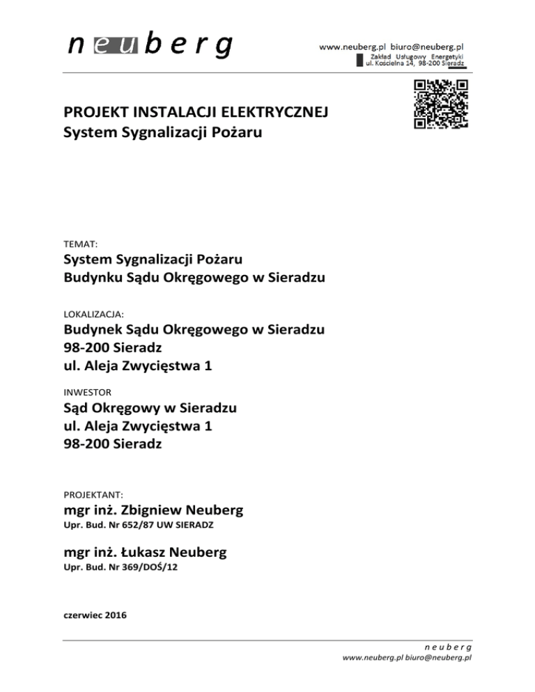 PROJEKT INSTALACJI ELEKTRYCZNEJ System Sygnalizacji Pożaru TEMAT: System Sygnalizacji Pożaru Budynku Sądu Okręgowego w Sieradzu LOKALIZACJA: Budynek Sądu Okręgowego w Sieradzu 98-200 Sieradz ul. Aleja Zwycięstwa 1 INWESTOR Sąd Okręgowy w Sieradzu ul. Aleja Zwycięstwa 1 98-200 Sieradz PROJEKTANT: mgr inż. Zbigniew Neuberg Upr. Bud. Nr 652/87 UW SIERADZ mgr inż. Łukasz Neuberg Upr. Bud. Nr 369/DOŚ/12 czerwiec 2016 neuberg www.neuberg.pl [email protected] SPIS TREŚCI A. Opis techniczny 1. Ogólna charakterystyka obiektu 2.1 Charakterystyka systemu sygnalizacji pożaru 2.2 Przeznaczenie centrali 2.3 Struktura 2.4 Architektura systemu SSP w budynku 2.6 Organizacja alarmowania 3 Czujniki systemu sygnalizacji pożaru 3.1 Adresowalna, optyczna czujka dymu 3.2 Adresowalna, wielostanowa uniwersalna czujka ciepła 3.3 Ręczny ostrzegacz pożarowy ROP 3.4 Moduł kontrolno sterujący EKS 3.5 Sygnalizator optyczno akustyczny 3.6 Sygnalizator optyczny adresowalny 3.7 Certyfikowany zasilacz ochrony pożarowej 4. Wytyczne dotyczące montażu i wykonania systemu sygnalizacji pożarowej 5. Zasilanie systemu 5.1 Zasilanie podstawowe 5.2 Zasilanie rezerwowe 6. Odbiór końcowy robót 7. Dokumentacja powykonawcza 8. Uwagi końcowe B. Załączniki C. Dokumentacja rysunkowa ENP-R-1 - Rzut piwnicy - Instalacja SSP ENP-R-2 - Rzut parteru - Instalacja SSP ENP-R-3 - Rzut piętra - Instalacja SSP ENP-S-1 - Schemat blokowy instalacji SSP neuberg www.neuberg.pl [email protected] A. OPIS TECHNICZNY 1. Ogólna charakterystyka obiektu Budynek Sądu Okręgowego w Sieradzu położony przy ulicy Aleja Zwycięstwa 1 w Sieradzu. Budynek trzy kondygnacyjny podpiwniczony. Budynek wyposażony w instalację odgromową. Budynek zasilony z przyłącza kablowego zasilanego kablem YAKY 4 x 240 z stacji transformatorowej jako zasilanie podstawowe. Budynek opomiarowany jest licznikiem odczytu pół pośredniego energii elektrycznej czynnej i biernej. Rozdzielnia wyposażona w samoczynne załączenie rezerwy SZR z istniejącego agregatu prądotwórczego " GI 445". Agregat prądotwórczy wyposażony w układ samo startu przy zaniku napięcia. Praca agregatu sterowana przyciskiem głównego wyłącznika prądu w celu zabezpieczenia przed jego automatycznym uruchomieniem po wyłączeniu zasilania głównym wyłącznikiem prądu przez służby straży pożarnej. Agregat umieszczony w wydzielonym pomieszczeniu w piwnicy. Do budynków doprowadzone są linie telefoniczne. Obecnie budynek wyposażony jest w SSP oparty na centrali "ALFA 3800" nadzorujący pomieszczenia archiwum w piwnicy. Istniejący system został zaprojektowany i wykonany w 1997 roku. 2.1 Charakterystyka systemu sygnalizacji pożaru W założeniu inwestora z uwagi na brak części zamiennych do istniejącego systemu sygnalizacji pożaru i przestarzałą konstrukcję , system zostanie zaprojektowany i wykonany od nowa. Stary system zostanie zdemontowany. Montaż nowego systemu będzie prowadzony etapowo tak aby zachować ciągłość ochrony budynku. W założeniu inwestora budynek ma być objęty całkowitą kontrolą systemu sygnalizacji pożaru z możliwością przekazania sygnału do jednostek ratowniczych. Systemem sygnalizacji pożaru objęte zostaną wszystkie pomieszczenia budynku. Do ochrony pomieszczeń projektuje się zastosowanie punktowych czujek dymu , czujki temperaturowe ręczne ostrzegacze pożaru. System sygnalizacji pożarowej projektuje się do realizacji w oparciu o certyfikowaną modułową centrale sygnalizacji pożarowej dającej swobodę łatwej rozbudowy i konfiguracji wyposażoną w 6 pętli adresowalnych mogące obsłużyć do 256 elementów na pętli, centrala powinna posiadać dodatkowy kontroler redundantny jeżeli w systemie występuje powyżej 512 elementów, centrala powinna posiadać dotykowy, kolorowy ekran LCD z możliwością wyświetlania komunikatów alarmowych i informacyjnych w różnych kolorach, w celu przyśpieszenia reakcji osób obsługujących system i zwiększenia bezpieczeństwo na obiekcie. Centrala powinna posiadać możliwość wymiany modułów funkcjonalnych bez konieczności wyłączania całego systemu oraz ponownego programowania centrali po wymianie modułu. 2.2 Przeznaczenie centrali Certyfikowana centrala sygnalizacji pożarowej jest przeznaczona do: neuberg www.neuberg.pl [email protected] • sygnalizowania o źródle pożaru, wykrytym przez współpracujące ostrzegacze pożarowe (automatyczne i ręczne), • wskazania miejsca zagrożonego pożarem, • wysterowania przeciwpożarowych urządzeń zabezpieczających, • przekazania informacji o pożarze do właściwych służb, np. PSP. • wyświetlanie oraz monitorowanie zakłóceń elektromagnetycznych mających wpływ na generowanie przez czujki fałszywych alarmów . Certyfikowana centrala ma być urządzeniem integrującym wszystkie elementy adresowalnego interaktywnego systemu automatycznego wykrywania pożarów. Koordynuje pracę wszystkich urządzeń w systemie oraz podejmuje decyzję o zainicjowaniu alarmu pożarowego wysterowaniu urządzeń sygnalizacyjnych i przeciwpożarowych oraz przekazaniu informacji do centrum systemu nadzoru. Centrala certyfikowana ma być przystosowana do pracy ciągłej w pomieszczeniach o małym zapyleniu, w zakresie temperatur od – 5°C do + 40°C przy wilgotności względnej powietrza do 80 % przy + 40 °C . Centrala certyfikowana wyposażona powinna być w cztery pętle adresowalne z możliwością adresowania po 127 elementów w każdej pętli. Zastosowany system umożliwia pełne dostosowanie elementów (czujników) do warunków otoczenia poprzez wymianę informacji między czujnikiem na pętli a centralą oraz wczesne wykrycie pożaru na długo przed utworzeniem się płomienia i odczuwalnego wzrostu temperatury. W budynku Sądu projektuje się system z centralą certyfikowaną wykorzystującą sześć pętli adresowalnych do obsługi czujek pożarowych systemu. Z centrali wyprowadzone zostanie osiem linii