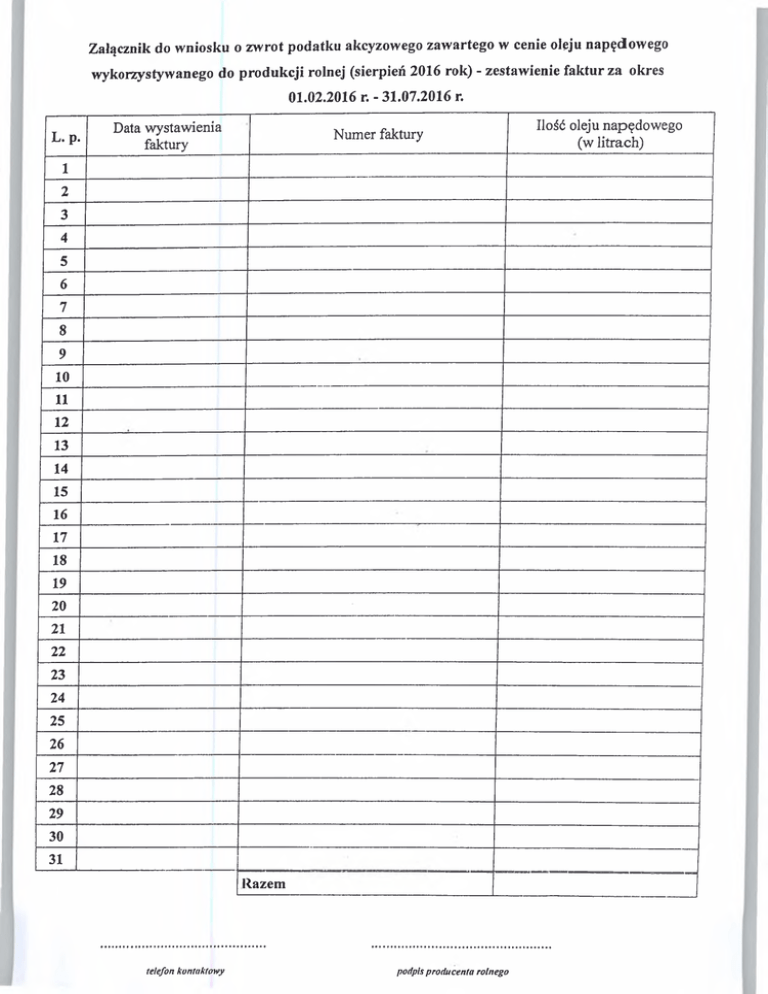 Załącznik do wniosku o zwrot podatku akcyzowego zawartego w cenie oleju napędowego wykorzystywanego do produkcji rolnej (sierpień 2016 rok) - zestawienie faktur za okres 01.02.2016 r. - 31.07.2016 r. L. p. Data w ystaw ienia faktury N um er faktury 1 2 3 4 5 6 7 8 9 10 11 12 13 14 15 16 17 18 19 20 21 22 23 24 25 26 27 28 29 30 31 lazem telefon kontaktowy podpis producenta rolnego Ilość oleju n ap ęd o w eg o (w litrach )