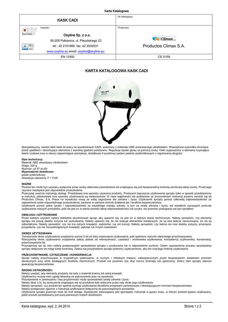 Karta Katalogowa Nr katalogowy: KASK CADI Importer: Producent: ……………………………………….. Oxyline Sp. z o.o. 95-200 Pabianice, ul. Piłsudskiego 23 tel.: 42 2151068 fax: 42 2032031 Productos Climax S.A. www.oxyline.eu email: [email protected] EN 12492 CE 0159 KARTA KATALOGOWA KASK CADI Specjalistyczny, bardzo lekki kask do pracy na wysokościach CADI, wykonany z materiału ABS utwardzanego ultrafioletem. Wewnętrzna wyściółka chroniąca przed upadkiem i absorbująca uderzenia z wysokiej gęstości polistyrenu. Regulacja opaski głowy za pomocą śruby. Hełm wyposażony w elementy trzymające latarki czołowe oraz w otwory zapewniające wentylacje, dodatkowo 4-punktowy system pasków podbródkowych o regulowanej długości. Opis techniczny: Materiał: ABS utwardzany ultrafioletem Waga: 325 g Rozmiar: od 57 do 60 Wyposażenie dodatkowe: pasek podbródkowy Absorpcja uderzenia: F < 5 kN WAŻNE Produkt ten może być używany wyłącznie przez osoby właściwie przeszkolone lub znajdujące się pod bezpośrednią kontrolą wzrokową takiej osoby. Przed jego użyciem niezbędne jest odpowiednie przeszkolenie. Przeczytaj uważnie instrukcję obsługi. Przedstawia ona sposoby używania produktu. Producent dopuszcza użytkowanie sprzętu tylko w sposób przedstawiony w instrukcji, jakiekolwiek inne sposoby użytkowania są niedozwolone: W razie wątpliwości lub problemów ze zrozumieniem instrukcji prosimy zwrócić się do Productos Climax, S.A, Prace na wysokości niosą ze sobą zagrożenie dla zdrowia i życia. Użytkownik sprzętu ponosi całkowitą odpowiedzialność za zapewnienie sobie odpowiedniego przeszkolenia, zarówno w zakresie technik działania jak i środków bezpieczeństwa. Użytkownik ponosi pełne ryzyko i odpowiedzialność za wszelkiego rodzaju szkody, w tym za utratę zdrowia i życia, we wszelkich sytuacjach podczas użytkowania naszych produktów, jeśli nie jest on w stanie ponieść takiej odpowiedzialności lub ryzyka, nie powinien posługiwać się tym sprzętem. OBSŁUGA I UŻYTKOWANIE Przed każdym użyciem należy dokładnie skontrolować sprzęt, aby upewnić się, że jest on w dobrym stanie technicznym. Należy sprawdzić, czy elementy sprzętu nie noszą śladów zużycia lub uszkodzenia. Należy upewnić się, że nie brakuje elementów metalowych, że są one dobrze zamocowane, że nie są odkształcone. Należy sprawdzić, czy nie ma ostrych krawędzi, zadziorów, rys ani korozji. Należy sprawdzić, czy taśma nie nosi śladów zużycia, przecięcia, przypalenia, czy nie ma postrzępionych krawędzi, pęknięć lub innych uszkodzeń. OKRES UŻYTKOWANIA Teoretycznie okres użytkowania urządzenia wynosi 5 lat od daty rozpoczęcia użytkowania, jeśli spełniono warunki właściwego przechowywania. Rzeczywisty okres użytkowania urządzenia zależy jednak od intensywności, częstości i środowiska użytkowania, kompetencji użytkownika, konserwacji, przechowywania itd. Przynajmniej raz do roku należy przeprowadzić sprawdzenie sprzętu u producenta lub w odpowiednim punkcie. Celem usprawnienia procesu sprawdzania sprzętu dołączono do niego kartę kontrolną. Zaleca się przydzielanie sprzętu jednemu użytkownikowi, aby ten znał jego historię użytkowania. PRZECHOWYWANIE, CZYSZCZENIE i KONSERWACJA Sprzęt należy przechowywać w oryginalnym opakowaniu, w suchym i chłodnym miejscu, zabezpieczonym przed bezpośrednim działaniem promieni słonecznych oraz silnie działających środków chemicznych. Produkt nie powinien być zbyt mocno ściśnięty lub zgnieciony. Dobry stan sprzętu stanowi gwarancję bezpieczeństwa. ŚRODKI OSTROŻNOŚCI Należy uważać, aby elementy produktu nie tarły o materiał ścierny lub ostrą krawędź. Użytkownicy muszą mieć zgodę lekarską na wykonywanie prac na wysokości. Pozostawanie w zawieszeniu i bez przytomności może spowodować utratę zdrowia i życia. Należy dbać o to, by oznaczenia znajdujące się na produkcie były widoczne przez cały okres jego użytkowania. Należy sprawdzić, czy produkt ten spełnia wymogi użytkowania określone przepisami państwowymi i obowiązującymi normami bezpieczeństwa. Należy postępować zgodnie z instrukcją użytkowania dołączoną do poszczególnych produktów. Użytkownik sprzętu powinien mieć do nich dostęp. Dystrybutor zobowiązany jest sporządzić instrukcje w języku kraju, w którym produkt będzie użytkowany, jeżeli produkt sprzedawany jest poza pierwszym krajem docelowym. Karta katalogowa, wyd. 2, 04.2014 Strona 1 z 2 Tabela kontroli i napraw KASK CADI EN 12492 Nazwisko użytkownika: Data zakupu: Data pierwszego użycia: Data produkcji: Numer seryjny: Uwagi: Data przeglądu Karta katalogowa, wyd. 2, 04.2014 Nazwisko osoby dokonującej przeglądu Pieczątka, podpis Strona 2 z 2