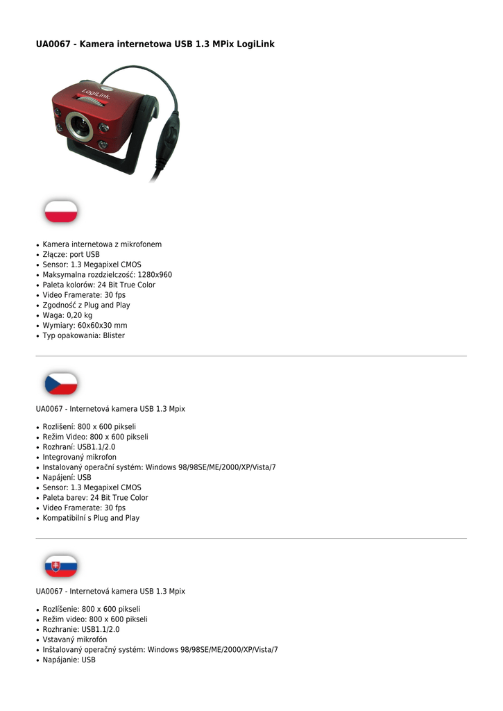 UA0067 - Kamera internetowa USB 1.3 MPix LogiLink ● ● ● ● ● ● ● ● ● ● Kamera internetowa z mikrofonem Złącze: port USB Sensor: 1.3 Megapixel CMOS Maksymalna rozdzielczość: 1280x960 Paleta kolorów: 24 Bit True Color Video Framerate: 30 fps Zgodność z Plug and Play Waga: 0,20 kg Wymiary: 60x60x30 mm Typ opakowania: Blister UA0067 - Internetová kamera USB 1.3 Mpix ● ● ● ● ● ● ● ● ● ● Rozlišení: 800 x 600 pikseli Režim Video: 800 x 600 pikseli Rozhraní: USB1.1/2.0 Integrovaný mikrofon Instalovaný operační systém: Windows 98/98SE/ME/2000/XP/Vista/7 Napájení: USB Sensor: 1.3 Megapixel CMOS Paleta barev: 24 Bit True Color Video Framerate: 30 fps Kompatibilní s Plug and Play UA0067 - Internetová kamera USB 1.3 Mpix ● ● ● ● ● ● Rozlíšenie: 800 x 600 pikseli Režim video: 800 x 600 pikseli Rozhranie: USB1.1/2.0 Vstavaný mikrofón Inštalovaný operačný systém: Windows 98/98SE/ME/2000/XP/Vista/7 Napájanie: USB ● ● ● ● Senzor: 1.3 Megapixel CMOS Paleta farieb: 24 bit true color Video Framerate : 30 fps Kompatibilita s Plug & Play Kod EAN:4260113569344