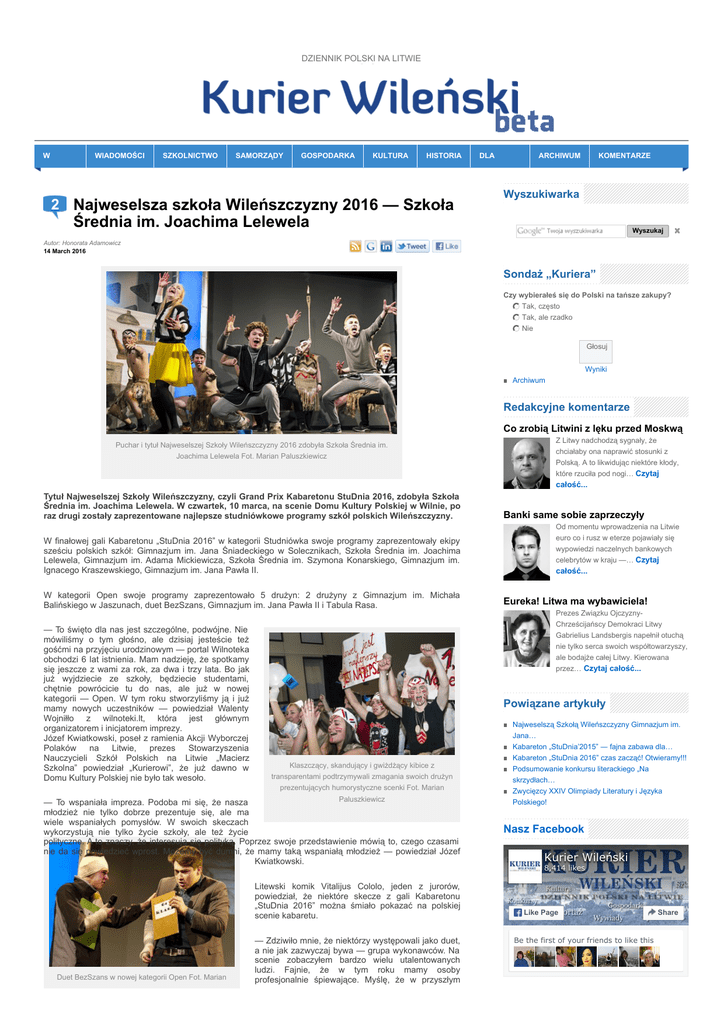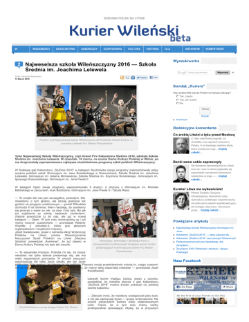 DZIENNIK POLSKI NA LITWIE W WIADOMOŚCI SZKOLNICTWO SAMORZĄDY GOSPODARKA KULTURA HISTORIA KRAJU DLA ARCHIWUM KOMENTARZE DZIECI 2 Najweselsza szkoła Wileńszczyzny 2016 — Szkoła Wyszukiwarka Średnia im. Joachima Lelewela Wyszukaj Autor: Honorata Adamowicz 14 March 2016 Sondaż „Kuriera” Czy wybierałeś się do Polski na tańsze zakupy? Tak, często Tak, ale rzadko Nie Głosuj Wyniki Archiwum Redakcyjne komentarze Co zrobią Litwini z lęku przed Moskwą Puchar i tytuł Najweselszej Szkoły Wileńszczyzny 2016 zdobyła Szkoła Średnia im. Joachima Lelewela Fot. Marian Paluszkiewicz Z Litwy nadchodzą sygnały, że chciałaby ona naprawić stosunki z Polską. A to likwidując niektóre kłody, które rzuciła pod nogi… Czytaj całość... Tytuł Najweselszej Szkoły Wileńszczyzny, czyli Grand Prix Kabaretonu StuDnia 2016, zdobyła Szkoła Średnia im. Joachima Lelewela. W czwartek, 10 marca, na scenie Domu Kultury Polskiej w Wilnie, po raz drugi zostały zaprezentowane najlepsze studniówkowe programy szkół polskich Wileńszczyzny. W finałowej gali Kabaretonu „StuDnia 2016” w kategorii Studniówka swoje programy zaprezentowały ekipy sześciu polskich szkół: Gimnazjum im. Jana Śniadeckiego w Solecznikach, Szkoła Średnia im. Joachima Lelewela, Gimnazjum im. Adama Mickiewicza, Szkoła Średnia im. Szymona Konarskiego, Gimnazjum im. Ignacego Kraszewskiego, Gimnazjum im. Jana Pawła II. W kategorii Open swoje programy zaprezentowało 5 drużyn: 2 drużyny z Gimnazjum im. Michała Balińskiego w Jaszunach, duet BezSzans, Gimnazjum im. Jana Pawła II i Tabula Rasa. — To święto dla nas jest szczególne, podwójne. Nie mówiliśmy o tym głośno, ale dzisiaj jesteście też gośćmi na przyjęciu urodzinowym — portal Wilnoteka obchodzi 6 lat istnienia. Mam nadzieję, że spotkamy się jeszcze z wami za rok, za dwa i trzy lata. Bo jak już wyjdziecie ze szkoły, będziecie studentami, chętnie powrócicie tu do nas, ale już w nowej kategorii — Open. W tym roku stworzyliśmy ją i już mamy nowych uczestników — powiedział Walenty Wojniłło z wilnoteki.lt, która jest głównym organizatorem i inicjatorem imprezy. Józef Kwiatkowski, poseł z ramienia Akcji Wyborczej Polaków na Litwie, prezes Stowarzyszenia Nauczycieli Szkół Polskich na Litwie „Macierz Szkolna” powiedział „Kurierowi”, że już dawno w Domu Kultury Polskiej nie było tak wesoło. Od momentu wprowadzenia na Litwie euro co i rusz w eterze pojawiały się wypowiedzi naczelnych bankowych celebrytów w kraju —… Czytaj całość... Eureka! Litwa ma wybawiciela! Prezes Związku OjczyznyChrześcijańscy Demokraci Litwy Gabrielius Landsbergis napełnił otuchą nie tylko serca swoich współtowarzyszy, ale bodajże całej Litwy. Kierowana przez… Czytaj całość... Powiązane artykuły Klaszczący, skandujący i gwiżdżący kibice z transparentami podtrzymywali zmagania swoich drużyn prezentujących humorystyczne scenki Fot. Marian Paluszkiewicz — To wspaniała impreza. Podoba mi się, że nasza młodzież nie tylko dobrze prezentuje się, ale ma wiele wspaniałych pomysłów. W swoich skeczach wykorzystują nie tylko życie szkoły, ale też życie polityczne. A to znaczy, że interesują się polityką. Poprzez swoje przedstawienie mówią to, czego czasami nie da się powiedzieć wprost. Możemy być dumni, że mamy taką wspaniałą młodzież — powiedział Józef Kwiatkowski. Litewski komik Vitalijus Cololo, jeden z jurorów, powiedział, że niektóre skecze z gali Kabaretonu „StuDnia 2016” można śmiało pokazać na polskiej scenie kabaretu. Duet BezSzans w nowej kategorii Open Fot. Marian Banki same sobie zaprzeczyły — Zdziwiło mnie, że niektórzy występowali jako duet, a nie jak zazwyczaj bywa — grupa wykonawców. Na scenie zobaczyłem bardzo wielu utalentowanych ludzi. Fajnie, że w tym roku mamy osoby profesjonalnie śpiewające. Myślę, że w przyszłym Najweselszą Szkołą Wileńszczyzny Gimnazjum im. Jana… Kabareton „StuDnia’2015” ― fajna zabawa dla… Kabareton „StuDnia 2016” czas zacząć! Otwieramy!!! Podsumowanie konkursu literackiego „Na skrzydłach… Zwycięzcy XXIV Olimpiady Literatury i Języka Polskiego! Nasz Facebook Kurier Wileński 8,414 likes Like Page Be the first of your friends to like this Share Paluszkiewicz roku podczas oceniania można będzie dodatkowo dodawać punkty za śpiewanie. Polskie talenty na Litwie — to bardzo dobrze. W porównaniu z ubiegłym rokiem, stopień występów jest wyższy, co bardzo cieszy — powiedział „Kurierowi” Vitalijus Cololo. Popisy drużyn oceniali jurorzy: Walenty Wojniłło z wilnoteki.lt, piosenkarka Katarzyna Zvonkuvienė, komik Vitalijus Cololo, Kazimierz Karpicz, dyrektor Muzeum Pałacu Balińskich w Jaszunach, przedstawiciel „Macierzy Szkolnej” i Witold Rudzianiec, właściciel kawiarni „Sakwa”, aktor Polskiego Studia Teatralnego w Wilnie. Nagrodę II stopnia zdobyło Gimnazjum im. Adama Mickiewicza Fot. Marian Paluszkiewicz Reklama Komisja oceniająca zgodnie przyznała, że wszystkie występy były na wysokim poziomie i bardzo trudno było wybrać najlepsze. Tytuł Najweselszej Szkoły Wileńszczyzny, czyli Grand Prix Kabaretonu StuDnia 2016 przyznano Szkole Średniej im. Joachima Lelewela. Kabareciarze przypomnieli w swoim skeczu historię Igora Mołotkowa, który policjantom ukradł kałasznikowa i postawił na nogi całe Wilno. Jury przyznało też dwie równoległe nagrody I stopnia dla Gimnazjum im. Jana Pawła II i Gimnazjum im. Ignacego Józefa Kraszewskiego. Nagrodę II stopnia zdobyło Gimnazjum im. Adama Mickiewicza. — To wspaniała zabawa! Cieszymy się z II miejsca, oczywiście chcieliśmy zwyciężyć. Ale nie tylko to jest ważne. Jesteśmy szczęśliwi, że mogliśmy wspólnie zrobić coś, być może ostatni raz. W swoim kabarecie chcieliśmy przedstawić swoich nauczycieli. Mamy nadzieję, że nie obrażą się na nas… Cieszymy się też, 