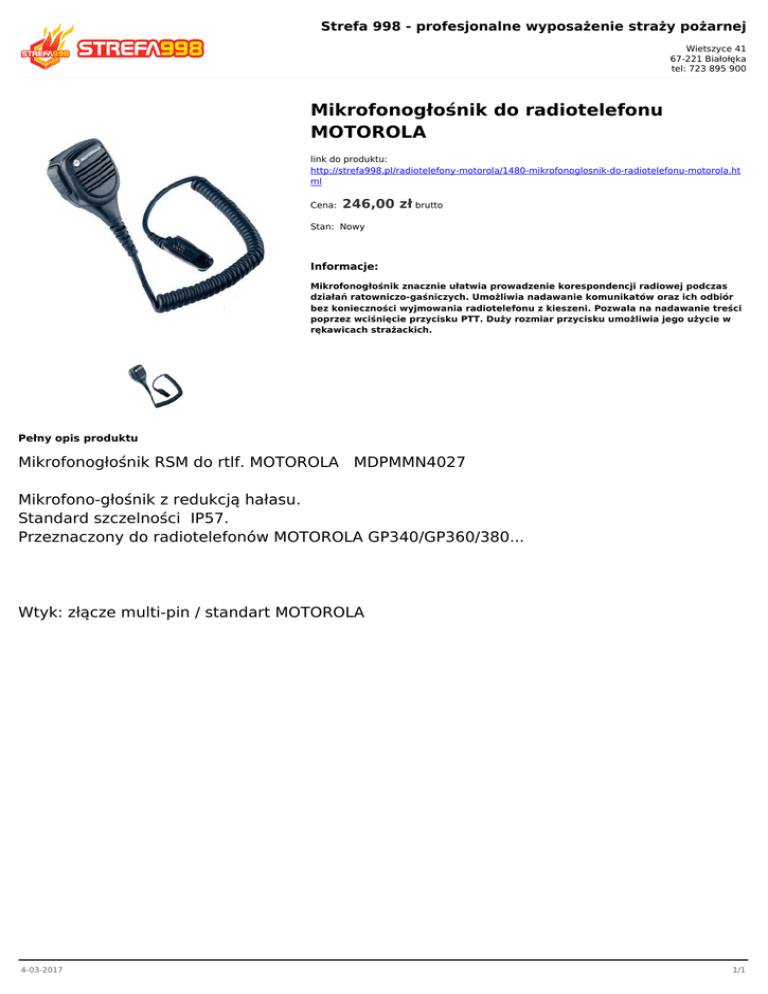 Strefa 998 - profesjonalne wyposażenie straży pożarnej Wietszyce 41 67-221 Białołęka tel: 723 895 900 Mikrofonogłośnik do radiotelefonu MOTOROLA link do produktu: http://strefa998.pl/radiotelefony-motorola/1480-mikrofonoglosnik-do-radiotelefonu-motorola.ht ml Cena: 246,00 zł brutto Stan: Nowy Informacje: Mikrofonogłośnik znacznie ułatwia prowadzenie korespondencji radiowej podczas działań ratowniczo-gaśniczych. Umożliwia nadawanie komunikatów oraz ich odbiór bez konieczności wyjmowania radiotelefonu z kieszeni. Pozwala na nadawanie treści poprzez wciśnięcie przycisku PTT. Duży rozmiar przycisku umożliwia jego użycie w rękawicach strażackich. Pełny opis produktu Mikrofonogłośnik RSM do rtlf. MOTOROLA MDPMMN4027 Mikrofono-głośnik z redukcją hałasu. Standard szczelności IP57. Przeznaczony do radiotelefonów MOTOROLA GP340/GP360/380... Wtyk: złącze multi-pin / standart MOTOROLA 4-03-2017 1/1