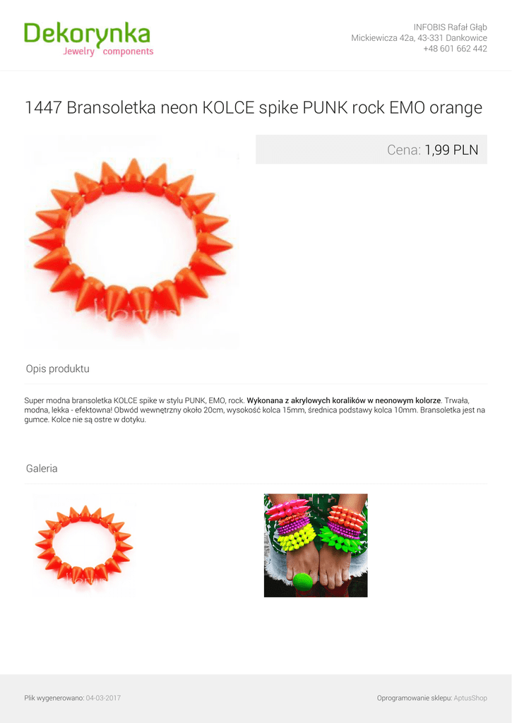 INFOBIS Rafał Głąb Mickiewicza 42a, 43-331 Dankowice +48 601 662 442 1447 Bransoletka neon KOLCE spike PUNK rock EMO orange Cena: 1,99 PLN Opis produktu Super modna bransoletka KOLCE spike w stylu PUNK, EMO, rock. Wykonana z akrylowych koralików w neonowym kolorze. Trwała, modna, lekka - efektowna! Obwód wewnętrzny około 20cm, wysokość kolca 15mm, średnica podstawy kolca 10mm. Bransoletka jest na gumce. Kolce nie są ostre w dotyku. Galeria Plik wygenerowano: 04-03-2017 Powered by TCPDF (www.tcpdf.org) Oprogramowanie sklepu: AptusShop