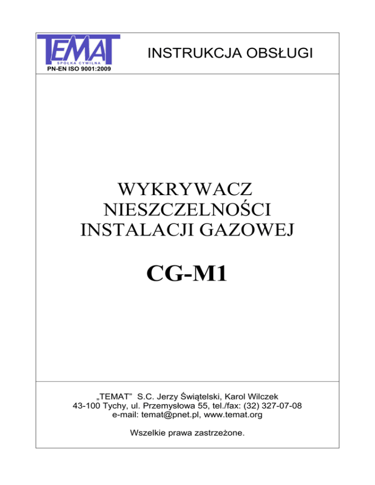 INSTRUKCJA OBSŁUGI PN-EN ISO 9001:2009 WYKRYWACZ NIESZCZELNOŚCI INSTALACJI GAZOWEJ CG-M1 „TEMAT” S.C. Jerzy Świątelski, Karol Wilczek 43-100 Tychy, ul. Przemysłowa 55, tel./fax: (32) 327-07-08 e-mail: [email protected], www.temat.org Wszelkie prawa zastrzeżone. Spis treści INSTRUKCJA OBSŁUGI.............................................................................................3 Opis funkcjonalny urządzenia.........................................................................................................................3 Opis techniczny urządzenia............................................................................................................................3 Wygląd ogólny...........................................................................................................................................3 Dane techniczne.........................................................................................................................................4 Zasady bezpieczeństwa...................................................................................................................................4 Zagrożenie porażenia prądem.........................................................................................................................5 Zagrożenie wybuchem....................................................................................................................................5 Zalecenia producenta dotyczące eksploatacji i konserwacji...........................................................................5 Ochrona środowiska........................................................................................................................................6 Obsługa wykrywacza gazu CG-M1................................................................................................................6 Przygotowanie do pracy.............................................................................................................................6 Praca...........................................................................................................................................................6 Wyłączenie.................................................................................................................................................8 Ładowanie akumulatorów..........................................................................................................................8 Samodzielna kontrola.................................................................................................................................8 Stany awaryjne................................................................................................................................................8 Sposób trzymania wysięgnika.........................................................................................................................9 Zagadnienia teoretyczne................................................................................................................................10 Serwis pogwarancyjny..................................................................................................................................11 DEKLARACJA ZGODNOŚCI....................................................................................12 Producent nie ponosi odpowiedzialności za użytkowanie urządzenia niezgodne z instrukcją obsługi. Strona 2 z 12 IO CG-M1 06.2012 „TEMAT” S.C. INSTRUKCJA OBSŁUGI Opis funkcjonalny urządzenia Wykrywacz gazu CG-M1 przeznaczony jest do kontroli i wykrywania nieszczelności instalacji gazowej zawierającej gaz ziemny, miejski lub mieszaninę propan- butan. Wykrywacz nie jest urządzeniem pomiarowym. Podczas pracy sensor dokonuje ciągłego pomiaru stężenia gazu, wynik przedstawiony jest na wyświetlaczu alfanumerycznym. Urządzenie zasilane jest z dwóch wymiennych baterii lub akumulatorów o rozmiarze AA (R6). Czas pracy ciągłej: • ~10h (akumulatory Ni-MH 2400mAh). • ~5h (baterie alkaliczne). Opis techniczny urządzenia Latarka Wygląd ogólny >W< WYŁĄCZENIE >U< USTAWIENIE >Z< ZAŁĄCZENIE Naciśnięcie podczas pracy powoduje pokazanie wskazania w %DGP (dotyczy metanu). Naciśnięcie podczas pracy powoduje załączenie latarki. odmiana z wysięgnikiem Strona 3 z 12 odmiana z peszlem IO CG-M1 06.2012 „TEMAT” S.C. Dane techniczne • wyświetlacz alfanumeryczny 8x2, • Zakresy pomiarowe: Napis na wyświetlaczu: I <1% DGP - Wykrycie + sygnalizacja optyczna II 1%÷5% DGP -ALARM 1 + sygnalizacja optyczna i dźwiękowa III 5%÷10% DGP -ALARM 2 + sygnalizacja optyczna i dźwiękowa IV 10%÷20% DGP -ALARM 3 + sygnalizacja optyczna i dźwiękowa V >20%DGP -!UWAGA! + sygnalizacja optyczna i dźwiękowa • kontrola i sygnalizacja uszkodzenia obwodu pomiarowego, • czas pracy ciągłej: ~10h (akumulatory Ni-MH 2400mAh), ~5h (baterie alkaliczne), • kontrola stanu baterii z sygnalizacją konieczności wymiany, • rodzaj pomiaru - ciągły dyfuzyjny, • wykrywane gazy: metan , propan, izobutany, pary benzyny, alkoholu, nitro, • zastosowany sensor: półprzewodnikowy, • sonda pomiarowa: wysuwany teleskop: dł. ~120cm, końcówka sensora plastikowa ø 21mm, giętki peszel: dł. ~30cm, końcówka sensora metalowa ø 12mm. Zasady bezpieczeństwa • przed rozpoczęciem pracy z urządzeniem należy zapoznać się z zasadami bezpieczeństwa, zaleceniami producenta i instrukcją obsługi, • nie wolno używać urządzenia do innych celów niż określone w niniejszej instrukcji, • urządzenie należy trzymać poza zasięgiem dzieci, • wszelkich napraw wykrywacza może dokonywać wyłącznie osoba uprawniona, • urządzenie należy obsługiwać zawsze zgodnie z zasadami BHP, • należy kontrolować sprawność urządzenia a w nieprawidłowości należy skontaktować się z serwisem, przypadku jakichkolwiek • nie wykonywać pomiar