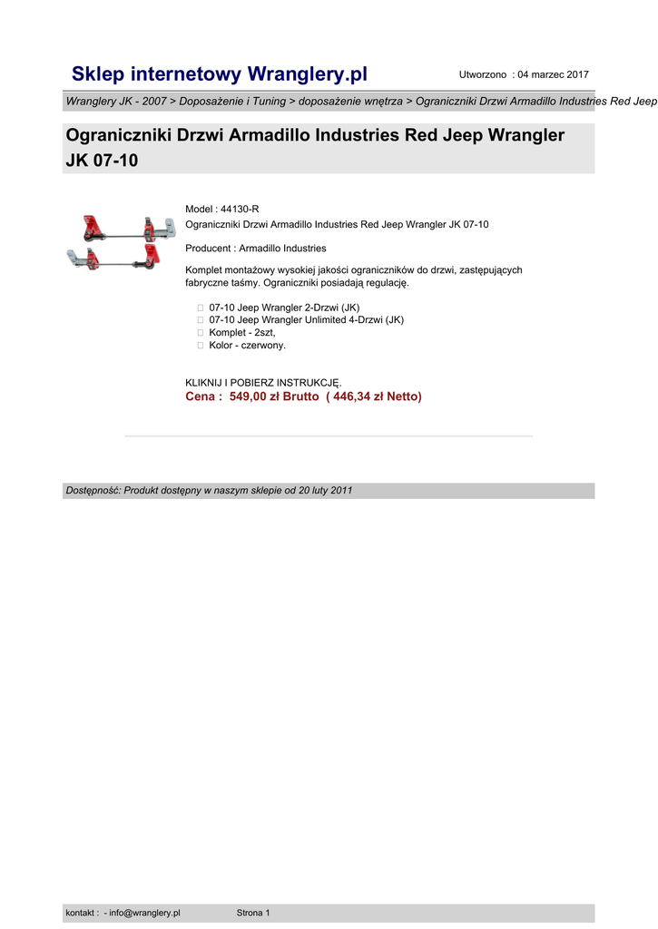 Sklep internetowy Wranglery.pl Utworzono : 04 marzec 2017 Wranglery JK - 2007 > Doposażenie i Tuning > doposażenie wnętrza > Ograniczniki Drzwi Armadillo Industries Red Jeep Ograniczniki Drzwi Armadillo Industries Red Jeep Wrangler JK 07-10 Model : 44130-R Ograniczniki Drzwi Armadillo Industries Red Jeep Wrangler JK 07-10 Producent : Armadillo Industries Komplet montażowy wysokiej jakości ograniczników do drzwi, zastępujących fabryczne taśmy. Ograniczniki posiadają regulację. � 07-10 Jeep Wrangler 2-Drzwi (JK) � 07-10 Jeep Wrangler Unlimited 4-Drzwi (JK) � Komplet - 2szt, � Kolor - czerwony. KLIKNIJ I POBIERZ INSTRUKCJĘ. Cena : 549,00 zł Brutto ( 446,34 zł Netto) Dostępność: Produkt dostępny w naszym sklepie od 20 luty 2011 kontakt : - [email protected] Strona 1