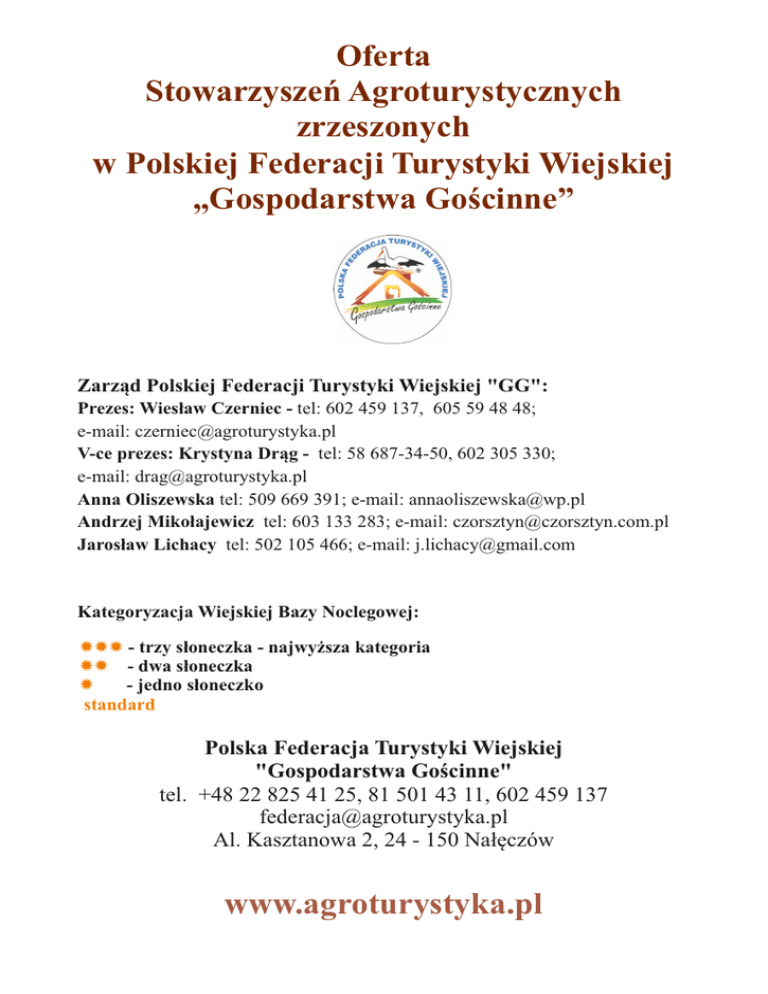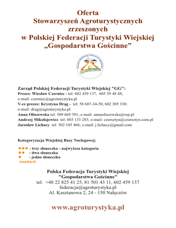 Oferta Stowarzyszeń Agroturystycznych zrzeszonych w Polskiej Federacji Turystyki Wiejskiej „Gospodarstwa Gościnne” Zarząd Polskiej Federacji Turystyki Wiejskiej "GG": Prezes: Wiesław Czerniec - tel: 602 459 137, 605 59 48 48; e-mail: [email protected] V-ce prezes: Krystyna Drąg - tel: 58 687-34-50, 602 305 330; e-mail: [email protected] Anna Oliszewska tel: 509 669 391; e-mail: [email protected] Andrzej Mikołajewicz tel: 603 133 283; e-mail: [email protected] Jarosław Lichacy tel: 502 105 466; e-mail: [email protected] Kategoryzacja Wiejskiej Bazy Noclegowej: zzz - trzy słoneczka - najwyższa kategoria zz - dwa słoneczka z - jedno słoneczko standard Polska Federacja Turystyki Wiejskiej "Gospodarstwa Gościnne" tel. +48 22 825 41 25, 81 501 43 11, 602 459 137 [email protected] Al. Kasztanowa 2, 24 - 150 Nałęczów www.agroturystyka.pl Kategoryzacja Wiejskiej Bazy Noclegowej, to dobrowolna ocena obiektów turystyki wiejskiej w/g systemu zarządzanego przez Polską Federację Turystyki Wiejskiej „Gospodarstwa Gościnne”. Przeprowadzana jest przez licencjonowanego inspektora. Celem kategoryzacji jest podnoszenie jakości świadczonych usług w obiektach turystyki wiejskiej oraz rekomendacja i promocja obiektów poddanych ocenie kategoryzacyjnej. KRYTERIA KATEGORYZACYJNE DLA POKOI GOŚCINNYCH Kategoria Standard 1. Pokój 1 – osobowy minimum 6m2 2. Pokój 2 - osobowy – minimum 10m2 3. Pokój 3 – osobowy – minimum 14m2 4. Pokój 4 – osobowy – minimum 16m2 5. Łóżko jednoosobowe o wymiarach 80x190 cm, 6. Łóżko dwuosobowe o wymiarach 120x190 cm 7. Komplet pościeli (kołdra lub dwa koce, poduszka, poszwa, poszewka) 8. Stół, ława lub stolik (dostosowany wysokością do miejsc siedzących) 9. Krzesło lub taboret jedno na osobę, lecz nie mniej niż 2 na pokój. 10. Lustro 11. Pojemnik na śmieci 12. Zasłony okienne zaciemniające (lub żaluzje, okiennice) 13. Ręcznik 14. Oświetlenie elektryczne główne – minimum jeden punkt 60W, lampka nocna przy łóżku Kategoria (jedno słoneczko): Wszystkie wymagania dla kategorii „Standard” plus następujące: 1. Pokój 1 – osobowy – minimum 9 m2 2. Materiały informacyjne w dostępnym miejscu 3. Dywanik przy łóżku 4. Ręcznik Kategoria (dwa słoneczka): Wszystkie wymagania dla kategorii „jedno słoneczko” plus następujące: 1. Pokój 1 – osobowy – minimum 9m2 2. Pokój 2 – osobowy – minimum 12m2 3. Pokój 3 – osobowy – minimum 15m2 4. Pokój 4 – osobowy – minimum 18m2 Kategoria (trzy słoneczka): Wszystkie wymagania dla kategorii „dwa słoneczka” plus następujące: 1. 2. 3. 4. 5. 6. 7. Pokój 1 – osobowy – minimum 10m2 Pokój 2 – osobowy – minimum 14m2 Pokój 3 – osobowy – minimum 17m2 Pokój 4 – osobowy – minimum 20m2 Ręcznik kąpielowy Stojak na bagaże lub ekwiwalent Fotel 2 Europejskie Centrum Rolnictwa Ekologicznego i Turystyki - ECEAT Polska Adres: Bukówka 71, 58-420 Lubawka Telefon: 75 741 13 95 Mail: [email protected], Strona www: www.eceat.agroturystyka.pl, www.poland.eceat.org, Prezes: Barbara Jochymek, 75 741 13 95, 603 543 961, [email protected] ŁATKA KAZIMIERA I JAN, Barcice Dolne 8 k/Starego Sącza, 33-342 Barcice, 18 446 16 03, 505 320 379, [email protected], www.ekolatka.republika.pl OSTOJA, Haraburda Janina i Wiesław, Bartosze 3, 19-300 Ełk, 87 610 48 37, [email protected]; [email protected], www.ostoja.elk.com.pl EKO-SEN, Natorin Wiera, Białowieża ul.Tropinka 51, 17-230 Bialowieża, 85 681 27 35, 697 394 600, [email protected], www.eko-sen.bialowieza.com DURDA ANDRZEJ, Bieganów 40, 57-400 Nowa Ruda, 74 873 36 23, www.agrinpol.pl/bieganow BŁAŻEJÓWKA, Błażowski Józef, Brzozowiec 2, 38-516 Tarnawa Dolna, 13 466 15 00, [email protected], www.blazejowka.pl EKO BAJKA, Jochymek Barbara, Bukówka 71, 58-420 Lubawka, 75 741 13 95, 603 54 39 61, [email protected], www.ekobajka.pl GÓRY BYSTRZYCKIE, Markowski Konrad, Bystrzyca 60, 57-500 Bystrzyca Kłodzka, 603 087 536, [email protected], www.gorybystrzyckie.agrowakacje.pl standard BLIŻEJ NATURY, Janik Alina i Sylwester, Dąbrowa 13, 62-730 Dobra, 63 279 92 30, www.reges.pl/janik.htm zzz PLATTÓWKA, Platte Mariola, Gierzwałd 45, 14-107 Gierzwałd, 89 647 20 82, [email protected], www.platte.pl MAJĄTEK GIZE MARCZAK, Marczak Anna, Giże 41, 19-411 Swiętano, 87 523 04 05, 509 78 20 15, [email protected], www.ekoturystyka.com.pl POD GÓRAMI, Plackowscy Zofia i Jordan, Inwałd Os.Górki 20, 34-120 Andrychów, 33 873 65 31, 502 25 03 59, [email protected], www.podgorami.beskidy.pl POD SREBRNĄ GÓRĄ, Wolak Agata i Zbigniew, Jeżów Sudecki, ul. Długa 125, 58-521 Jeżów Sudecki, 75 713 22 21, 695 435 24, [email protected], www.srebna-gora.pl BYĆ, Być Anna i Roman, Komańcza 197, 38-543 Komańcza, 13 467 70 46, 509 637 954, [email protected], www.byc.agroturystyka.pl KONKOL TERESA I ANDRZEJ, Kosy 22, 83-300 Kartuzy, 58 684 09 75, 667 764 876, [email protected], EKOTOURIST FARM, Paluszkiewicz Anna i Piotr, Lubcz Mały 17, 64-761 Krzyż, 67 253 31 59, 602 30 23 82, [email protected], www.ekotouristfarm.pl AGROTURYSTYKA GÓRY ŚWIĘTOKRZYSKIE, Pacyga Krystyna i Zdzisław, ul. Słupska 64, 26-025 Łagów, 41 307 41 98, 609 08 27 15, [email protected], www.agrowczasy.info TRAWIŃSKA KATARZYNA, Nowina 6, 57-210 Henryków, 74 810 26 87, [email protected], TRAWIŃSKI JERZY, Nowina 5, 57-210 Henryków, 74 810 24 22, [email protected], www.nowina5.pl GOŚCINNA ZAGRODA, Kalińscy Barbara i Ryszard, Nowy Gieratów 12, 57-550 Stronie Śląskie, 74 814 14 52, [email protected], www.sudety.info.pl/goscinnazagroda LAWINOWE WZGÓRZE, Lawin Janusz, Oleszna Podgórska 86, 59-623 Lubomierz, 75 789 20 17, 602 534 360, [email protected], www.lawinowewzgorze.agrowakacje.pl SERNIUK JANINA I FRANCISZEK, ul. Pakoszowska 69, 58-573 Piechowice, 75 761 22 14, [email protected], www.ekofarm.karkonosze.pl WĘGRZYN WANDA I MARIAN, Popowice 92, 33-340 Stary Sącz, 18 442 98 46 3 z MICIELICA MARIA, Potopy 3, 16-406 Rutka - 