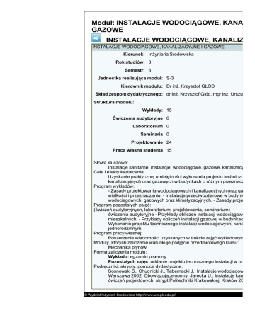 Moduł: INSTALACJE WODOCIĄGOWE, KANALIZA GAZOWE INSTALACJE WODOCIĄGOWE, KANALIZACY INSTALACJE WODOCIĄGOWE, KANALIZACYJNE I GAZOWE Kierunek: Inżynieria Środowiska Rok studiów: 3 Semestr: 6 P Jednostka realizująca moduł: S-3 Kierownik modułu: Dr inż. Krzysztof GŁÓD Skład zespołu dydaktycznego: dr inż. Krzysztof Głód, mgr inż. Urszula Jare Struktura modułu: Wykłady: 15 Ćwiczenia audytoryjne 6 Laboratorium 0 Seminaria 0 Projektowanie 24 Praca własna studenta 15 Słowa kluczowe: Instalacje sanitarne, instalacje: wodociągowe, gazowe, kanalizacyjne Cele i efekty kształcenia: Uzyskanie praktycznej umiejętności wykonania projektu technicznego in kanalizacyjnych oraz gazowych w budynkach o różnym przeznaczeniu. Program wykładów: - Zasady projektowania wodociągowych i kanalizacyjnych oraz gazowyc wielkości i przeznaczeniu. - Instalacje przeciwpożarowe w budynkach. wodociągowych, gazowych oraz klimatyzacyjnych. - Zasady projektowa Program pozostałych zajęć: (ćwiczeń audytoryjnych, laboratorium, projektowania, seminarium) ćwiczenia audytoryjne - Przykłady obliczeń instalacji wodociągowej i prz mieszkalnych. - Przykłady obliczeń instalacji gazowej w budynkach mies Wykonanie projektu technicznego instalacji wodociągowych, kanalizacy jednorodzinnym. Program pracy własnej: Poszerzenie wiadomości uzyskanych w trakcie zajęć wykładowych, wyk Moduły, których zaliczenie warunkuje podjęcie przedmiotowego kursu: Mechanika płynów Forma zaliczenia modułu: Wykładu: egzamin pisemny Pozostałych zajęć: oddanie projektu technicznego instalacji w budynku Podręczniki, skrypty, pomoce dydaktyczne: Sosnowski S., Chudnicki J., Tabernacki J.: Instalacje wodociągowe i kan Warszawa 2002. Obowiązujące normy. Jarecka U.: Instalacje kanalizac ćwiczeń projektowych, skrypt Politechniki Krakowskiej, Kraków 2002. © Wydział Inżynierii Środowiska http://www.wis.pk.edu.pl/