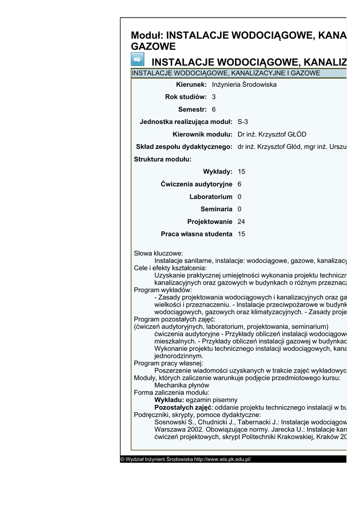 Moduł: INSTALACJE WODOCIĄGOWE, KANALIZACYJNE GAZOWE
