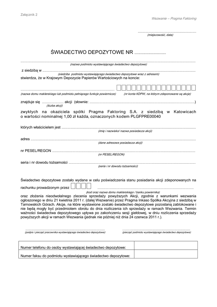 Załącznik 2 Wezwanie – Pragma Faktoring ........................................................................ (miejscowość, data) ŚWIADECTWO DEPOZYTOWE NR ............................... ........................................................................................................................................................................................................................ (nazwa podmiotu wystawiającego świadectwo depozytowe) z siedzibą w ............................................................................................................................................................................................. (siedziba podmiotu wystawiającego świadectwo depozytowe wraz z adresem) stwierdza, że w Krajowym Depozycie Papierów Wartościowych na koncie: .................................................................................................................... 0000000000000000 (nazwa domu maklerskiego lub podmiotu pełniącego funkcje powiernicze) (nr konta KDPW, na którym zdeponowane są akcje) znajduje się ........................... akcji (słownie: ..................................................................................................................................) (liczba akcji) zwykłych na okaziciela spółki Pragma Faktoring S.A. z siedzibą w Katowicach o wartości nominalnej 1,00 zł każda, oznaczonych kodem PLGFPRE00040 których właścicielem jest ...................................................................................................................................................................... (imię i nazwisko/ nazwa posiadacza akcji) adres ............................................................................................................................................................................................................ (dane adresowe posiadacza akcji) nr PESEL/REGON ................................................................................................................................................................................. (nr PESEL/REGON) seria i nr dowodu tożsamości ............................................................................................................................................................. (seria i nr dowodu tożsamości) Świadectwo depozytowe zostało wydane w celu poświadczenia stanu posiadania akcji zdeponowanych na 0000 rachunku prowadzonym przez ....................................................................................................................... (kod oraz nazwa domu maklerskiego / banku powiernika) oraz złożenia nieodwołalnego zlecenia sprzedaży powyższych Akcji, zgodnie z warunkami wezwania ogłoszonego w dniu 21 kwietnia 2011 r. (dalej Wezwanie) przez Pragma Inkaso Spółka Akcyjna z siedzibą w Tarnowskich Górach. Akcje, na które wystawione zostało świadectwo depozytowe pozostaną zablokowane i nie będą mogły być przedmiotem obrotu do dnia rozliczenia ich sprzedaży w ramach Wezwania. Termin ważności świadectwa depozytowego upływa po zakończeniu sesji giełdowej, w dniu rozliczenia sprzedaży powyższych akcji w ramach Wezwania (jednak nie później niż dnia 24 czerwca 2011 r.). .................................................................................................. ….……........................................................................ (podpis i pieczęć pracownika wystawiającego świadectwo depozytowe) (pieczęć podmiotu wystawiającego świadectwo depozytowe) Numer telefonu do osoby wystawiającej świadectwo depozytowe: Numer faksu do podmiotu wystawiającego świadectwo depozytowe: