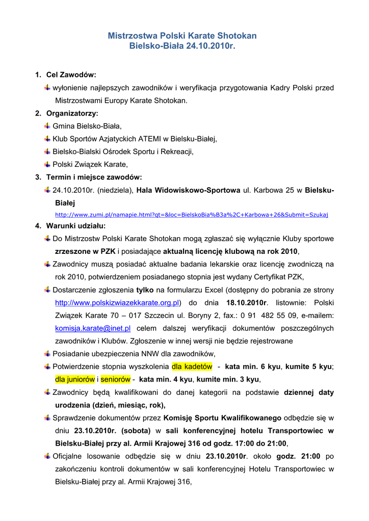 Mistrzostwa Polski Karate Shotokan Bielsko-Biała 24.10.2010r. 1. Cel Zawodów: wyłonienie najlepszych zawodników i weryfikacja przygotowania Kadry Polski przed Mistrzostwami Europy Karate Shotokan. 2. Organizatorzy: Gmina Bielsko-Biała, Klub Sportów Azjatyckich ATEMI w Bielsku-Białej, Bielsko-Bialski Ośrodek Sportu i Rekreacji, Polski Związek Karate, 3. Termin i miejsce zawodów: 24.10.2010r. (niedziela), Hala Widowiskowo-Sportowa ul. Karbowa 25 w BielskuBiałej http://www.zumi.pl/namapie.html?qt=&loc=BielskoBia%B3a%2C+Karbowa+26&Submit=Szukaj 4. Warunki udziału: Do Mistrzostw Polski Karate Shotokan mogą zgłaszać się wyłącznie Kluby sportowe zrzeszone w PZK i posiadające aktualną licencję klubową na rok 2010, Zawodnicy muszą posiadać aktualne badania lekarskie oraz licencję zwodniczą na rok 2010, potwierdzeniem posiadanego stopnia jest wydany Certyfikat PZK, Dostarczenie zgłoszenia tylko na formularzu Excel (dostępny do pobrania ze strony http://www.polskizwiazekkarate.org.pl) do dnia 18.10.2010r. listownie: Polski Związek Karate 70 – 017 Szczecin ul. Boryny 2, fax.: 0 91 482 55 09, e-mailem: [email protected] celem dalszej weryfikacji dokumentów poszczególnych zawodników i Klubów. Zgłoszenie w innej wersji nie będzie rejestrowane Posiadanie ubezpieczenia NNW dla zawodników, Potwierdzenie stopnia wyszkolenia dla kadetów - kata min. 6 kyu, kumite 5 kyu; dla juniorów i seniorów - kata min. 4 kyu, kumite min. 3 kyu, Zawodnicy będą kwalifikowani do danej kategorii na podstawie dziennej daty urodzenia (dzień, miesiąc, rok), Sprawdzenie dokumentów przez Komisję Sportu Kwalifikowanego odbędzie się w dniu 23.10.2010r. (sobota) w sali konferencyjnej hotelu Transportowiec w Bielsku-Białej przy al. Armii Krajowej 316 od godz. 17:00 do 21:00, Oficjalne losowanie odbędzie się w dniu 23.10.2010r. około godz. 21:00 po zakończeniu kontroli dokumentów w sali konferencyjnej Hotelu Transportowiec w Bielsku-Białej przy al. Armii Krajowej 316, Korekty zgłoszeń możliwe są do godz. 21:00 w dniu 23.10.2010r. w sali konferencyjnej Hotelu Transportowiec w Bielsku-Białej przy al. Armii Krajowej 316, W dniu zawodów można będzie jedynie wykreślić zawodnika bez możliwości nanoszenia jakichkolwiek zmian. 5. Wiek zawodników: Kadeci: 16 – 17 lat, Juniorzy: 18 – 20 lat, Seniorzy: powyżej 21 lat, • Kadet może startować w konkurencjach przewidzianych dla kadetów i może wziąć udział w konkurencji kata juniorów bez możliwości startu w kumite juniorów, • Junior może wziąć udział w konkurencji kata i kumite seniorów, 6. Konkurencje Kadet 16-17 lat Junior 18-20 lat Senior 21 lat i starsi Kata ind. Kadetek, Kata ind. Juniorek, Kata ind. Seniorek, Kata druż. Kadetek, Kata druż. Juniorek, Kata druż. Seniorek, Kumite ind. Kadetek, Kumite ind. Juniorek, Kumite ind. Seniorek, Kumite druż. Kadetek (3 Kumite druż. Juniorek (3 Kumite druż. Seniorek (3 zawodniczki + 1 rezerw.) zawodniczki + 1 rezerw.) zawodniczki + 1 rezerw.) Kata ind. Kadetów, Kata ind. Juniorów, Kata ind. Seniorów, Kata druż. Kadetów, Kata druż. Juniorów, Kata druż. Seniorów, Kumite ind. Kadetów, Kumite ind. Juniorów, Kumite ind. Seniorów, Kumite druż. Kadetów (3 Kumite druż. Juniorów (3 Kumite druż. Seniorów (3 zawodników + 1 rezerw.) zawodników + 1 rezerw.) zawodników + 1 rezerw.) 7. Przepisy mistrzostw Zawody będą rozgrywane w oparciu o przepisy WSKA. W Kumite wymagane są białe napiętniki zgodnie z homologacją PZK oraz ochraniacze na zęby. Organizator nie zabezpiecza pasów białych i czerwonych. Uwaga ! Tylko licencjonowani trenerzy mogą przebywać w wyznaczonym przepisami miejscu, wyłącznie w dresie klubowym i ważną licencją trenerską. W obszarze pola walk mogą przebywać tylko zawodnicy i ich trenerzy, aktualnie toczący walki oraz sędziowie. 8. Opłaty startowe 50 zł za konkurencję indywidualną, 100 zł za konkurencję drużynową, 9. Postanowienia końcowe Kwestie sporne rozstrzyga Sędzia Główny w porozumieniu z organizatorem, Złożenie protestu dot. decyzji sędziowskiej – po wpłaceniu wadium w wys. 300 zł, Organizator nie ponosi odpowiedzialności za rzeczy zaginione, Za ewent. szkody poczynione przez uczestnika zawodów odpowiedzialność ponosi jego Klub, Ekspozycja i sprzedaż towarów - tylko za zgodą organizatora, Do dekoracji zawodnicy przystępują w kompletnych dresach klubowych lub karategach, Przy weryfikacji zgłoszeń przed zawodami należy posiadać kopię zgłoszenia zawodników (wydruk e:mail, lub kopię fax.), Kontakt tel. z organizatorem – PAWEŁ POŁTORZECKI – tel. 607 405 747, e-mail: [email protected], Uwaga! Każdy klub jest zobowiązany do delegowania sędziego z aktualna licencja do pracy na zawodach. Jeśli nie posiada sędziego z uprawnieniami wpłaca organizatorowi ekwiwalent w kwocie 100zł. 10. Program mistrzostw Sobota 23.10.2010r. Hotel Transportowiec Bielsko-Biała al. Armii Krajowej 316, weryfikacja dokumentów od godz. 17:00 do 21:00, oficjalne losowanie godz. 21:00, Niedziela 24.10.2010r. Hala Widowisko-Sportowa Bielsko-Biała ul. Karbowa 25 – Mistrzostwa Polski Karate Shotokan: 08:30 – 08:40 – odprawa sędziowska, 08:40 – 08:50 – odprawa kierowników ekip, 09:00 – 17:00 – eliminacje, finały kata i kumite, 11:00 – oficjalne otwarcie Mistrzostw Polski 11. Zakwaterowanie i wyżywienie. Organizator zawodów zabezpieczył miejsca noclegowe dla ekip, które zgłoszą zamówienie w terminie do 11.10.2010r. Płatność za zamówione miejsca pobiera organizator – gotówką lub na konto klubu. Za zamówione i niewykorzystane miejsca noclegowe płaci zamawiający! PKO BP S.A. I Oddz. BIELSKO-BIAŁA 82102013900000610201305713. Po tym terminie organizator nie zabezpiecza miejsc noclegowych. Możliwość zakwaterowania: Hotel Transportowiec – biuro zawodów - 400 m. od Hali Sportowej – cena 1 doby ze śniadaniem 70 zł od osoby, Hotel ZIAD (obok Hali Sportowej) – cen