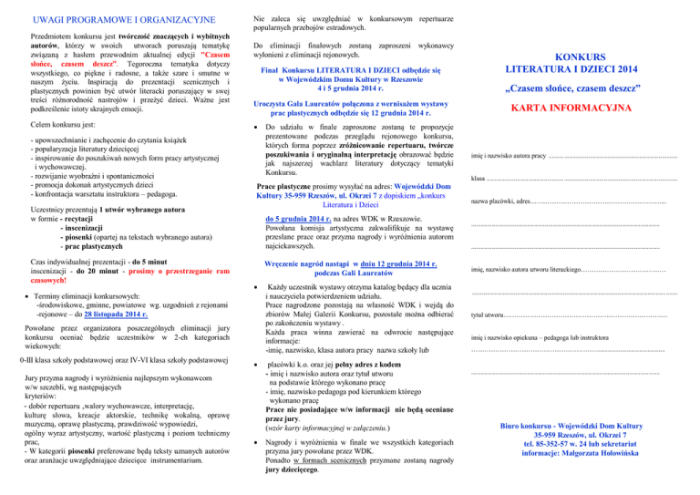 UWAGI PROGRAMOWE I ORGANIZACYJNE Przedmiotem konkursu jest twórczość znaczących i wybitnych autorów, którzy w swoich utworach poruszają tematykę związaną z hasłem przewodnim aktualnej edycji "Czasem słońce, czasem deszcz”. Tegoroczna tematyka dotyczy wszystkiego, co piękne i radosne, a także szare i smutne w naszym życiu. Inspiracją do prezentacji scenicznych i plastycznych powinien być utwór literacki poruszający w swej treści różnorodność nastrojów i przeżyć dzieci. Ważne jest podkreślenie istoty skrajnych emocji. Celem konkursu jest: - upowszechnianie i zachęcenie do czytania książek - popularyzacja literatury dziecięcej - inspirowanie do poszukiwań nowych form pracy artystycznej i wychowawczej. - rozwijanie wyobraźni i spontaniczności - promocja dokonań artystycznych dzieci - konfrontacja warsztatu instruktora – pedagoga. Uczestnicy prezentują 1 utwór wybranego autora w formie - recytacji - inscenizacji - piosenki (opartej na tekstach wybranego autora) - prac plastycznych Czas indywidualnej prezentacji - do 5 minut inscenizacji - do 20 minut - prosimy o przestrzeganie ram czasowych! Nie zaleca się uwzględniać w konkursowym repertuarze popularnych przebojów estradowych. Do eliminacji finałowych zostaną zaproszeni wykonawcy wyłonieni z eliminacji rejonowych. Finał Konkursu LITERATURA I DZIECI odbędzie się w Wojewódzkim Domu Kultury w Rzeszowie 4 i 5 grudnia 2014 r. Uroczysta Gala Laureatów połączona z wernisażem wystawy prac plastycznych odbędzie się 12 grudnia 2014 r. Prace plastyczne prosimy wysyłać na adres: Wojewódzki Dom Kultury 35-959 Rzeszów, ul. Okrzei 7 z dopiskiem „konkurs Literatura i Dzieci do 5 grudnia 2014 r. na adres WDK w Rzeszowie. Powołana komisja artystyczna zakwalifikuje na wystawę przesłane prace oraz przyzna nagrody i wyróżnienia autorom najciekawszych. Wręczenie nagród nastąpi w dniu 12 grudnia 2014 r. podczas Gali Laureatów Terminy eliminacji konkursowych: -środowiskowe, gminne, powiatowe wg. uzgodnień z rejonami -rejonowe – do 28 listopada 2014 r. Powołane przez organizatora poszczególnych eliminacji jury konkursu oceniać będzie uczestników w 2-ch kategoriach wiekowych: 0-III klasa szkoły podstawowej oraz IV-VI klasa szkoły podstawowej Jury przyzna nagrody i wyróżnienia najlepszym wykonawcom w/w szczebli, wg następujących kryteriów: - dobór repertuaru ,walory wychowawcze, interpretację, kulturę słowa, kreacje aktorskie, technikę wokalną, oprawę muzyczną, oprawę plastyczną, prawdziwość wypowiedzi, ogólny wyraz artystyczny, wartość plastyczną i poziom techniczny prac, - W kategorii piosenki preferowane będą teksty uznanych autorów oraz aranżacje uwzględniające dziecięce instrumentarium. Do udziału w finale zaproszone zostaną te propozycje prezentowane podczas przeglądu rejonowego konkursu, których forma poprzez zróżnicowanie repertuaru, twórcze poszukiwania i oryginalną interpretację obrazować będzie jak najszerzej wachlarz literatury dotyczący tematyki Konkursu. Każdy uczestnik wystawy otrzyma katalog będący dla ucznia i nauczyciela potwierdzeniem udziału. Prace nagrodzone pozostają na własność WDK i wejdą do zbiorów Małej Galerii Konkursu, pozostałe można odbierać po zakończeniu wystawy . Każda praca winna zawierać na odwrocie następujące informacje: -imię, nazwisko, klasa autora pracy nazwa szkoły lub placówki k.o. oraz jej pełny adres z kodem - imię i nazwisko autora oraz tytuł utworu na podstawie którego wykonano pracę - imię, nazwisko pedagoga pod kierunkiem którego wykonano pracę Prace nie posiadające w/w informacji nie będą oceniane przez jury. (wzór karty informacyjnej w załączeniu.) Nagrody i wyróżnienia w finale we wszystkich kategoriach przyzna jury powołane przez WDK. Ponadto w formach scenicznych przyznane zostaną nagrody jury dziecięcego. KONKURS LITERATURA I DZIECI 2014 „Czasem słońce, czasem deszcz” KARTA INFORMACYJNA imię i nazwisko autora pracy ......... ....................................................................... klasa ................................................ ....................................................................... nazwa placówki, adres……………………………………………………... ...................................................................................................................... ...................................................................................................................... imię, nazwisko autora utworu literackiego………………………………… ......................................................................................................................... ....... tytuł utworu………………………………………………………………… imię i nazwisko opiekuna – pedagoga lub instruktora …………………………………………………........................................... ...................................................................................................................... Biuro konkursu - Wojewódzki Dom Kultury 35-959 Rzeszów, ul. Okrzei 7 tel. 85-352-57 w. 24 lub sekretariat informacje: Małgorzata Hołowińska KONKURS ZORGANIZOWANY POD PATRONATEM MARSZAŁKA WOJEWÓDZTWA PODKARPACKIEGO KONKURS LITERATURA i DZIECI „CZASEM SŁOŃCE, CZASEM DESZCZ” REGULAMIN KONKURSU KARTA ZGŁOSZENIA Placówka, szkoła (adres) ....................................................................................... FORMA PREZENTACJI recytacje tytuł utworu, autor .......................... ....................................................................... imię, nazwisko wykonawcy ................................................................................... .............. kategoria wieku ............................... ....................................................................... czas trwania .............