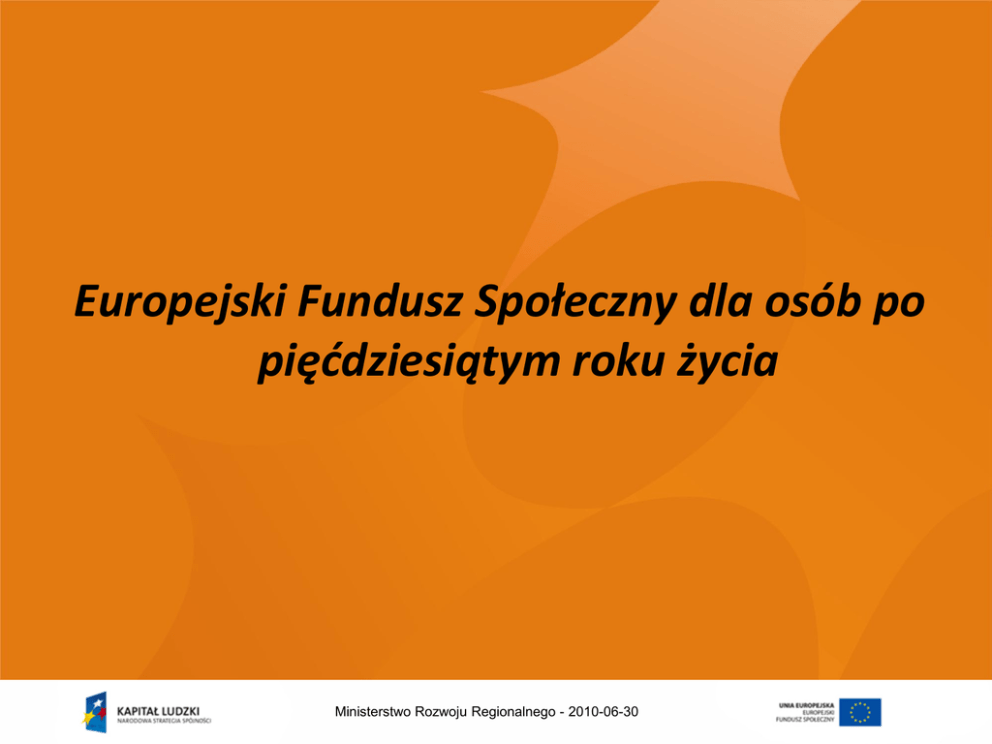 Europejski Fundusz Społeczny dla osób po pięddziesiątym roku życia Ministerstwo Rozwoju Regionalnego - 2010-06-30 Informacje ogólne • Europejski Fundusz Społeczny, to jeden z funduszy Unii Europejskiej, który finansuje działania paostw unijnych w zakresie przeciwdziałania bezrobociu i rozwoju zasobów ludzkich. • Program Kapitał Ludzki to jeden z programów wchodzących w skład Narodowej Strategii Spójności, które są realizowane w Polsce w latach 2007 – 2013. Głównym celem programu jest wzrost poziomu zatrudnienia i spójności społecznej. Jest to największy program w historii Unii Europejskiej finansowany ze środków Europejskiego Funduszu Społecznego, jego budżet to 11,4 mld euro. • Program Kapitał Ludzki wspiera takie obszary jak: – zatrudnienie, – edukacja, – integracja społeczna, – rozwój potencjału pracowników i przedsiębiorstw, – budowa sprawnej i skutecznej administracji publicznej. Ministerstwo Rozwoju Regionalnego - 2010-06-30 Informacje ogólne W ramach PO KL dofinansowywane są inicjatywy mające na celu m.in.: • • • • • aktywizację osób bezrobotnych i biernych zawodowo, zapobieganie wykluczeniu społecznemu, zapewnienie równego dostępu do zatrudnienia osobom i grupom społecznym doświadczającym dyskryminacji na rynku pracy, podnoszenie lub zmianę kwalifikacji zawodowych, promocję przedsiębiorczości i samozatrudnienia. Jedną z grup docelowych, do których takie inicjatywy są kierowane są osoby powyżej 50 roku życia, które wymagają szczególnego wsparcia i ochrony na rynku pracy. Ministerstwo Rozwoju Regionalnego - 2010-06-30 Instytucje zaangażowane w realizację Programu Instytucja Zarządzająca (IZ) – odpowiada za właściwe zarządzanie i wdrażanie programu operacyjnego. W PO KL funkcję tę pełni Department Zarządzania Europejskim Funduszem Społecznym w Ministerstwie Rozwoju Regionalnego. Instytucje Pośredniczące (IP) – instytucje, którym IZ powierzyła zarządzanie i nadzór nad realizacją poszczególnych Priorytetów. Dla Priorytetów centralnych (od I do V) funkcję tę pełnią właściwi ministrowie: - Minister Pracy i Polityki Społecznej - Minister Edukacji Narodowej - Minister Nauki i Szkolnictwa Wyższego dla priorytetów regionalnych – samorządy województw (Funkcję IP zazwyczaj pełnią Urzędy Marszałkowskie) Instytucje Pośredniczące II stopnia (IP2) – instytucje, którym ze względu na specyfikę Priorytetu oraz doświadczenia instytucji działających w danym obszarze IP może przekazad częśd swoich obowiązków. IP2 odpowiadają przede wszystkim za ogłaszanie konkursów i ocenę wniosków i najczęściej ich funkcję pełnią Wojewódzkie Urzędy Pracy. Ministerstwo Rozwoju Regionalnego - 2010-06-30 Struktura Programu Program Operacyjny Kapitał Ludzki został podzielony na 10 priorytetów – 9 o charakterze „tematycznym” oraz 1 dodatkowy priorytet „Pomoc techniczna”, który ma na celu pomoc instytucjom zaangażowanym w realizację programu w jego sprawnym zarządzaniu i wdrażaniu. Priorytety PO KL: Centralne: – I Zatrudnienie i integracja społeczna – II Rozwój zasobów ludzkich i potencjału adaptacyjnego przedsiębiorstw oraz poprawa stanu zdrowia osób pracujących – III Wysoka jakośd systemu oświaty – IV Szkolnictwo wyższe i nauka – V Dobre rządzenie Regionalne: – VI Rynek pracy otwarty dla wszystkich – VII Promocja integracji społecznej – VIII Regionalne kadry gospodarki – IX Rozwój wykształcenia i kompetencji w regionach – X Pomoc Techniczna Ministerstwo Rozwoju Regionalnego - 2010-06-30 Wsparcie dla osób 50+ Priorytet VI – Rynek pracy otwarty dla wszystkich • Warsztaty i szkolenia z zakresu technik aktywnego poszukiwania pracy, tworzenie indywidualnych planów działania. • Aktywizacja osób bezrobotnych (szkolenia, staże, prace interwencyjne, przyznanie jednorazowych środków na rozpoczęcie działalności gospodarczej). • Wsparcie psychologiczno-doradcze osób wchodzących i powracających na rynek pracy. • Upowszechnianie i promocja elastycznych form zatrudnienia oraz metod organizacji pracy. • Przyznawanie dotacji na założenie własnej firmy wraz ze wsparciem szkoleniowym i finansowym. • Projekty przyczyniające się do aktywizacji zawodowej mieszkaoców obszarów wiejskich. Ministerstwo Rozwoju Regionalnego - 2010-06-30 Wsparcie dla osób 50+ Priorytet VII Promocja integracji społecznej • Kursy i szkolenia umożliwiające nabycie, podniesienie lub zmianę kwalifikacji zawodowych dla osób zagrożonych wykluczeniem społecznym. • Poradnictwo psychologiczne, psychospołeczne, zawodowe prowadzące do integracji społecznej i zawodowej. • Rozwój form zatrudnienia i wsparcie tworzenia miejsc pracy dla osób należących do grup szczególnego ryzyka ( elastyczne formy zatrudnienia). Priorytet VIII Regionalne kadry gospodarki • Szkolenia, kursy i poradnictwo zawodowe skierowane do osób dorosłych, pracujących, które z własnej inicjatywy są zainteresowane nabyciem nowych, uzupełnieniem lub podwyższeniem kwalifikacji i umiejętności. • Szkolenia przekwalifikowujące i usługi doradcze w zakresie wyboru nowego zawodu i zdobycia nowych umiejętności zawodowych (w tym indywidualne plany działao i pomoc w wyborze odpowiedniego zawodu i miejsca zatrudnienia). Ministerstwo Rozwoju Regionalnego - 2010-06-30 Wsparcie dla osób 50+ Priorytet IX Rozwój wykształcenia i kompetencji w regionach • Kształcenie osób dorosłych, które z własnej inicjatywy zainteresowane są uzupełnieniem lub podwyższeniem swojego wykształcenia i kwalifikacji ogólnych i zawodowych. • Usługi doradcze w zakresie wyboru kierunku i formy kształcenia. W celu zwiększenia udziału osób po 50 roku życia w realizowanych projektach, przyjmowane są specjalne kryteria wyboru projektów (dostępu I strategiczne) premiujące projekty adresowane do te grupy docelowej. Ministerstwo Rozwoju Regionalnego - 2010
