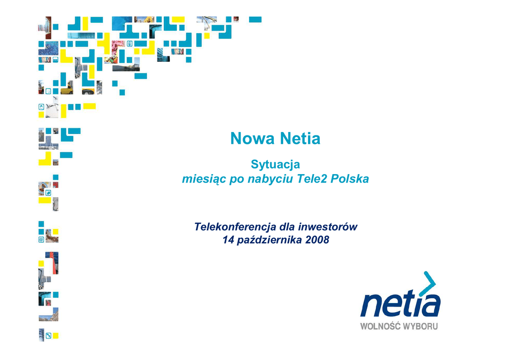 Nowa Netia Sytuacja miesiąc po nabyciu Tele2 Polska Telekonferencja dla inwestorów 14 października 2008 Informacje zawarte w niniejszej prezentacji zawierają stwierdzenia dotyczące przyszłości (prognozy). Prognozy te nie stanowią gwarancji przyszłych wyników oraz wiąŜą się z ryzykiem i brakiem pewności realizacji tych prognoz. Z uwagi na wystąpienie szeregu czynników faktyczne wyniki osiągnięte przez Netię mogą róŜnić się w istotnym zakresie od wyników przedstawionych w informacjach prognostycznych. Szczegółowy opis czynników ryzyka związanych z inwestowaniem w papiery wartościowe Netii znajduje się w raporcie rocznym Netii za 2007 rok opublikowanym w dniu 28 lutego 2008 r. i w raporcie za I półrocze 2008 r. z dnia 12 sierpnia 2008 roku. Netia niniejszym oświadcza, Ŝe nie jest zobowiązana do aktualizacji lub korygowania publikowanych prognoz. 2 Agenda Jaka jest Nowa Netia Integracja z Tele2 Polska i wynikające z niej synergie Aktualizacja prognozy na 2008 r. Wstępna prognoza na 2009 r. Aktualizacja prognozy średnioterminowej 3 Nowa Netia – wiodący operator alternatywny w Polsce Prawie trzykrotnie większa pod względem przychodów niŜ drugi co do wielkości operator alternatywny Wiodący operator alternatywny w sektorze usług szerokopasmowych i głosowych PodwyŜszona prognoza krótko- i średnioterminowa: podwyŜszona prognoza EBITDA na 2008 r. ze 125 mln zł do 145 mln zł 55% wzrostu EBITDA do poziomu 225 mln zł jako cel na 2009 r. Wcześniejsze osiągnięcie zysku netto (realizacja celu w 2010 r. zamiast w 2011 r.) 4 Jaka jest Nowa Netia Niekwestionowany lider usług głosowych wśród operatorów alternatywnych Klienci Klienci usług usług głosowych głosowych wg wg technologii na 30 września 2008 technologii na 30 września 2008 r. r. Udział Udział pro-forma pro-forma w w rynku rynku na 30 czerwca 2008 na 30 czerwca 2008 r. r. 100% 80% WLR 78% 65% 60% 40% tys. Linie głosowe 1 000 20% 17% 13% 5% ` 750 0% Nowa Netia Netia Tele2 Dialog Inni 500 Łączna liczba linii aktywnych 250 tys. 8400 0 Netia Tele2 Polsk a Bezpośrednie usługi głosowe VoIP 1500 Nowa Netia WiMAX głos WLR ` Ponad 1.050 tys. klientów usług głosowych obsługiwanych na dzień 30 września 2008 r. 991 1000 500 489 502 527 Netia Tele2 Dialog 0 TP Nowa Netia 38% klientów usług głosowych obsługiwanych bezpośrednio we własnych sieciach lokalnych Netii 5 Jaka jest Nowa Netia Niekwestionowany lider usług szerokopasmowych wśród operatorów alternatywnych Klienci Klienci usług usług szerokopasmowych szerokopasmowych wg wg technologii na 30 września 2008 r. technologii na 30 września 2008 r. Udział Udział pro-forma pro-forma w w rynku rynku na 30 czerwca 2008 na 30 czerwca 2008 r. r. BSA (bitstream) 100% 86% 74% 80% Porty sz erokopasmowe 60% (ty s.) 400 40% 20% ` 11% 11% 3% 0% 200 Nowa Netia Netia Tele2 Dialog Inni Łączna liczba portów szerokopasmowych 0 (tys.) Netia sieć miedziana, TVK i LLU Tele2 Polska s ieć Ethernet Nowa Netia Wimax 1000 2124 BSA 500 315 292 ` Ponad 345 tys. klientów szerokopasmowych obsługiwanych na dzień 30 września 2008 r. 124 23 0 Grupa TP Nowa Netia Netia Tele2 Dialog 42% klientów szerokopasmowych obsługiwanych bezpośrednio we własnych sieciach lokalnych Netii 6 Tele2 Polska - integracja i synergie Wyniki Tele2 Polska w momencie przejęcia Dane finansowe (w mln zł) Przychody I półrocze I półrocze 2008 2007 230,4 180,8 EBITDA 27,5 1,1 Zysk netto 17,7 (9,7) Aktywa operacyjne 15,7 51,2 Preselekcja 205 450 WLR 502 337 23 0 52 38 Szybki wzrost EBITDA dzięki usługom WLR i płaskim stawkom w rozliczeniach międzyoperatorskich Model biznesowy oparty na outsourcingu procesów i usług Klienci (w tys.) Usł. szerokopasm. Zatrudnienie 7 Tele2 Polska - integracja i synergie Podtrzymana prognoza dotycząca kluczowych synergii do osiągnięcia w ciągu 12 miesięcy po zamknięciu transakcji: Synergie z tytułu przekierowania ruchu do sieci Netii: 20 mln zł rocznie Oszczędności w kosztach reklamy i promocji: 10 mln zł rocznie Proces integracji operacyjnej realizowany zgodnie z planem: Powołany zespół integracyjny, rozpoczęte procesy integracyjne Oferty WLR zsynchronizowane w październiku 2008 r. Przygotowany plan integracji pod marką Netii Integracja funkcji sprzedaŜy, obsługi klienta i funkcji wsparcia w toku Identyfikacja klientów do transferu z WLR na sieć miedzianą Netii lub LLU w toku Przeniesienie pracowników Tele2 Polska do biura Netii 8 Zaktualizowana prognoza na 2008 r. W mln zł, o ile nie podano inaczej Netia Netia Poprzednia Poprzednia prognoza prognoza Nowa Nowa Netia Netia z z Tele2 Tele2 Polska Polska od 15.09.2008 od 15.09.2008 Klienci usług szerokopasmowych (tys.) > 400 > 400 Klienci usług głosowych (własna sieć + WLR) (tys.) > 580 > 1.080 125 125 960 - 975 1.100 EBITDA 125 145 Nakłady inwestycyjne 240 240 60 30 Liczba uwolnionych węzłów (LLU) (sztuki) Przychody Przejęcia spółek ethernetowych Prognoza EBITDA podwyŜszona do 145 mln zł PoniewaŜ zamkniecie kilku duŜych transakcji nabycia spółek ethernetowych moŜe nie nastąpić do końca 2008 r., zarząd utrzymuje prognozę dot. bazy klientów usług szerokopasmowych na poziomie powyŜej 400 tys. 9 Najistotniejsze skutki nabycia Tele2 Polska Netia jest obecnie dominującym operatorem alternatywnym na rynku klientów przyłączanych z wykorzystaniem linii TP, a takŜe liderem w rozwoju LLU Znaczący wzrost skali pozwala na większą redukcję kosztów i optymalizację procesów Netia charakteryzuje się duŜą płynnością i moŜe rozwaŜać kolejne akwizycje dostępne środki pienięŜne netto w kwocie ponad 200 mln zł dostępne linie kredytowe w kwocie 375 mln zł 10 Wstępna prognoza na 2009 r. Kwoty w mln zł Wynik Wynik za za 2007 2007 r. r. Prognoza Prognoza na na 2008 2008 r. r. Prognoza Prognoza na na 2009 2009 r. r. Przychody 838 1.100 1.500 EBITDA 171 145 225 Nakłady inwestycyjne 244 240 280 39 30 75 Przejęcia spó