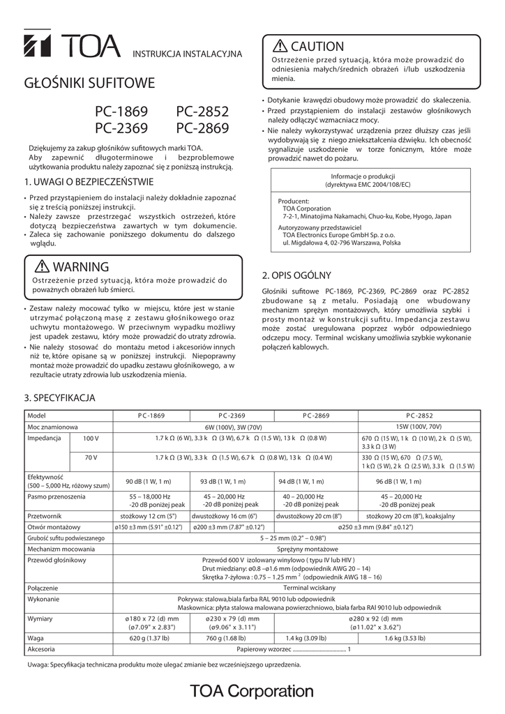 CAUTION INSTRUKCJA INSTALACYJNA Ostrzeżenie przed sytuacją, która może prowadzić do odniesienia małych/średnich obrażeń i/lub uszkodzenia mienia. GŁOŚNIKI SUFITOWE PC-1869 PC-2369 • Dotykanie krawędzi obudowy może prowadzić do skaleczenia. • Przed przystąpieniem do instalacji zestawów głośnikowych należy odłączyć wzmacniacz mocy. • Nie należy wykorzystywać urządzenia przez dłuższy czas jeśli wydobywają się z niego zniekształcenia dźwięku. Ich obecność sygnalizuje uszkodzenie w torze fonicznym, które może prowadzić nawet do pożaru. PC-2852 PC-2869 Dziękujemy za zakup głośników sufitowych marki TOA. Aby zapewnić długoterminowe i bezproblemowe użytkowania produktu należy zapoznać się z poniższą instrukcją. Informacje o produkcji (dyrektywa EMC 2004/108/EC) 1. UWAGI O BEZPIECZEŃSTWIE • Przed przystąpieniem do instalacji należy dokładnie zapoznać się z treścią poniższej instrukcji. • Należy zawsze przestrzegać wszystkich ostrzeżeń, które dotyczą bezpieczeństwa zawartych w tym dokumencie. • Zaleca się zachowanie poniższego dokumentu do dalszego wglądu. Producent: TOA Corporation 7-2-1, Minatojima Nakamachi, Chuo-ku, Kobe, Hyogo, Japan Autoryzowany przedstawiciel TOA Electronics Europe GmbH Sp. z o.o. ul. Migdałowa 4, 02-796 Warszawa, Polska WARNING 2. OPIS OGÓLNY Ostrzeżenie przed sytuacją, która może prowadzić do poważnych obrażeń lub śmierci. Głośniki sufitowe PC-1869, PC-2369, PC-2869 oraz PC-2852 zbudowane są z metalu. Posiadają one wbudowany mechanizm sprężyn montażowych, który umożliwia szybki i prosty montaż w konstrukcji sufitu. Impedancja zestawu może zostać uregulowana poprzez wybór odpowiedniego odczepu mocy. Terminal wciskany umożliwia szybkie wykonanie połączeń kablowych. • Zestaw należy mocować tylko w miejscu, które jest w stanie utrzymać połączoną masę z zestawu głośnikowego oraz uchwytu montażowego. W przeciwnym wypadku możliwy jest upadek zestawu, który może prowadzić do utraty zdrowia. • Nie należy stosować do montażu metod i akcesoriów innych niż te, które opisane są w poniższej instrukcji. Niepoprawny montaż może prowadzić do upadku zestawu głośnikowego, a w rezultacie utraty zdrowia lub uszkodzenia mienia. 3. SPECYFIKACJA Model P C -1 8 6 9 P C -2 3 6 9 Moc znamionowa Impedancja P C -2 8 6 9 P C -2 8 5 2 15W (100V, 70V) 6W (100V), 3W (70V) 100 V 1.7 k Ω (6 W), 3.3 k Ω (3 W), 6.7 k Ω (1.5 W), 13 k Ω (0.8 W) 670 Ω (15 W), 1 k Ω (10 W), 2 k Ω (5 W), 3.3 k Ω (3 W) 70 V 1.7 k Ω (3 W), 3.3 k Ω (1.5 W), 6.7 k Ω (0.8 W), 13 k Ω (0.4 W) 330 Ω (15 W), 670 Ω (7.5 W), 1 k Ω (5 W), 2 k Ω (2.5 W), 3.3 k Ω (1.5 W) Efektywność (500 – 5,000 Hz, różowy szum) Pasmo przenoszenia Przetwornik Otwór montażowy 90 dB (1 W, 1 m) 93 dB (1 W, 1 m) 55 – 18,000 Hz -20 dB poniżej peak stożkowy 12 cm (5") 94 dB (1 W, 1 m) 45 – 20,000 Hz -20 dB poniżej peak 40 – 20,000 Hz -20 dB poniżej peak dwustożkowy 16 cm (6") ø150 ±3 mm (5.91" ±0.12") 45 – 20,000 Hz -20 dB poniżej peak dwustożkowy 20 cm (8") ø200 ±3 mm (7.87" ±0.12") Grubość sufitu podwieszanego 96 dB (1 W, 1 m) stożkowy 20 cm (8"), koaksjalny ø250 ±3 mm (9.84" ±0.12") 5 – 25 mm (0.2" – 0.98") Mechanizm mocowania Sprężyny montażowe Przewód głośnikowy Przewód 600 V izolowany winylowo ( typu IV lub HIV ) Drut miedziany: ø0.8 –ø1.6 mm (odpowiednik AWG 20 – 14) Skrętka 7-żyłowa : 0.75 – 1.25 mm 2 (odpowiednik AWG 18 – 16) Połączenie Terminal wciskany Wykonanie Pokrywa: stalowa,biala farba RAL 9010 lub odpowiednik Maskownica: płyta stalowa malowana powierzchniowo, biała farba RAl 9010 lub odpowiednik Wymiary Waga Akcesoria ø 1 8 0 x 7 2 ( d) mm ( ø 7 . 0 9 " x 2 . 8 3 ") 620 g (1.37 lb) ø 2 3 0 x 7 9 ( d) mm ( ø 9 . 0 6 " x 3 . 1 1 ") 760 g (1.68 lb) ø 2 8 0 x 9 2 ( d) mm ( ø 1 1 . 0 2 " x 3 . 6 2 ") 1.4 kg (3.09 lb) Papierowy wzorzec ...................................... 1 Uwaga: Specyfikacja techniczna produktu może ulegać zmianie bez wcześniejszego uprzedzenia. 1.6 kg (3.53 lb) 4. INSTALACJA Krok 1. Posługując się papierowym wzorcem głośnika wykonać otwór instalacyjny wymaganych rozmiarów w konstrukcji øA 5 – 25 mm (0.2” – 0.98”) Model No. PC-1869 PC-2369 PC-2852/2869 3-2. Ustawić pożądaną impedancję zestawu Ustawienia impedancji zestawu głośnikowego wykonuje się poprzez przepięcie odczepu mocy przy transformatorze linii głośnikowej. Fabrycznie wartość impedancji ustawiona jest na 670 Ohm dla PC-2852 oraz 1,7 kOhm dla PC-1869/2369/2869. øA ø150 ±3 mm (ø5.91" ±0.12") ø200 ±3 mm (ø7.87" ±0.12") ø250 ±3 mm (ø9.84" ±0.12") 13kΩ H O T (Czarny) 1.7kΩ 6.7kΩ C O M (Biały) COM 3.3kΩ Transformator dopasowany do PC-1869/2369/2869 Krok 2. Zahaczyć sprężyny montażowe głośnika o krawędzi [PC-1869/2369/2869] Tkanina osłaniająca przed kurzem (konektor odsłonięty) Impedancja 1.7 k Ω 3.3 k Ω 6.7 k Ω 13 k Ω 100 V line 6W 3W 1.5 W 0.8 W 70 V line 3W 1.5 W 0.8 W 0.4 W Sprężyna montażowa [PC-2852] Impedancja 100 V 70 V Zestaw głośnikowy PC-1869. Krok 3. Wykonać połączenie przewodów. Krok 4. Transformator mocy Przewód głośnikowy (od wzmacniacza) 1 kΩ 10 W 5W 2 kΩ 5W 2.5 W 3.3 k Ω 3W 1.5 W Nigdy nie należy wykorzystywać impedancji 330 Ohm w wypadku linii 100V. Będzie to prowadzić do uszkodzenia głośnika w skutek podania zbyt dużej mocy do przetwornika. 3-1. Należy wprowadzić przewody prowadzące od wzmacniacza mocy oraz wychodzące do kolejnego głośnika do terminala. [w połączeniu równoległym) 330 Ω 670 Ω 15 W 15 W 7.5 W Wepchnąć powierzchnię panelu przedniego do otworu montażowego. 5. SCHEMAT OKABLOWANIA 5.1. PC-1869/2369/2869 Terminal wejściowy Terminal wejściowy Przewód głośnikowy (do kolejnego głośnika) Terminal wejściowy 9 mm (0.35”) Rysunek pokazuje zestaw PC-1869 po usunięciu tkaniny ochronnej. COM (–) Od wzmacniacza HOT (+) Do k