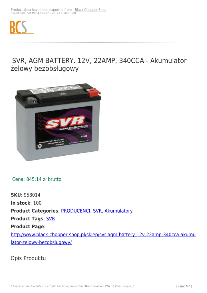 Product data have been exported from - Black Chopper Shop Export date: Sat Mar 4 11:28:56 2017 / +0000 GMT SVR, AGM BATTERY. 12V, 22AMP, 340CCA - Akumulator żelowy bezobsługowy Cena: 845.14 zł brutto SKU: 958014 In stock: 100 Product Categories: PRODUCENCI, SVR, Akumulatory Product Tags: SVR Product Page: http://www.black-chopper-shop.pl/sklep/svr-agm-battery-12v-22amp-340cca-akumu lator-zelowy-bezobslugowy/ Opis Produktu [ Export product details as PDF file has been powered by WooCommerce PDF & Print plugin. ] | Page 1/2 | Product data have been exported from - Black Chopper Shop Export date: Sat Mar 4 11:28:56 2017 / +0000 GMT Akumulator 12V, 22AMP, 340CCA żelowy, bezobsługowy Bardzo wytrzymały akumulator, którego parametry nie odbiegają do oryginalnych aku HD Wymiary: Długość 206.5MM X Szerokość 87MM X Wysokość 162MM Część jest zamiennikiem oryginału nr oem: 66010-82A Do modeli: 80-96 FLT(NU) ZAPYTAJ O DOSTĘPNOŚĆ I CENĘ PRODUKTÓW PASUJĄCYCH DO TWOJEGO MODELU MOTOCYKLA!!! [ Export product details as PDF file has been powered by WooCommerce PDF & Print plugin. ] | Page 2/2 |