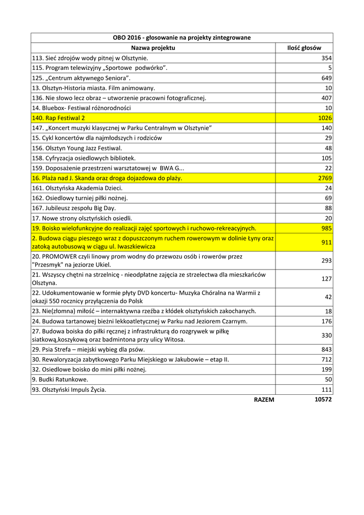 OBO 2016 - głosowanie na projekty zintegrowane Nazwa projektu 113. Sieć zdrojów wody pitnej w Olsztynie. 115. Program telewizyjny „Sportowe podwórko”. 125. „Centrum aktywnego Seniora”. 13. Olsztyn-Historia miasta. Film animowany. 136. Nie słowo lecz obraz – utworzenie pracowni fotograficznej. 14. Bluebox- Festiwal różnorodności 140. Rap Festiwal 2 147. „Koncert muzyki klasycznej w Parku Centralnym w Olsztynie” 15. Cykl koncertów dla najmłodszych i rodziców 156. Olsztyn Young Jazz Festiwal. 158. Cyfryzacja osiedlowych bibliotek. 159. Doposażenie przestrzeni warsztatowej w BWA G... 16. Plaża nad J. Skanda oraz droga dojazdowa do plaży. 161. Olsztyńska Akademia Dzieci. 162. Osiedlowy turniej piłki nożnej. 167. Jubileusz zespołu Big Day. 17. Nowe strony olsztyńskich osiedli. 19. Boisko wielofunkcyjne do realizacji zajęć sportowych i ruchowo-rekreacyjnych. 2. Budowa ciągu pieszego wraz z dopuszczonym ruchem rowerowym w dolinie Łyny oraz zatoką autobusową w ciągu ul. Iwaszkiewicza 20. PROMOWER czyli linowy prom wodny do przewozu osób i rowerów przez "Przesmyk" na jeziorze Ukiel. 21. Wszyscy chętni na strzelnicę - nieodpłatne zajęcia ze strzelectwa dla mieszkańców Olsztyna. 22. Udokumentowanie w formie płyty DVD koncertu- Muzyka Chóralna na Warmii z okazji 550 rocznicy przyłączenia do Polsk 23. Nie(złomna) miłość – internaktywna rzeźba z kłódek olsztyńskich zakochanych. 24. Budowa tartanowej bieżni lekkoatletycznej w Parku nad Jeziorem Czarnym. 27. Budowa boiska do piłki ręcznej z infrastrukturą do rozgrywek w piłkę siatkową,koszykową oraz badmintona przy ulicy Witosa. 29. Psia Strefa – miejski wybieg dla psów. 30. Rewaloryzacja zabytkowego Parku Miejskiego w Jakubowie – etap II. 32. Osiedlowe boisko do mini piłki nożnej. 9. Budki Ratunkowe. 93. Olsztyński Impuls Życia. RAZEM Ilość głosów 354 5 649 10 407 10 1026 140 29 48 105 22 2769 24 69 88 20 985 911 293 127 42 18 176 330 843 712 199 50 111 10572