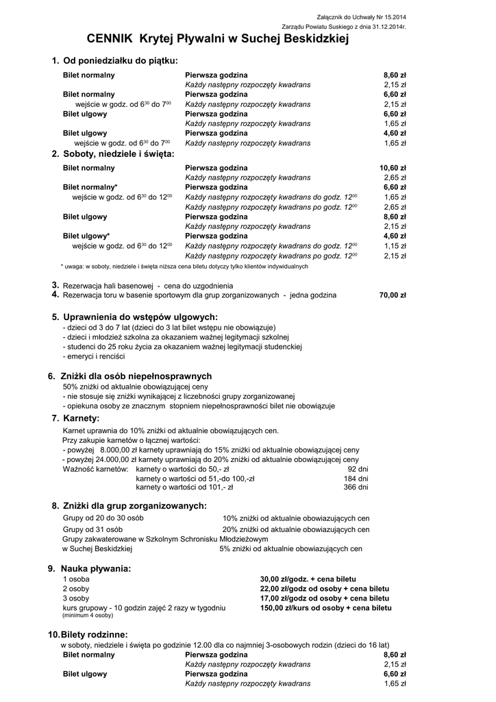 Załącznik do Uchwały Nr 15.2014 Zarządu Powiatu Suskiego z dnia 31.12.2014r. CENNIK Krytej Pływalni w Suchej Beskidzkiej 1. Od poniedziałku do piątku: Bilet normalny Bilet normalny wejście w godz. od 630 do 700 Bilet ulgowy Bilet ulgowy wejście w godz. od 630 do 700 Pierwsza godzina Każdy następny rozpoczęty kwadrans Pierwsza godzina Każdy następny rozpoczęty kwadrans Pierwsza godzina Każdy następny rozpoczęty kwadrans Pierwsza godzina Każdy następny rozpoczęty kwadrans 8,60 zł 2,15 zł 6,60 zł 2,15 zł 6,60 zł 1,65 zł 4,60 zł 1,65 zł 2. Soboty, niedziele i święta: Bilet normalny Bilet normalny* wejście w godz. od 630 do 1200 Bilet ulgowy Bilet ulgowy* wejście w godz. od 630 do 1200 Pierwsza godzina Każdy następny rozpoczęty kwadrans Pierwsza godzina Każdy następny rozpoczęty kwadrans do godz. 1200 Każdy następny rozpoczęty kwadrans po godz. 1200 Pierwsza godzina Każdy następny rozpoczęty kwadrans Pierwsza godzina Każdy następny rozpoczęty kwadrans do godz. 1200 Każdy następny rozpoczęty kwadrans po godz. 1200 10,60 zł 2,65 zł 6,60 zł 1,65 zł 2,65 zł 8,60 zł 2,15 zł 4,60 zł 1,15 zł 2,15 zł * uwaga: w soboty, niedziele i święta niższa cena biletu dotyczy tylko klientów indywidualnych 3. Rezerwacja hali basenowej - cena do uzgodnienia 4. Rezerwacja toru w basenie sportowym dla grup zorganizowanych - jedna godzina 70,00 zł 5. Uprawnienia do wstępów ulgowych: - dzieci od 3 do 7 lat (dzieci do 3 lat bilet wstępu nie obowiązuje) - dzieci i młodzież szkolna za okazaniem ważnej legitymacji szkolnej - studenci do 25 roku życia za okazaniem ważnej legitymacji studenckiej - emeryci i renciści 6. Zniżki dla osób niepełnosprawnych 50% zniżki od aktualnie obowiązującej ceny - nie stosuje się zniżki wynikającej z liczebności grupy zorganizowanej - opiekuna osoby ze znacznym stopniem niepełnosprawności bilet nie obowiązuje 7. Karnety: Karnet uprawnia do 10% zniżki od aktualnie obowiązujących cen. Przy zakupie karnetów o łącznej wartości: - powyżej 8.000,00 zł karnety uprawniają do 15% zniżki od aktualnie obowiązującej ceny - powyżej 24.000,00 zł karnety uprawniają do 20% zniżki od aktualnie obowiązującej ceny Ważność karnetów: karnety o wartości do 50,- zł 92 dni karnety o wartości od 51,-do 100,-zł 184 dni karnety o wartości od 101,- zł 366 dni 8. Zniżki dla grup zorganizowanych: Grupy od 20 do 30 osób 10% zniżki od aktualnie obowiazujących cen Grupy od 31 osób 20% zniżki od aktualnie obowiazujących cen Grupy zakwaterowane w Szkolnym Schronisku Młodzieżowym w Suchej Beskidzkiej 5% zniżki od aktualnie obowiazujących cen 9. Nauka pływania: 1 osoba 2 osoby 3 osoby kurs grupowy - 10 godzin zajęć 2 razy w tygodniu (minimum 4 osoby) 30,00 zł/godz. + cena biletu 22,00 zł/godz od osoby + cena biletu 17,00 zł/godz od osoby + cena biletu 150,00 zł/kurs od osoby + cena biletu 10.Bilety rodzinne: w soboty, niedziele i święta po godzinie 12.00 dla co najmniej 3-osobowych rodzin (dzieci do 16 lat) Bilet normalny Pierwsza godzina 8,60 zł Każdy następny rozpoczęty kwadrans 2,15 zł Bilet ulgowy Pierwsza godzina 6,60 zł Każdy następny rozpoczęty kwadrans 1,65 zł KRYTA PŁYWALNIA W SUCHEJ BESKIDZKIEJ Zał. Do Uchwały Nr. 0063/ii/634/06 Zarządu Powiatu w Suchej Beskidzkiej z dnia 22.11.2006 r. TEL. 0-33- 874-55-30 CENNIK 1. OD PONIEDZIAŁKU DO PIĄTKU: Wstęp normalny Pierwsza godzina Każdy następny rozpoczęty kwadrans Wstęp normalny w godzinach Pierwsza godzina od 630 do 700* Każdy następny rozpoczęty kwadrans Wstęp ulgowy Pierwsza godzina Każdy następny rozpoczęty kwadrans Wstęp ulgowy w godzinach Pierwsza godzina Każdy następny rozpoczęty kwadrans od 630 do 700* * godzina wejścia na basen 2. SOBOTA, NIEDZIELA I ŚWIĘTA : Wstęp normalny Pierwsza godzina Każdy następny rozpoczęty kwadrans Wstęp normalny w godzinach Pierwsza godzina Każdy następny rozpoczęty kwadrans do godz. 12 00 od 630 do 1200 Każdy następny rozpoczęty kwadrans po godz. 12 00 Wstęp ulgowy Pierwsza godzina Każdy następny rozpoczęty kwadrans Wstęp ulgowy w godzinach Pierwsza godzina Każdy następny rozpoczęty kwadrans do godz. 12 00 od 630 do 1200 Każdy następny rozpoczęty kwadrans po godz. 12 00 3. Korzystanie ze zjeżdżalni i jacuzzi na hali basenowej wkalkulowane jest w cenę biletu. 4. Uprawnienia do wstępów ulgowych: - dzieci od 3 do 7 lat - dzieci i młodzież szkolna za okazaniem ważnej legitymacji szkolnej - studenci do 25 roku życia za okazaniem ważnej legitymacji studenckiej - dzieci do 3 lat bilet wstępu nie obowiązuje ( wiek dziecka należy udokumentować ) - emeryci i renciści w godzinach od 630 do 1500 - członkowie klubów sportowych w zorganizowanych grupach za okazaniem ważnej legitymacji przynależności do klubu sportowego 5. Karnety: karnet uprawnia do 10 % zniżki od aktualnie obowiązujących cen. Przy zakupie karnetów o łącznej wartości powyżej 22.000,- zł, karnet uprawnia do 20% zniżki od aktualnie obowiązujących cen. 6. Upusty dla grup zorganizowanych: 2) Grupy od 21 do 30 osób - 15 % zniżki od aktualnie obowiązujących cen 3) Grupy od 31 osób - 20 % zniżki od aktualnie obowiązujących cen 4) Dla zorganizowanych grup szkolnych z terenu gmin: Maków Podhalański, Budzów, Stryszawa i Zembrzyce - dodatkowo 5% zniżki od aktualnie obowiązujących cen. 5) Członkowie PTSM, IYHF za okazaniem ważnej legitymacji oraz grupy zorganizowane Szkolnego Schroniska Młodzieżowego w Suchej Beskidzkiej - 5% zniżki od aktualnie obowiązujących cen. o Uchwały Nr. 0063/ii/634/06 kidzkiej z dnia 22.11.2006 r. 6,60 zł 1,65 zł 4,60 zł 1,65 zł 4,60 zł 1,65 zł 2,60 zł 1,15 zł 8,60 zł 2,15 zł 4,60 zł 1,15 zł 2,15 zł 6,60 zł 1,65 zł 2,60 zł 0,65 zł 1,65 zł e e KRYTA PŁYWALNIA W SUCHEJ BESKIDZKIEJ TEL. 0-33- 874-55-30 CENNIK - PROJEKT(14.11.2006) 1. OD PONIEDZIAŁKU DO PIĄTKU: Wstęp normalny Wstęp normalny w godzinach od 6