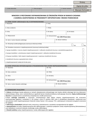 Drukuj POLA JASNE WYPEŁNIA WNIOSKODAWCA, POLA CIEMNE WYPWŁNIA PCPR W GNIEŹNIE. WYPEŁNIC DRUKOWANYMI LITERAMI. Zapisz do pliku 1. Liczba dziennika 2. Data przyjęcia 3. Numer wniosku Wyczyść formularz WNIOSEK O PRZYZNANIE DOFINANSOWANIA ZE ŚRODKÓW PFRON W RAMACH ZADANIA Z ZAKRESU ZAOPATRZENIA W PRZEDMIOTY ORTOPEDYCZNE I ŚRODKI POMOCNICZE A. DANE OSOBY UBIEGAJĄCEJ SIĘ O DOFINANSOWANIE 4. Nazwisko 6. Data urodzenia 5. Imię 7. PESEL 8. Ulica 9. Nr domu 11. Miejscowośd 12. Kod pocztowy 13. Seria i numer dowodu osobistego 10. Nr lokalu 62-290 Mieścisko 14. Numer telefonu 15. Otrzymuje zasiłek pielęgnacyjny (zaznaczyd właściwą kratkę) Tak Nie 16. Posiadane orzeczenie o niepełnosprawności (zaznaczyd właściwą kratkę) I grupa inwalidzka | znaczny stopieo niepełnosprawności | całkowita niezdolnośd do pracy i samodzielnej egzystencji II grupa inwalidzka | umiarkowany stopieo niepełnosprawności | całkowita niezdolnośd do pracy III grupa inwalidzka | lekki stopieo niepełnosprawności | częściowa niezdolnośd do pracy niezdolnośd do pracy w gospodarstwie rolnym niepełnosprawnośd osoby do 16 roku życia B. DANE OPIEKUNA WYSTĘPUJĄCEGO Z PEŁNOMOCNICTWA OSOBY NIEPEŁNOSPRAWNEJ 17. Nazwisko 19. Data urodzenia 18. Imię 20. PESEL 21. Ulica 22. Nr domu 23. Miejscowośd 24. Kod pocztowy 25. Seria i numer dowodu osobistego 62-290 Mieścisko 26. Numer telefonu C. WYMAGANE ZAŁĄCZNIKI Faktura określająca kwotę opłaconą w ramach ubezpieczenia zdrowotnego oraz kwotę udziału własnego lub inny dokument potwierdzający zakup, wraz z potwierdzoną za zgodnośd (przez świadczeniodawcę realizującego zlecenie), kopią zrealizowanego zlecenia na zaopatrzenie w przedmioty ortopedyczne i środki pomocnicze. Kopia ważnego orzeczenia o znacznym, umiarkowanym bądź lekkim stopniu niepełnosprawności lub orzeczenia równoważnego (zgodnie z artykułem 5 i 62 ustawy z dnia 27 sierpnia 1997 roku o rehabilitacji zawodowej i społecznej oraz zatrudnianiu osób niepełnosprawnych Dziennik Ustaw Numer 123, pozycja 776 z późniejszymi zmianami) (oryginał orzeczenia do wglądu). Informacja o dochodach (odcinek renty, emerytury, zaświadczenie o wysokości wynagrodzenia) do wglądu. Upoważnienie od osoby niepełnosprawnej dla odbierającego z czytelnym podpisem osoby niepełnosprawnej (Wnioskodawcy) oraz dokładnym numerem dowodu osobistego osoby odbierającej. Dowód osobisty osoby niepełnosprawnej i osoby odbierającej (do wglądu). Strona 1 z 2 POLA JASNE WYPEŁNIA WNIOSKODAWCA, POLA CIEMNE WYPWŁNIA PCPR W GNIEŹNIE. WYPEŁNIC DRUKOWANYMI LITERAMI. D. OŚWIADCZENIE O DOCHODACH 27. Nazwisko 29. Stopieo pokrewieostwa z wnioskodawcą 28. Imię 30. Źródło dochodu* 31. Miesięczny dochód Wnioskodawca żona żona żona żona żona żona żona żona Miesięczny dochód wszystkich członków gospodarstwa domowego wynosi netto Liczba osób we wspólnym gospodarstwie domowym wynosi 20 osób Miesięczny dochód wszystkich członków podzielony przez liczbę osób w gospodarstwie domowym wynosi netto *Dochód rodziny stanowią: świadczenia ZUS – renta/emerytura, zasiłki rodzinne, zasiłki i dochody pielęgnacyjne, zasiłki stałe wypłacone przez ośrodki pomocy społecznej, wynagrodzenie za pracę, otrzymywane alimenty i inne przychody. E. DANE DOTYCZĄCE FORMY PRZEKAZANIA DOFINANSOWANIA 32. Ja niżej podpisany(a) wyrażam zgodę na przekazanie dofinansowania na rachunek bankowy numer E1. IMIĘ I NAZWISKO ORAZ ADRES ZAMIESZKANIA WŁAŚCICIELA KONTA 33. Nazwisko 34. Imię 35. Ulica 36. Nr domu 37. Miejscowośd 38. Kod pocztowy 62-290 Mieścisko F. OŚWIADCZENIE I PODPIS WNIOSKODAWCY Oświadczam, że powyższe dane są zgodne z prawdą oraz że jestem świadom(a) odpowiedzialności karnej za składanie nieprawdziwych danych (Artykuł 233 Kodeksu Karnego). Wyrażam zgodę na przetwarzanie moich danych osobowych zgodnie z ustawą z dnia 29 sierpnia 1997 roku o ochronie danych osobowych (Dz. U. Nr 101 z 2002r., poz. 926 z późniejszymi zmianami) dla potrzeb przyznania pomocy ze środków PFRON. Jednocześnie przyjmuję do wiadomości, że przysługuje mi prawo wglądu do podanych danych, ich zmiany oraz wycofania zgody na ich przetwarzanie, a podanie danych nastąpiło dobrowolnie. 39. Data 40. Czytelny podpis Wnioskodawcy . Strona 2 z 2