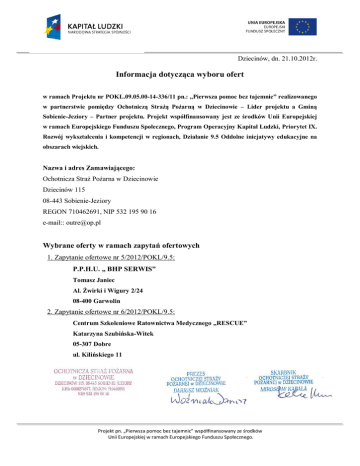 Dziecinów, dn. 21.10.2012r. Informacja dotycząca wyboru ofert w ramach Projektu nr POKL.09.05.00-14-336/11 pn.: ,,Pierwsza pomoc bez tajemnic” realizowanego w partnerstwie pomiędzy Ochotniczą Strażą Pożarną w Dziecinowie – Lider projektu a Gminą Sobienie-Jeziory – Partner projektu. Projekt współfinansowany jest ze środków Unii Europejskiej w ramach Europejskiego Funduszu Społecznego, Program Operacyjny Kapitał Ludzki, Priorytet IX. Rozwój wykształcenia i kompetencji w regionach, Działanie 9.5 Oddolne inicjatywy edukacyjne na obszarach wiejskich. Nazwa i adres Zamawiającego: Ochotnicza Straż Pożarna w Dziecinowie Dziecinów 115 08-443 Sobienie-Jeziory REGON 710462691, NIP 532 195 90 16 e-mail:: [email protected] Wybrane oferty w ramach zapytań ofertowych 1. Zapytanie ofertowe nr 5/2012/POKL/9.5: P.P.H.U. „ BHP SERWIS” Tomasz Janiec Al. Żwirki i Wigury 2/24 08-400 Garwolin 2. Zapytanie ofertowe nr 6/2012/POKL/9.5: Centrum Szkoleniowe Ratownictwa Medycznego „RESCUE” Katarzyna Szubińska-Witek 05-307 Dobre ul. Kilińskiego 11 Projekt pn. „Pierwsza pomoc bez tajemnic” współfinansowany ze środków Unii Europejskiej w ramach Europejskiego Funduszu Społecznego. Protokół z wyboru ofert dotyczących zapytania ofertowego nr 5/2012/POKL/9.5 I. Zamawiający Ochotnicza Straż Pożarna w Dziecinowie 08-443 Sobienie-Jeziory Dziecinów 115 II. Przedmiot zamówienia Przedmiotem zapytania jest wyłonienie Wykonawcy na realizację szkolenia „Kurs Ratownictwa Drogowego” dla członków jednostek Ochotniczych Straży Pożarnych z terenu gminy Sobienie-Jeziory - 30 osób podzielonych na 2 grupy szkoleniowe - w ramach projektu „Pierwsza pomoc bez tajemnic” realizowanego w ramach Programu Operacyjnego Kapitał Ludzki, Priorytet: IX Rozwój wykształcenia i kompetencji w regionach, Działanie: 9.5 Oddolne inicjatywy edukacyjne na obszarach wiejskich, zgodnie z warunkami określonymi w niniejszym zapytaniu ofertowym. Szczegółowy opis przedmiotu zamówienia został określony w zapytaniu ofertowym, przekazanym do potencjalnych Wykonawców, jak również zamieszczonym na stronie internetowej Zamawiającego oraz w jego siedzibie. II. Sposób upublicznienia zapytania ofertowego Zapytanie ofertowe zostało zamieszczone na stronie internetowej Zamawiającego http://dziecinow.pl/category/osp/ oraz w Biurze Projektu. Zapytanie zostało również wysłane do następujących Oferentów: 1. P.P.H.U. „ BHP SERWIS” Tomasz Janiec Al. Żwirki i Wigury 2/24 08-400 Garwolin 2. Zakład Usług Pożarniczych Andrzej Giemzo ul. Borowiczan 10 08-110 Siedlce 3. Łukasz Bakalarski ul. Podleśna 12/14 m.5 05-091 Zabki Projekt pn. „Pierwsza pomoc bez tajemnic” współfinansowany ze środków Unii Europejskiej w ramach Europejskiego Funduszu Społecznego. 4. PROCOM ul. 6-go Września 39 05-504 Łoś III. Miejsce i termin składania ofert: od dnia 5 października 2012r. do dnia 17 października 2012r. osobiście lub pocztą na adres: Ochotnicza Straż Pożarna w Dziecinowie, Dziecinów 115, 08-443 Sobienie-Jeziory (decyduje data wpływu). IV. Otwarcie ofert Otwarcie ofert odbyło się 21 października 2012r. o godz. 17.00 w Biurze Projektu „Pierwsza pomoc bez tajemnic” pod adresem Dziecinów 115, 08-443 Sobienie-Jeziory. Do upłynięcia terminu przewidzianego w zapytaniu ofertowym złożone zostały 2 oferty: Oferta nr 1: P.P.H.U. „ BHP SERWIS” Tomasz Janiec Al. Żwirki i Wigury 2/24 08-400 Garwolin Data wpływu: 16.10.2012r., godz. 14.45 Oferta nr 2: PROCOM ul. 6-go Września 39 05-504 Łoś Data wpływu: 17.10.2012r., godz. 13.50 V. Informacja o spełnieniu udziału w postępowaniu Wymagane warunki udziału w postępowaniu spełniło 2 Wykonawców. VI. Wykonawcy wykluczeni Nie dotyczy VII. Oferty odrzucone Nie dotyczy Projekt pn. „Pierwsza pomoc bez tajemnic” współfinansowany ze środków Unii Europejskiej w ramach Europejskiego Funduszu Społecznego. VIII. Najkorzystniejsza oferta Spośród dwóch złożonych poprawnych ofert w oparciu o przyjęte kryteria oceny (cena 100%) wybrano najkorzystniejszą ofertę nr 1 złożoną przez P.P.H.U. „ BHP SERWIS” Tomasz Janiec Al. Żwirki i Wigury 2/24 08-400 Garwolin Z uwagi na fakt, że zaproponowana wysokość wynagrodzenia za realizację usługi określonej w zapytaniu ofertowym nie przewyższała kwoty, jaką Zamawiający planował przeznaczyć na realizację zamówienia zgodnie z wnioskiem o dofinansowanie projektu „Pierwsza pomoc bez tajemnic”, Zamawiający przyjmuje cenę bez konieczności negocjacji cenowych Projekt pn. „Pierwsza pomoc bez tajemnic” współfinansowany ze środków Unii Europejskiej w ramach Europejskiego Funduszu Społecznego. Protokół z wyboru ofert dotyczących zapytania ofertowego nr 6/2012/POKL/9.5 I. Zamawiający Ochotnicza Straż Pożarna w Dziecinowie 08-443 Sobienie-Jeziory Dziecinów 115 II. Przedmiot zamówienia Przedmiotem zapytania jest wyłonienie Wykonawcy na realizację szkolenia „Kurs Kwalifikowanej Pierwszej Pomocy” dla członków jednostek Ochotniczych Straży Pożarnych z terenu gminy Sobienie -Jeziory - 25 osób podzielonych na 5 grup szkoleniowych - w ramach projektu „Pierwsza pomoc bez tajemnic” realizowanego w ramach Programu Operacyjnego Kapitał Ludzki, Priorytet: IX Rozwój wykształcenia i kompetencji w regionach, Działanie: 9.5 Oddolne inicjatywy edukacyjne na obszarach wiejskich, zgodnie z warunkami określonymi w niniejszym zapytaniu ofertowym. Szczegółowy opis przedmiotu zamówienia został określony w zapytaniu ofertowym, przekazanym do potencjalnych Wykonawców, jak również zamieszczonym na stronie internetowej Zamawiającego oraz w jego siedzibie. II. Sposób upublicznienia zapytania ofertowego Zapytanie ofertowe zostało zamieszczone na stronie internetowej Zamawiającego http://dziecinow.pl/category/osp/ oraz w Biurze Projektu. Zapytanie zostało również wysłane do następujących Oferentów: 1. MEDAID ul. Cisowa 33/2 62-070 Dopiew