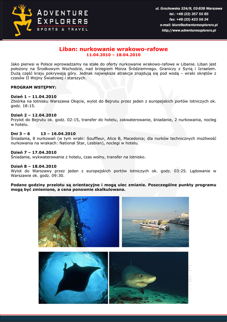 Liban: nurkowanie wrakowo-rafowe 11.04.2010 – 18.04.2010 Jako pierwsi w Polsce wprowadzamy na stałe do oferty nurkowanie wrakowo-rafowe w Libanie. Liban jest połoŜony na Środkowym Wschodzie, nad brzegiem Morza Śródziemnego. Graniczy z Syrią i Izraelem. DuŜą część kraju pokrywają góry. Jednak największe atrakcje znajdują się pod wodą – wraki okrętów z czasów II Wojny Światowej i starszych. PROGRAM WSTĘPNY: Dzień 1 – 11.04.2010 Zbiórka na lotnisku Warszawa Okęcie, wylot do Bejrutu przez jeden z europejskich portów lotniczych ok. godz. 18:15. Dzień 2 – 12.04.2010 Przylot do Bejrutu ok. godz. 02:15, transfer do hotelu, zakwaterowanie, śniadanie, 2 nurkowania, nocleg w hotelu. Dni 3 – 6 13 – 16.04.2010 Śniadania, 8 nurkowań (w tym wraki: Souffleur, Alice B, Macedonia; dla nurków technicznych moŜliwość nurkowania na wrakach: National Star, Lesbian), noclegi w hotelu. Dzień 7 – 17.04.2010 Śniadanie, wykwaterowanie z hotelu, czas wolny, transfer na lotnisko. Dzień 8 – 18.04.2010 Wylot do Warszawy przez jeden z europejskich portów lotniczych ok. godz. 03:25. Lądowanie w Warszawie ok. godz. 09:30. Podane godziny przelotu są orientacyjne i mogą ulec zmianie. Poszczególne punkty programu mogą być zmienione, a cena ponownie skalkulowana. 1 Wraki Morze Śródziemne jest zaśmiecone wrakami statków i okrętów, z których większość dostępna jest jedynie dla nurków technicznych. JednakŜe wybrzeŜe libańskie oferuje kilka z bardzo interesujących wraków leŜących w zasięgu nurków rekreacyjnych. Souffleur – francuska łódź podwodna, która zatonęła podczas II Wojny Światowej naprzeciwko Khalde – leŜy na głębokości 36 metrów. Miała problemy z silnikiem i była zmuszona do naładowania swoich akumulatorów w ciągu dnia. Była łatwym celem dla brytyjskiej łodzi podwodnej Parthian, która trafiła ją torpedą przepoławiając ją. Z 50-ciu marynarzy jedynie 4-ch uszło z Ŝyciem. Brytyjskiej łodzi podwodnej równieŜ się nie udało i zatonęła wracając do domu. Peryskop jest nadal ustawiony w pozycji pełnej gotowości, jak w dniu, kiedy zatonęła. MoŜna takŜe nadal zobaczyć jedną z wielu jej torped osadzoną w kadłubie okrętu. Wiele gatunków ryb i płaszczek traktuje tę łódź podwodną jako swoje sanktuarium. Souffleur, francuska łódź podwodna z czasów II Wojny Światowej Souffleur Submarine Głębokość: 37 m Poziom: Advanced Scuba divers Souffleur Kolejny wrak to wielki frachtowiec w Zatoce Jounieh – Alice B – który zatonął w latach 80-tych podczas libańskiej wojny domowej i leŜy na głębokości 35 metrów. Alice B (cargo ship – okręt cargo) Głębokość: 30 – 38 m Poziom: Advanced Scuba Diver To olbrzymi statek cargo, który zatonął w niewyjaśnionych okolicznościach podczas libańskiej wojny domowej. Jest w świetnym stanie. Nurkowanie zaczyna się na głębokości 30 m i kończy na głębokości 38 m. Wielka dziura przypomina o eksplozji komory z silnikami. Jedną z najciekawszych rzeczy na tym wraku jest jego maszt, który „wystaje” na 18 metrów do góry. Wiele ryb i innych podmorskich stworzonek znalazło tu swój dom. 2 Batroun wreck Głębokość: 35 – 40 m Poziom: Advanced Scuba divers Ten statek wiozący cement zatonął wraz z kapitanem. Miejscowi mówią, Ŝe to jako kara za decyzję wypłynięcia z portu podczas sztormu. Krystalicznie czyste wody to główny atut tego miejsca. Wrak Batrouna jest często widziany z powierzchni wody mimo, Ŝe leŜy na 35 – 40 m. Military barge wreck Głębokość: 18 m Poziom: Scuba divers Po zakończeniu wojny domowej wszystkie statki wojenne miały oddać broń armii krajowej. JednakŜe-i jest to jedyny taki przypadek- niektórzy woleli oddać broń morzu niŜ w libański koszarom. Tym okrętem pamiętającym II Wojnę Światową była wojskowa łódź desantowa (barge – barka), podobna do tych uŜytych w „Dniu D” podczas lądowania w Normandii (D-day). Jest ona osadzona na głębokości ok. 18 m. Jej „drzwi” są nadal otwarte. MoŜna rzucić okiem na skromną maszynownię. Trzeba jednak uwaŜać na olbrzymie płaszczki (stingrays), które tu często odpoczywają. Oil tanker wreck (toro negro) – wrak tankowca Głębokość: 18 – 31 m Poziom: Scuba Diver oraz Advanced Scuba Divers Ten stosunkowo duŜy tankowiec przewoził ogromną ilość artylerii podczas libańskiej wojny domowej. Zatonął blisko linii brzegowej i leŜy teraz na piaszczystym dnie na lewej burcie. Dzięki takiemu połoŜeniu statku moŜna podziwiać wielkie pomieszczenia do przechowywania towaru i drabinki łączące ze sobą pokłady. Oczywiście moŜna tu takŜe spotkać wiele gatunków morskiego Ŝycia, szczególnie płaszczki. Macedonia, frachtowiec z 1962 roku, leŜy na głębokości 16 metrów, natomiast National Star, frachtowiec, który zatonął w 1991 roku w wyniku nabierania wody, leŜy na głębokości 52 metrów. Załoga nawet nie zdąŜyła przygotować łodzi ratunkowych na czas i musiała skakać za burtę, Ŝeby ratować swoje Ŝycie. Lesbian to brytyjski frachtowiec leŜący w stronę portu Bejrutu w nienaruszonym stanie. Zatonął podczas II Wojny Światowej po wysadzeniu przez okręty francuskiej Marynarki Vichy. Do tej pory jedynie kilku technicznych nurków dopłynęło do niego, gdyŜ leŜy on na głębokości 60 metrów. Lesbian, brytyjski frachtowiec The Lesbian Głębokość: 50 – 60 m Poziom: Technical Divers 3 VTB8 Głębokość: 50 – 60 m Poziom: Technical Divers Francuski torpedowiec zatonął podczas II Wojny Światowej. LeŜy na głębokości 60 m i nadal ma torpedy na swoim pokładzie. Shark Point (Beirut) Głębokość: 27 – 60 m Poziom: Advanced Scuba divers do Technical Divers Jeśli jesteście zainteresowani rekinami, to jest to idealne miejsce. Początek tej rafy jest na głębokości 23 m i powoli schodzi do 60 m. Shark point cechuje się tym, Ŝe znajduje się tu wiele statuetek świętych zatopio