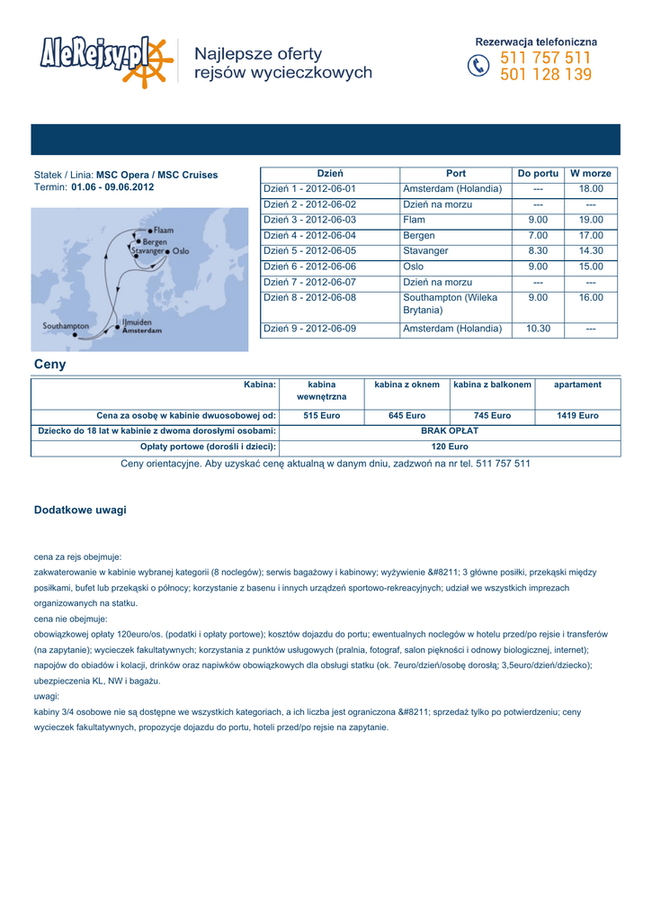 Statek / Linia: MSC Opera / MSC Cruises Termin: 01.06 - 09.06.2012 Dzień Port Do portu W morze --- 18.00 Dzień 1 - 2012-06-01 Amsterdam (Holandia) Dzień 2 - 2012-06-02 Dzień na morzu --- --- Dzień 3 - 2012-06-03 Flam 9.00 19.00 Dzień 4 - 2012-06-04 Bergen 7.00 17.00 Dzień 5 - 2012-06-05 Stavanger 8.30 14.30 Dzień 6 - 2012-06-06 Oslo 9.00 15.00 Dzień 7 - 2012-06-07 Dzień na morzu --- --- Dzień 8 - 2012-06-08 Southampton (Wileka Brytania) 9.00 16.00 Dzień 9 - 2012-06-09 Amsterdam (Holandia) 10.30 --- Ceny Kabina: Cena za osobę w kabinie dwuosobowej od: kabina wewnętrzna kabina z oknem kabina z balkonem apartament 515 Euro 645 Euro 745 Euro 1419 Euro Dziecko do 18 lat w kabinie z dwoma dorosłymi osobami: Opłaty portowe (dorośli i dzieci): BRAK OPŁAT 120 Euro Ceny orientacyjne. Aby uzyskać cenę aktualną w danym dniu, zadzwoń na nr tel. 511 757 511 Dodatkowe uwagi cena za rejs obejmuje: zakwaterowanie w kabinie wybranej kategorii (8 noclegów); serwis bagażowy i kabinowy; wyżywienie – 3 główne posiłki, przekąski między posiłkami, bufet lub przekąski o północy; korzystanie z basenu i innych urządzeń sportowo-rekreacyjnych; udział we wszystkich imprezach organizowanych na statku. cena nie obejmuje: obowiązkowej opłaty 120euro/os. (podatki i opłaty portowe); kosztów dojazdu do portu; ewentualnych noclegów w hotelu przed/po rejsie i transferów (na zapytanie); wycieczek fakultatywnych; korzystania z punktów usługowych (pralnia, fotograf, salon piękności i odnowy biologicznej, internet); napojów do obiadów i kolacji, drinków oraz napiwków obowiązkowych dla obsługi statku (ok. 7euro/dzień/osobę dorosłą; 3,5euro/dzień/dziecko); ubezpieczenia KL, NW i bagażu. uwagi: kabiny 3/4 osobowe nie są dostępne we wszystkich kategoriach, a ich liczba jest ograniczona – sprzedaż tylko po potwierdzeniu; ceny wycieczek fakultatywnych, propozycje dojazdu do portu, hoteli przed/po rejsie na zapytanie. MSC Opera MSC Opera Tonaż: 58.600 ton, Rok budowy: 2004 Długość: 251 m, Szerokość: 28,8 m Szybkość: 21 węzłów Pokłady pasażerskie: 8, Załoga: 750, Pasażerowie: 2.180 Do dyspozycji: 2 restauracje, bary, pizzeria, grill, kasyno, dyskoteka, sala widowiskowa, trasa do joggingu, salon piękności i masażu, fitness center, sauna, jacuzzi, pokój zabaw dla dzieci, punkt medyczny, biblioteka, kawiarenka internetowa, sala gier video, butiki, centrum konferencyjne. Kabiny: łazienka (prysznic, wc, suszarka), klimatyzacja, radio pokładowe, telefon do użytku wewnętrznego, sejf, mini bar, TV (ok. 13 m2). W wielu kabinach 2 pojedyncze łóżka mogą być na zmówienie połączone w 1 podwójne. Kabiny typu suite podzielone są na część sypialną i dzienną (ok. 22m2). Elegancki statek oferujący wszystko co tylko możesz sobie wyobrazić oraz osobowość która natychmiast przykuje Twoją uwagę to właśnie MSC Opera, statek na którym MSC Cruises skupiło całe doświadczenie w dziedzinie nawigacji i życia pokładowego 856 kabin, wiele z prywatnymi balkonami, każda z nich jest duża i przestrzenna. Jeśli chodzi o publicznie dostępne pomieszczenia, uwagę przykuwa szczególnie recepcja z pięknymi marmurowymi podłogami oraz ogromnymi oknami skierowanymi prosto w stronę morza. Jego wysublimowane kształty i delikatne kolory, czerpiące inspirację z Art Deco, oferują gościom delikatny i unikalny zarazem wystrój.