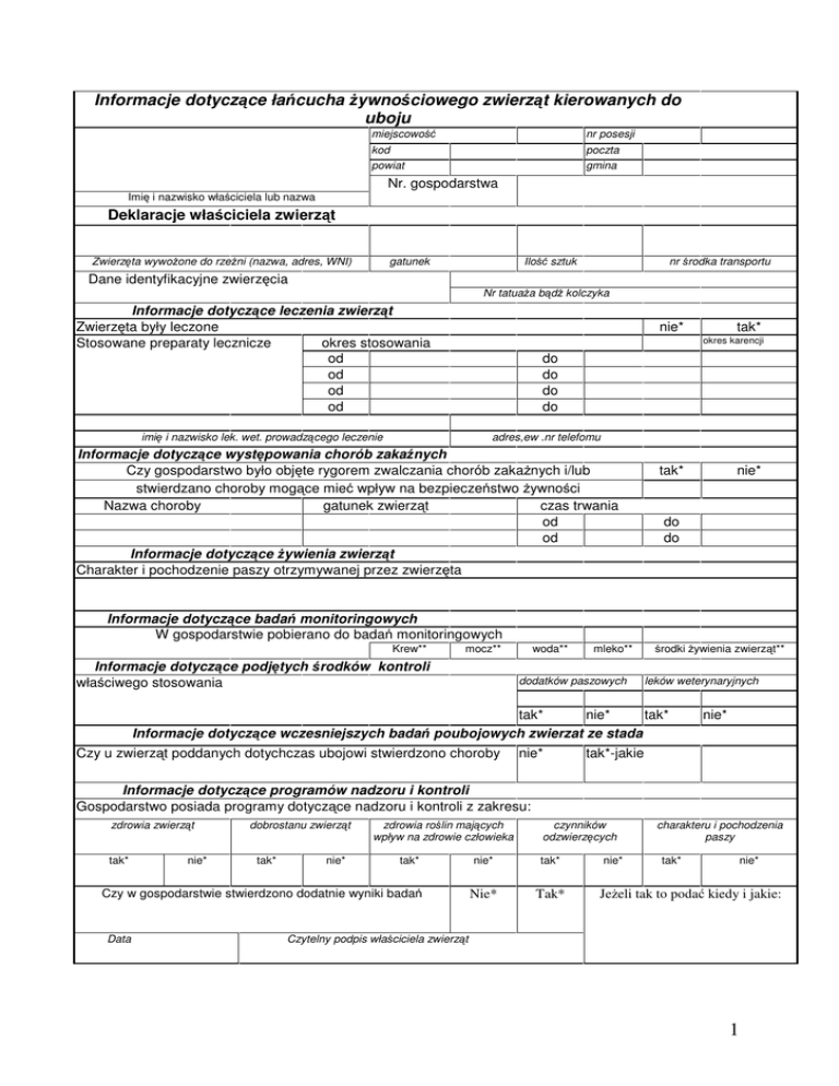 Informacje dotyczące łańcucha żywnościowego zwierząt kierowanych do uboju miejscowość nr posesji kod poczta powiat gmina Nr. gospodarstwa Imię i nazwisko właściciela lub nazwa Deklaracje właściciela zwierząt Zwierzęta wywożone do rzeźni (nazwa, adres, WNI) gatunek Ilość sztuk nr środka transportu Dane identyfikacyjne zwierzęcia Nr tatuaża bądż kolczyka Informacje dotyczące leczenia zwierząt Zwierzęta były leczone Stosowane preparaty lecznicze okres stosowania od od od od nie* tak* okres karencji do do do do imię i nazwisko lek. wet. prowadzącego leczenie adres,ew .nr telefomu Informacje dotyczące występowania chorób zakaźnych Czy gospodarstwo było objęte rygorem zwalczania chorób zakażnych i/lub stwierdzano choroby mogące mieć wpływ na bezpieczeństwo żywności Nazwa choroby gatunek zwierząt czas trwania od od Informacje dotyczące żywienia zwierząt Charakter i pochodzenie paszy otrzymywanej przez zwierzęta tak* nie* do do Informacje dotyczące badań monitoringowych W gospodarstwie pobierano do badań monitoringowych Krew** mocz** Informacje dotyczące podjętych środków kontroli właściwego stosowania woda** mleko** dodatków paszowych środki żywienia zwierząt** leków weterynaryjnych tak* nie* tak* Informacje dotyczące wczesniejszych badań poubojowych zwierzat ze stada Czy u zwierząt poddanych dotychczas ubojowi stwierdzono choroby nie* nie* tak*-jakie Informacje dotyczące programów nadzoru i kontroli Gospodarstwo posiada programy dotyczące nadzoru i kontroli z zakresu: zdrowia zwierząt tak* nie* dobrostanu zwierząt tak* nie* zdrowia roślin mających wpływ na zdrowie człowieka tak* Czy w gospodarstwie stwierdzono dodatnie wyniki badań Data czynników odzwierzęcych nie* tak* Nie* Tak* nie* charakteru i pochodzenia paszy tak* nie* Jeżeli tak to podać kiedy i jakie: Czytelny podpis właściciela zwierząt 1 Wypełnia zakład uboju zwierząt data data uboju dostarczeni a do uboju * Niepotrzebne skreślić ** Dla właściwej odpowiedzi skreślić X ilość sztuk dostarczonych do uboju podpis osoby przyjmującej zwierzęta do uboju Inne istotne informacje które mogłyby mieć wpływ na jakoś mięsa, a nie zostały wymienione proszę opisać poniżej Wypełnia urzędowy lekarz weterynarii Badanie przedubojowe Dobrostan liczba zwierząt u których stwierdzono zmiany stwierdzone zmiany (np.rany, gryzienie ogonów) Czystość zwierząt Ustalenia liczba chorych zwierząt kliniczne uwagi data inspekcji Wyniki badań laboratoryjnych *(2) Badanie poubojowe badanie liczba zwierząt ze zmianami makroskop owe konfiskata tusze wątroba płuca, serca jelita Przyczyna rodzaj konfiskaty zmian liczba zwierząt konfiskata /organy/ części tuszy(podać przyczyny) data uboju Wyniki badań laboratoryjnych**(2) Inne wyniki (pasożyty ciała obce) Ustalenia dotyczące dobrostanu (np.złamania) Urzędowy lekarz weterynarii Imię i nazwisko (drukowane litery) pieczęć Data *Dołączyć osobny wykaz **Załączyć wynik badań: mikrobiologicznych, chemicznych, serologicznych 2