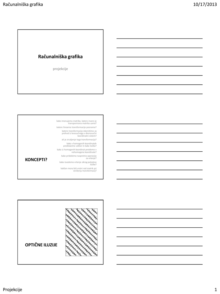 Računalniška grafika 10/17/2013 Računalniška grafika projekcije kako imenujemo matriko, katere inverz je transponirana matrika sama? katere linearne transformacije poznamo? katero transformacijo izkoristimo za prehod iz levosučnega v desnosučni koordinatni sistem? ali je zrcaljenje toga transformacija? kako v homogenih koordinatah predstavimo vektor in kako točko? kako iz homogenih koordinat preidemo v nehomogene koordinate? KONCEPTI? kako pridobimo nasprotno operacijo za vrtenje? kako izvedemo vrtenje okrog poljubne točke? kakšen mora biti vrstni red matrik pri veriženju transformacij? OPTIČNE ILUZIJE Projekcije 1 Računalniška grafika 10/17/2013 optične iluzije perspektiva 3D street art the crevasse PROJEKCIJE Projekcije 2 Računalniška grafika 10/17/2013 projekcije vzporedne pravokotne od zgoraj čelna stranska projekcije vzporedne pravokotne aksonometrične trimetrične dimetrične izometrične 0,9:0,5:1 α≠β≠γ 1:0,5:1 α=β≠γ 1:1:1 α=β=γ projekcije vzporedne pravokotne aksonometrične poševne kavalirska kabinetna Projekcije 3 Računalniška grafika 10/17/2013 projekcije perspektivne enobežna dvobežna tribežna model transformacija modela in pogleda izračun osvetlitve projekcija GRAFIČNI CEVOVOD rasterizacija in prekrivanje slika Projekcije 4 Računalniška grafika 10/17/2013 model grafični cevovod geometrija točke, ki določajo oglišča povezave točk v večkotnike lastnosti (barva, koordinate teksture, normala) teksture, luči, kamera, … sekvenčni vstop v cevovod koordinatni sistem predmeta transformacija modela in pogleda izračun osvetlitve projekcija rasterizacija in prekrivanje slika model grafični cevovod koordinatni sistem sveta koordinatni sistem pogleda prehod v koordinate pogleda transformacija modela in pogleda izračun osvetlitve projekcija rasterizacija in prekrivanje slika model grafični cevovod sprehod čez vse deklarirane luči osvetlitev za vsako oglišče transformacija modela in pogleda izračun osvetlitve projekcija rasterizacija in prekrivanje slika Projekcije 5 Računalniška grafika 10/17/2013 model grafični cevovod prehod iz 3D koordinat v 2D transformacija modela in pogleda izračun osvetlitve projekcija rasterizacija in prekrivanje slika model grafični cevovod izris primitivov ugotavljanje vidnosti transformacija modela in pogleda izračun osvetlitve projekcija rasterizacija in prekrivanje slika KOORDINATNI SISTEMI Projekcije 6 Računalniška grafika 10/17/2013 koordinatni sistemi predmet p object koordinatni sistemi svet p world Mpobject predmet svet M koordinatni sistemi pogled p world Mpobject pogled svet Projekcije C svet pogled C 1 predmet pogled p camera C 1 Mpobject 7 Računalniška grafika 10/17/2013 koordinatni sistemi pogled v up w e u f w ef ef u up w up w v wu C u v w e projekcija perspektivna v w e u p p projekcija vzporedna v w u p p Projekcije 8 Računalniška grafika 10/17/2013 PROJEKCIJSKA TRANSFORMACIJA projekcijska transformacija vzporedna pravokotna projekcija p p projekcijska transformacija perspektivna projekcija poenostavljen primer p p e Projekcije 9 Računalniška grafika 10/17/2013 projekcijska transformacija perspektivna projekcija poenostavljen primer pz d p p py py e projekcijska transformacija perspektivna projekcija poenostavljen primer pz d p p py py e p y d py pz , px p x d pz projekcijska transformacija perspektivna projekcija poenostavljen primer pz d p py p py e px Projekcije pd px d , p y y , pz pz pz d 10 Računalniška grafika 10/17/2013 projekcijska transformacija perspektivna projekcija poenostavljen primer 1 0 0 0 0 p x p x 0 p y p y 0 1 0 p z p z 0 1 d 0 1 p z d 0 0 1 0 p x d pz p d p z y d 1 projekcijska transformacija perspektivna projekcija poenostavljen primer 1 0 0 0 0 0 1 0 0 1 0 1 d 0 p x 0 p y 0 pz 0 1 pz pz d px py p x d pz p d p z y d 1 realizem fokus in globinska ostrina Projekcije 11 Računalniška grafika 10/17/2013 realizem ribje oko realizem kromatska aberacija realizem zaslonka Projekcije 12 Računalniška grafika 10/17/2013 VIDNO POLJE vidno polje terminologija vidno polje perspektivna projekcija prirezana piramida gledanja zgornji rob levi rob v w e u spredaj zadaj desni rob spodnji rob Projekcije 13 Računalniška grafika 10/17/2013 vidno polje perspektivna projekcija simetrična prirezana piramida gledanja razmerje stranic širina:višina v w e u vertikalni zorni kot spredaj zadaj vidno polje vzporedna projekcija paralelepiped gledanja zgornji rob levi rob v w u zadaj spredaj spodnji rob desni rob izločanje in OBREZOVANJE Projekcije 14 Računalniška grafika 10/17/2013 obrezovanje normalizirane koordinate r t f f l b n v r t n v w w l b n e u e u 1 1 1 y z x 1 1 1 PROJEKCIJSKA MATRIKA projekcijska matrika perspektivna projekcija prirezana piramida gledanja 2 n r l 0 Pp l , r , t , b, n, f 0 0 Projekcije 0 2n t b 0 0 r l r l t b t b f n f n 1 0 2n f f n 0 0 15 Računalniška grafika 10/17/2013 projekcijska matrika perspektivna projekcija simetrična prirezana piramida gledanja 1 a tan 2 0 Pp , a, n, f 0 0 0 0 1 tan 2 0 0 f n f n 1 0 0 2 t b 0 0 0 2n f f n 0 0 projekcijska matrika pravokotna projekcija 2 r l 0 Po l , r , t , b, n, f 0 0 0 0 r l r l t b t b f n f n 1 2 f n 0 projekcijska matrika pravokotna projekcija simetrična 2 w 0 Po w, h, n, f 0 0 Projekcije 0 0 2 h 0 0 0 2 f n 0 0 f n f n 1 0 16 Računalniška grafika 10/17/2013 projekcijska matrika poševna projekcija zamik sveta z uporabo striženja pravokotna projekcija 1 0 P Po H , Po 0 0 0 cot 1 cot 0 1 0 0 0 0 0 1 matrika naprave transformacija v koordinate naprave x1 2 x0 0 Dx 0 , x 1 , y 0 , y 1 0 0 0 0 y1 y 0 2 0 0 1 2 0 0 1 2 1 x 0 x1 2 y0 y1 2 transformacijska veriga matrika modela matrika kamere projekcijska matrika matrika naprave p DPC1 Mp koordinatni sistem predmeta koordinatni sistem sveta koordinatni sistem pogleda normaliziran koordinatni sistem koordinatni sistem naprave Projekcije 17 Računalniška grafika 10/17/2013 transformacijska veriga matrika modela matrika kamere projekcijsk
