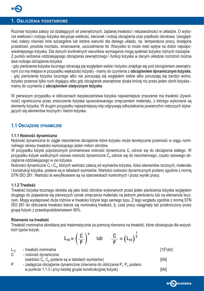 1. O BLICZENIA PODSTAWOWE Rozmiar łożyska zależy od działających sił zewnętrznych, żądanej trwałości i niezawodności w układzie. O wyborze wielkości i rodzaju łożyska decyduje wielkość, kierunek i rodzaj obciążenia oraz prędkość obrotowa. Uwzględniać należy również inne szczególne lub istotne warunki dla danego układu, np. temperatura pracy, dostępna przestrzeń, prostota montażu, smarowanie, uszczelnienie itd. Wszystko to może mieć wpływ na dobór najodpowiedniejszego łożyska. Dla danych konkretnych warunków wymagania mogą spełniać łożyska różnych rodzajów. Z punktu widzenia oddziałującego obciążenia zewnętrznego i funkcji łożyska w danym układzie rozróżnić można dwa rodzaje obciążenia łożyska: - gdy pierścienie łożyska tocznego obracają się względem siebie i łożysko znajduje się pod obciążeniem zewnętrznym (co ma miejsce w przypadku większości łożysk) - mamy do czynienia z obciążeniem dynamicznym łożyska, - gdy pierścienie łożyska tocznego albo nie poruszają się względem siebie albo poruszają się bardzo wolno, łożysko przenosi tylko ruch drgający albo gdy obciążenie zewnętrzne działa krócej niz przez jeden obrót łożyska mamy do czynienia z obciążeniem statycznym łożyska. W pierwszym przypadku w obliczeniach bezpieczeństwa łożyska najważniejsze znaczenie ma trwałość (żywotność) ograniczona przez zniszczenie łożyska spowodowanego zmęczeniem materiału, z którego wykonane są elementy łożyska. W drugim przypadku najważniejszą rolę odgrywają odkształcenia powierzchni roboczych stykających się elementów tocznych i bieżni łożyska. 1.1 OBCIĄŻENIE DYNAMICZNE 1.1.1 Nośność dynamiczna Nośność dynamiczna to ciągłe niezmienne obciążenie które łożysko może teoretycznie przenosić w ciągu nominalnego okresu trwałości wynoszącego jeden milion obrotów. W przypadku łożysk poprzecznych promieniowa nośność dynamiczna Cr odnosi się do obciążenia stałego. W przypadku łożysk wzdłużnych osiowa nośność dynamiczna Ca odnosi się do niezmiennego, czysto osiowego obciążenia oddziałującego w osi łożyska. Nośności dynamiczne Cr i Ca, których wartości zalezą od wymiarów łożyska, ilości elementów tocznych, materiału i konstrukcji łożyska, podane są w tabelach wymiarów. Wartości nośności dynamicznych podano zgodnie z normą STN ISO 281. Wartości te weryfikowane są na stanowiskach kontrolnych i przez wyniki pracy. 1.1.2 Trwałość Trwałość łożyska tocznego określa się jako ilość obrotów wykonanych przez jeden pierścienia łożyska względem drugiego do pojawienia się pierwszych oznak zmęczenia materiału na jednym pierścieniu lub na elemencie tocznym. Mogą występować duże różnice w trwałości łożysk tego samego typu. Z tego względu zgodnie z normą STN ISO 281 do obliczania trwałości bierze się nominalną trwałość, tj. czas pracy osiągnięty lub przekroczony przez grupę łożysk z prawdopodobieństwem 90%. Równanie na trwałość Trwałość nominalna określana jest matematycznie za pomocą równania na trwałość, które obowiązuje dla wszystkich typów łożysk. L10 = L10 C P 冸 冹 C P 1 p lub p C = 冸 L10 冹 P - trwałość nominalna - nośność dynamiczna (wartości Cr, Ca podane są w tabelach wymiarów) - zastępcze obciążenie dynamiczne (równania do obliczania Pr, Pa podano w punkcie 1.1.3 i przy każdej grupie konstrukcyjnej łożysk) [106obr] [kN] [kN] p - wykładnik: dla łożysk kulkowych dla łożysk walcowych, igiełkowych, stożkowych i baryłkowych p=3 p = 10 / 3 Tabela 1 przedstawia zależność trwałości L10 w milionach obrotów od odpowiedniego ilorazu C/P. Jeśli prędkość obrotowa się nie zmienia, nominalną trwałość wyrażoną w godzinach pracy można obliczyć ze wzoru: L10h = L10h n - trwałość nominalna - prędkość obrotowa 冸 冹 C P p 6 . 10 60.n [h] -1 [min ] Zależność C/P od trwałości nominalnej L10h i od prędkości obrotowej przedstawiono w Tabeli 2 dla łożysk kulkowych i w Tabeli 3 dla łożysk walcowych, igiełkowych, stożkowych i baryłkowych. Trwałość L10 106 0,5 0,75 1 1,5 2 3 4 5 6 8 10 12 14 16 18 20 25 30 35 40 45 50 60 70 80 90 100 120 140 Zależność C/P od trwałości L10h Tab. 1 Dla łożysk kulkowych Dla łożysk walcowych, igiełkowych, stożkowych, baryłkowych Trwałość Trwałość Trwałość C/P C/P C/P C/P L10 L10 L10 6 6 6 obr. 10 obr. 10 obr. 10 obr. 0,793 600 8,43 0,5 0,812 600 6,81 0,909 650 8,66 0,75 0,917 650 6,98 1 700 8,88 1 1 700 7,14 1,14 750 9,09 1,5 1,13 750 7,29 1,26 800 9,28 2 1,24 800 7,43 1,44 850 9,47 3 1,39 850 7,56 1,59 900 9,65 4 1,52 900 7,70 1,71 950 9,83 5 1,62 950 7,82 1,82 1000 10 6 1,71 1000 7,94 2 1100 10,3 8 1,87 1100 8,17 2,15 1200 10,6 10 2 1200 8,39 2,29 1300 10,9 12 2,11 1300 8,59 2,41 1400 11,2 14 2,21 1400 8,79 2,52 1500 11,4 16 2,30 1500 8,97 2,62 1600 11,7 18 2,38 1600 9,15 2,71 1700 11,9 20 2,46 1700 9,31 2,92 1800 12,2 25 2,63 1800 9,48 3,11 1900 12,4 30 2,77 1900 9,63 3,27 2000 12,6 35 2,91 2000 9,78 3,42 2200 13 40 3,02 2200 10,1 3,56 2400 13,4 45 3,13 2400 10,3 3,68 2600 13,8 50 3,23 2600 10,6 3,91 2800 14,1 60 3,42 2800 10,8 4,12 3000 14,4 70 3,58 3000 11 4,31 3500 15,2 80 3,72 3500 11,5 4,48 4000 15,9 90 3,86 4000 12 4,64 4500 16,5 100 3,98 4500 12,5 4,93 5000 17,1 120 4,20 5000 12,9 5,19 5500 17,7 140 4,40 5500 13,2 Zależność C/P od trwałości L10h Tab. 1 Dla łożysk kulkowych Dla łożysk walcowych, igiełkowych, stożkowych, baryłkowych Trwałość Trwałość Trwałość C/P C/P C/P C/P L10 L10 L10 6 6 6 obr. 10 obr. 10 obr. 10 obr. 5,43 6000 18,2 160 4,58 6000 13,6 5,65 7000 19,1 180 4,75 7000 14,2 5,85 8000 20 200 4,90 8000 14,8 6,30 9000 20,8 250 5,24 9000 15,4 6,69 10000 21,5 300 5,54 10000 15,8 7,05 12500 23,2 350 5,80 12500 16,9 7,37 15000 24,7 400 6,03 15000 17,9 7,66 17500 26 450 6,25 17500 18,7 7,94 20000 27,1 500 6,45 20000 19,5 8,19 25000 29,2 5